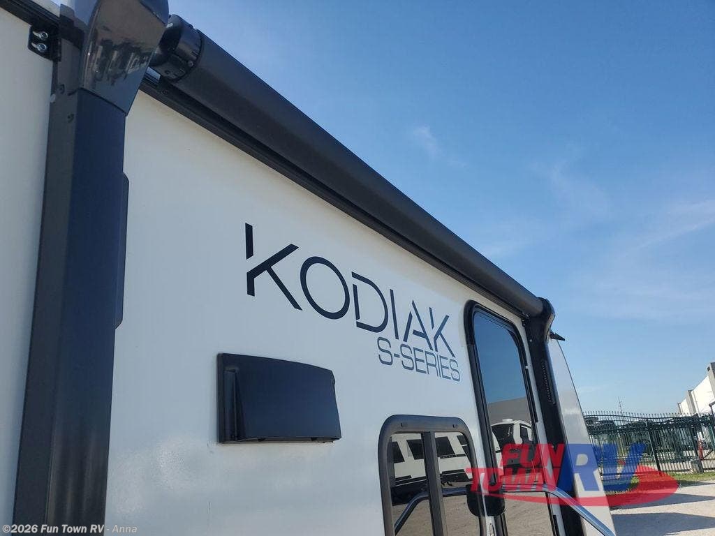 Each Kodiak travel trailer by Dutchmen includes a diamond front plate, easy lube axles, and a power tongue jack for hassle-free towing. The bear cave storage will allow you to bring along all the camp gear, and the power awning with an LED light will create an inviting outdoor space. Head inside to enjoy the designer valances, blackout roller shades, and seamless countertops. There is also HyperDeck flooring that will withstand your many adventures plus a 6' 8" interior height for more head room. A high output furnace and 13.5k BTU A/C will keep you comfortable, and the on-demand tankless water heater will provide instant hot water when you need it!