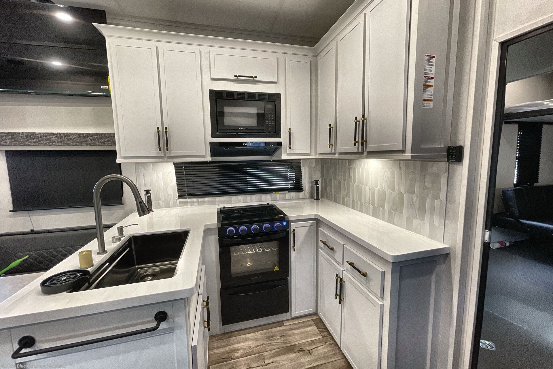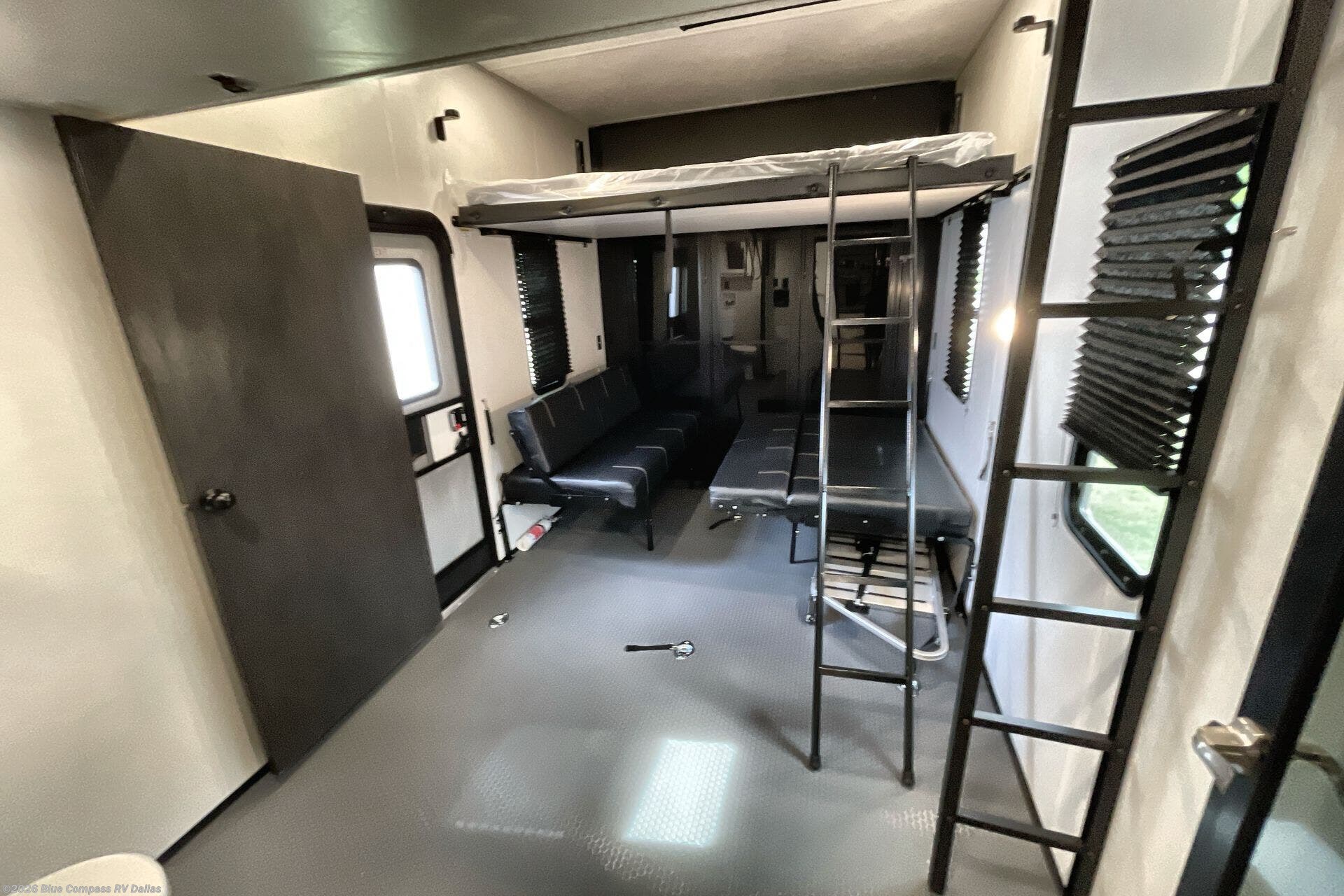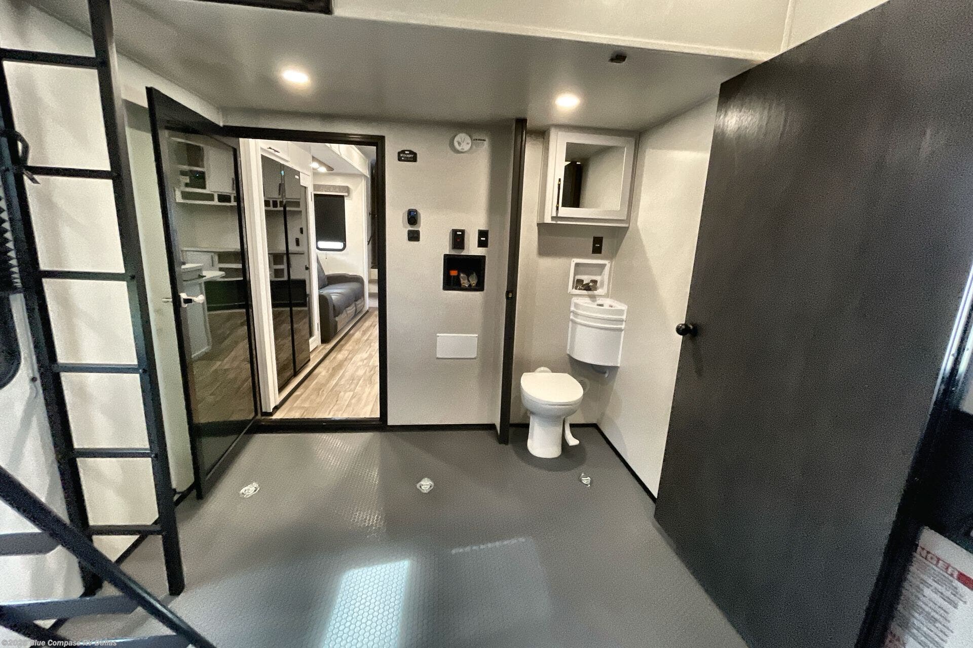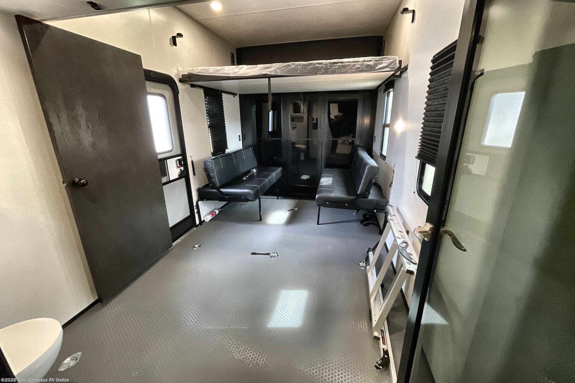 Load up your favorite off-road toys, grab a few friends and head out for a weekend of fun! This Voltage V-Series features a 14' garage with sleeping for seven or eight with the Bed Lift System over the dual sofas and dinette which convert to more sleeping in the garage area, a loft, and private front bedroom with queen bed. The main combined kitchen and living space features a reclining sofa with foot rest housed in the large slide that also includes a 16 cu. ft. 12V refrigerator and pantry for all of your food storage needs. There are full kitchen and bath amenities to keep you fueled and clean, and you will also enjoy the 40" TV and fireplace when relaxing inside. A 21' awning offers additional living space outside, and there is a Pac & Stack half bath in the garage for added convenience when coming in from a ride located beneath the loft. This unit also offers ample storage with a full pass-through compartment outside, and inside cabinets, pantry storage, plus wardrobe, dresser, and under bed storage as well.