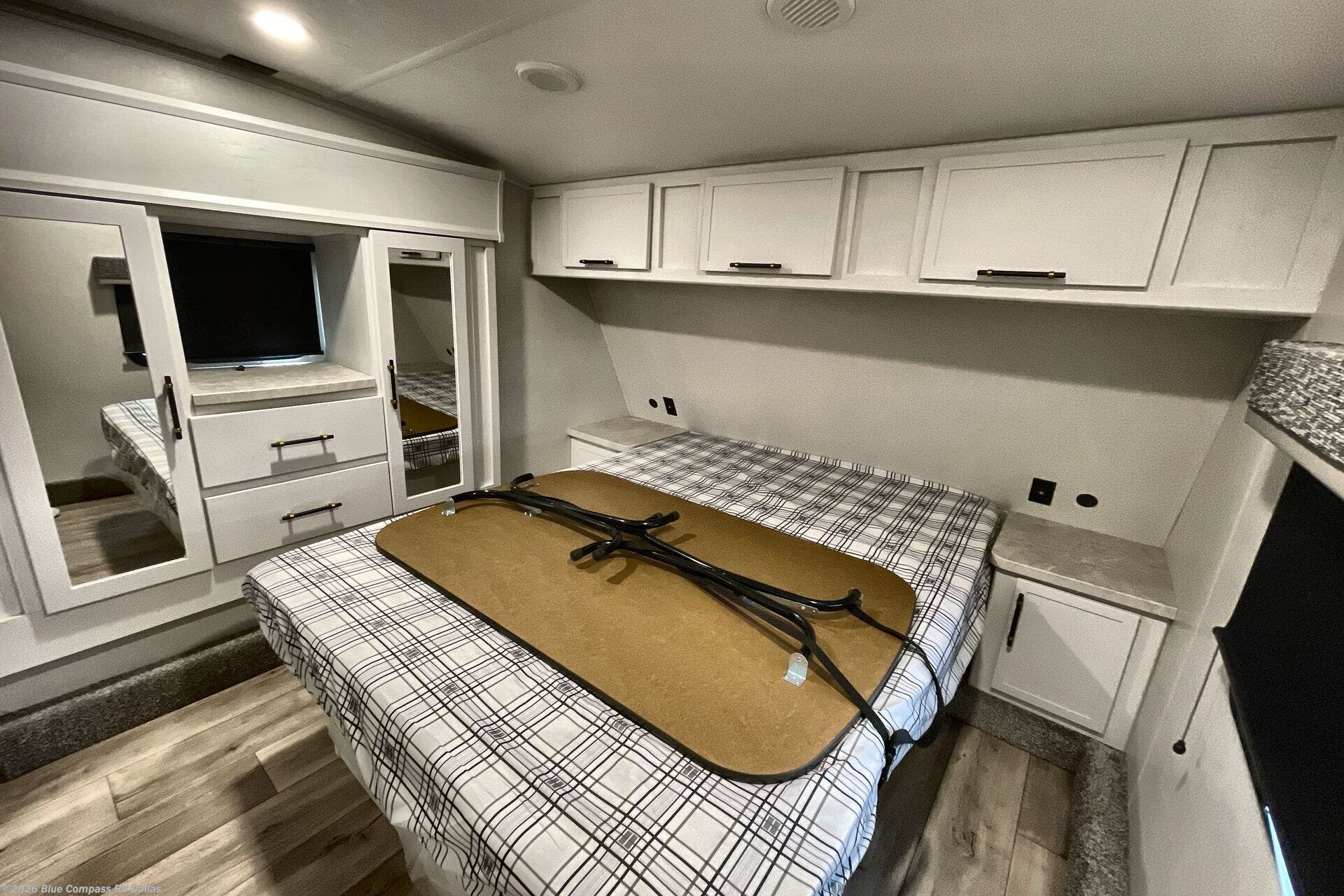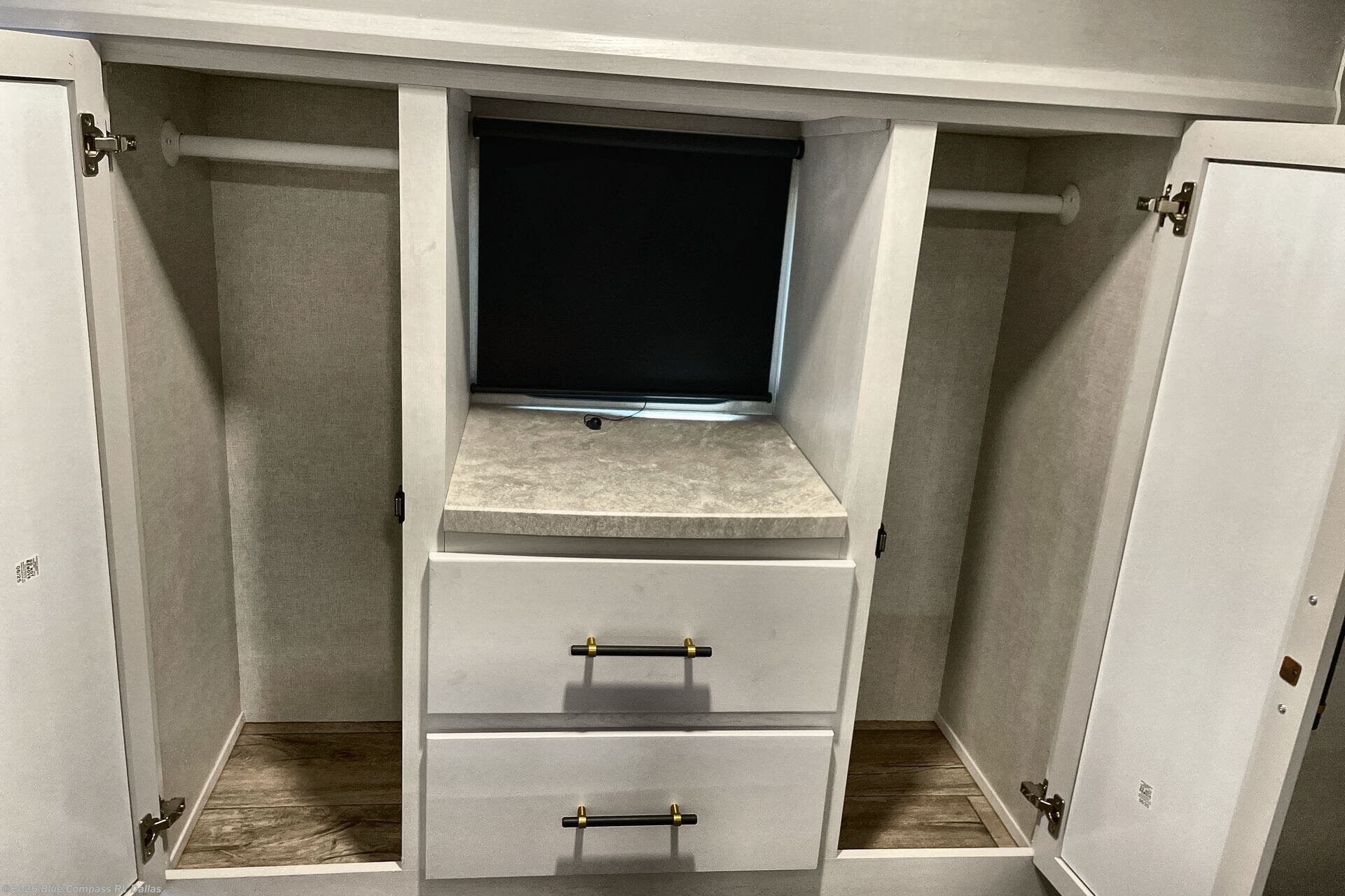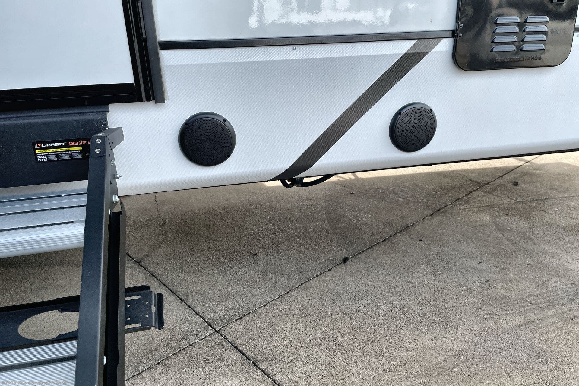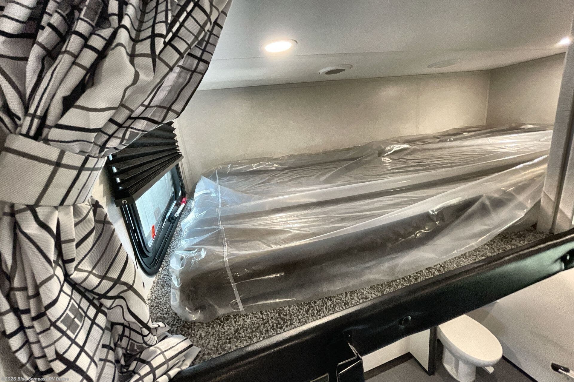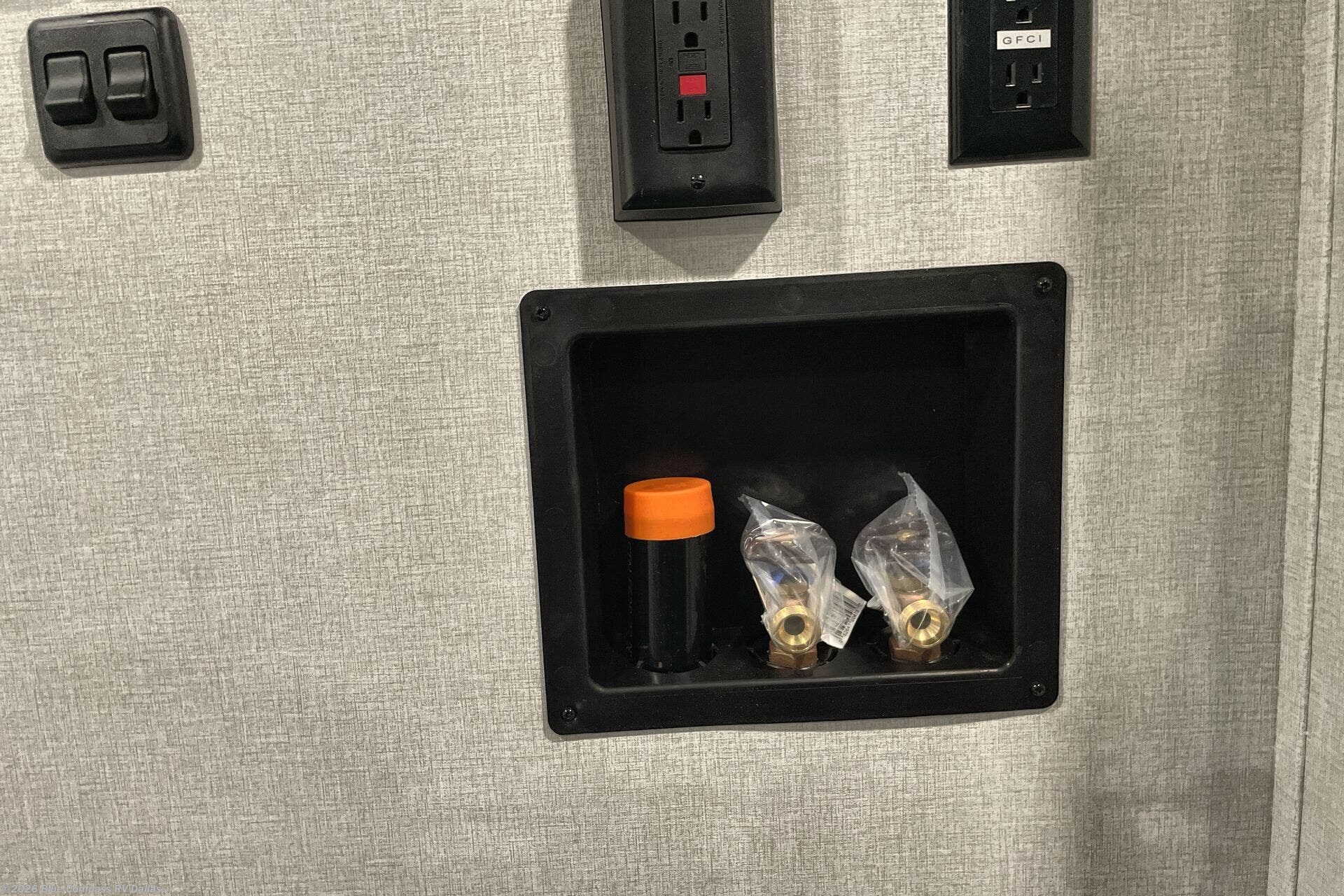 Load up your favorite off-road toys, grab a few friends and head out for a weekend of fun! This Voltage V-Series features a 14' garage with sleeping for seven or eight with the Bed Lift System over the dual sofas and dinette which convert to more sleeping in the garage area, a loft, and private front bedroom with queen bed. The main combined kitchen and living space features a reclining sofa with foot rest housed in the large slide that also includes a 16 cu. ft. 12V refrigerator and pantry for all of your food storage needs. There are full kitchen and bath amenities to keep you fueled and clean, and you will also enjoy the 40" TV and fireplace when relaxing inside. A 21' awning offers additional living space outside, and there is a Pac & Stack half bath in the garage for added convenience when coming in from a ride located beneath the loft. This unit also offers ample storage with a full pass-through compartment outside, and inside cabinets, pantry storage, plus wardrobe, dresser, and under bed storage as well.