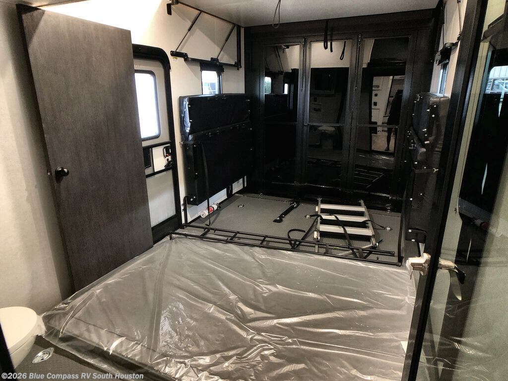 Load up your favorite off-road toys, grab a few friends and head out for a weekend of fun! This Voltage V-Series features a 14' garage with sleeping for seven or eight with the Bed Lift System over the dual sofas and dinette which convert to more sleeping in the garage area, a loft, and private front bedroom with queen bed. The main combined kitchen and living space features a reclining sofa with foot rest housed in the large slide that also includes a 16 cu. ft. 12V refrigerator and pantry for all of your food storage needs. There are full kitchen and bath amenities to keep you fueled and clean, and you will also enjoy the 40" TV and fireplace when relaxing inside. A 21' awning offers additional living space outside, and there is a Pac & Stack half bath in the garage for added convenience when coming in from a ride located beneath the loft. This unit also offers ample storage with a full pass-through compartment outside, and inside cabinets, pantry storage, plus wardrobe, dresser, and under bed storage as well.