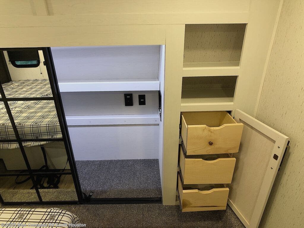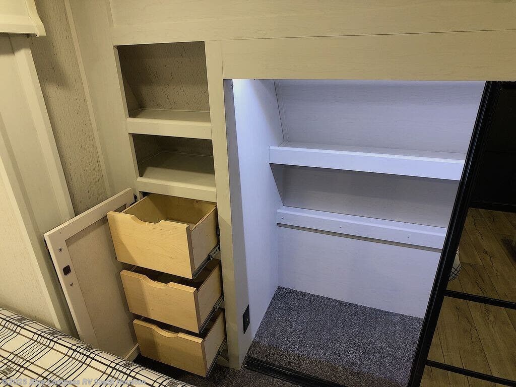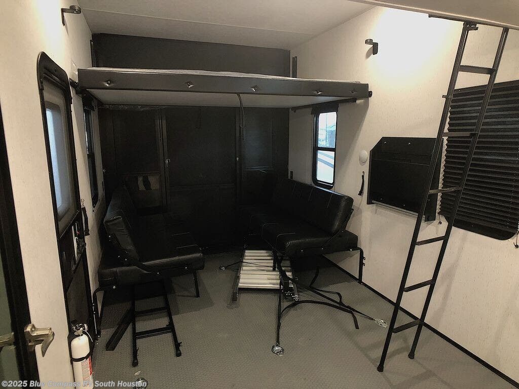 This toy hauler includes dual entry doors for a smooth flow of traffic, a bath and a half for hassle-free camping, plus a 14' separate garage for your favorite toys! The garage also includes a bed lift system and lay-flat Happi Jack seating plus a loft bed for more sleeping space. You'll find your own space up front in the private bedroom, complete with a king bed slide out and a large front closet to keep your things organized. And the full bath with a walk-in shower is close by for easy nighttime use! Everyone can meet in the middle kitchen and living room to enjoy the reclining sofa with a footrest and 50" TV while the chef whips up dinner on the three burner cooktop! There is also a kitchen island for more counter space plus a pantry and 16 cu. ft. 12V refrigerator for food storage!