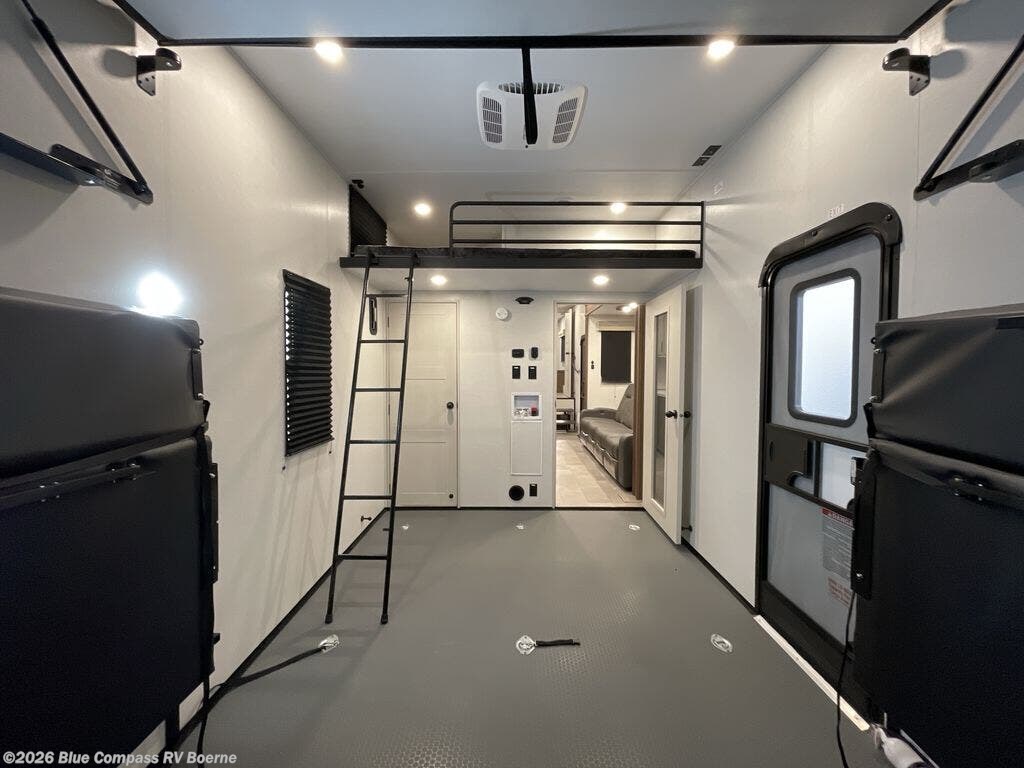 This toy hauler includes dual entry doors for a smooth flow of traffic, a bath and a half for hassle-free camping, plus a 14' separate garage for your favorite toys! The garage also includes a bed lift system and lay-flat Happi Jack seating plus a loft bed for more sleeping space. You'll find your own space up front in the private bedroom, complete with a king bed slide out and a large front closet to keep your things organized. And the full bath with a walk-in shower is close by for easy nighttime use! Everyone can meet in the middle kitchen and living room to enjoy the reclining sofa with a footrest and 50" TV while the chef whips up dinner on the three burner cooktop! There is also a kitchen island for more counter space plus a pantry and 16 cu. ft. 12V refrigerator for food storage!