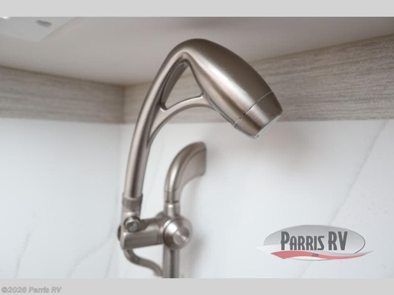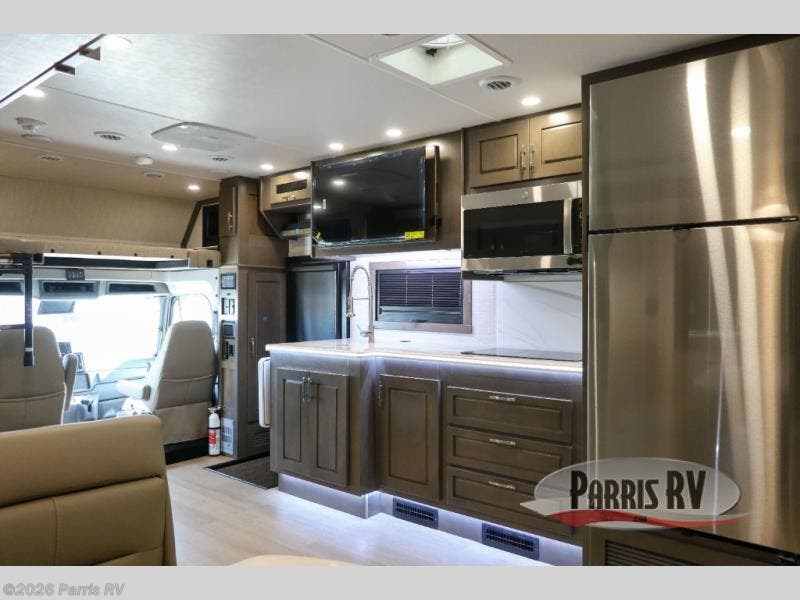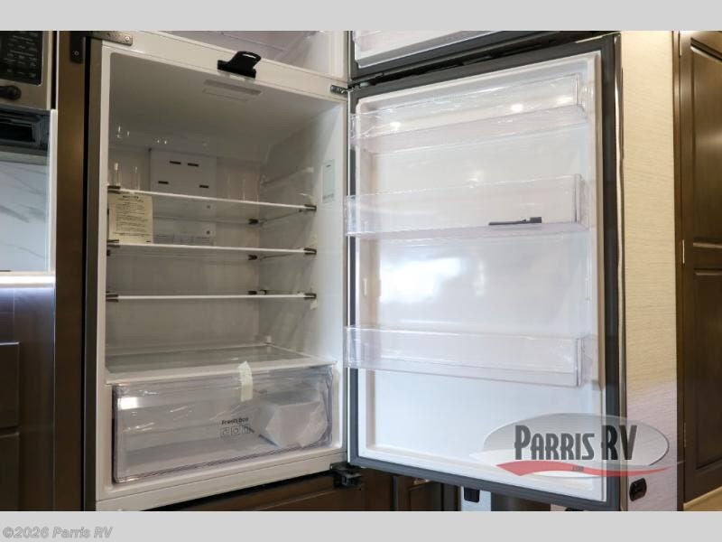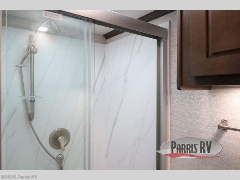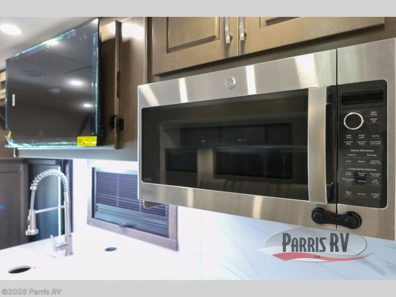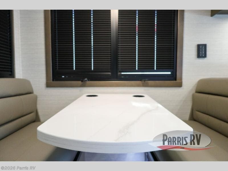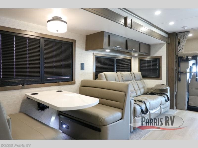 Check out the fabulous features found in this DX3 Super C diesel motorhome! As you spend your nights relaxing in the rear private bedroom, you will appreciate having a 32" LED Smart TV to watch before drifting off to sleep. The Solid Surface Shower Surround with glass door and skylight will be wonderful to see in the morning, and the Oxygenics Body Spa shower head will deliver an enjoyable experience. Step foot into the kitchen and be amazed by the home-like conveniences that have been included, like the residential refrigerator, the convection microwave, the pantry, and the under-cabinet lighting.