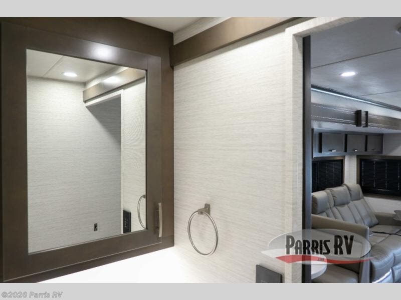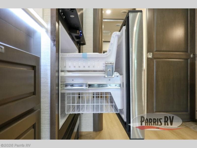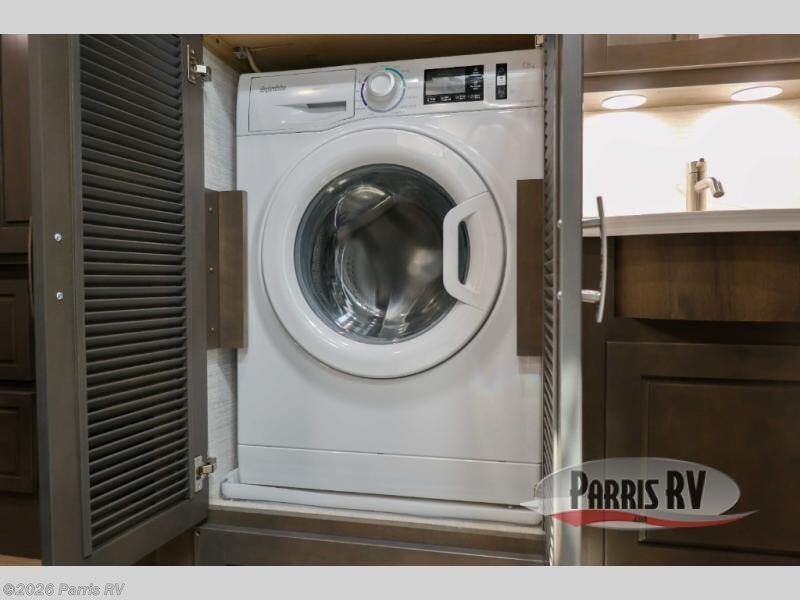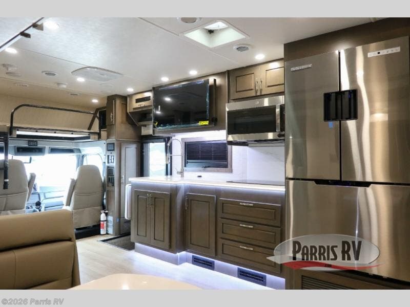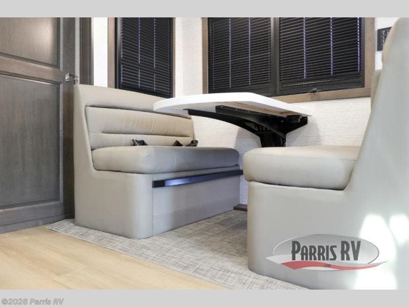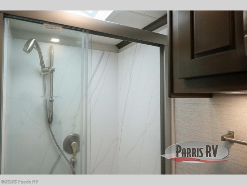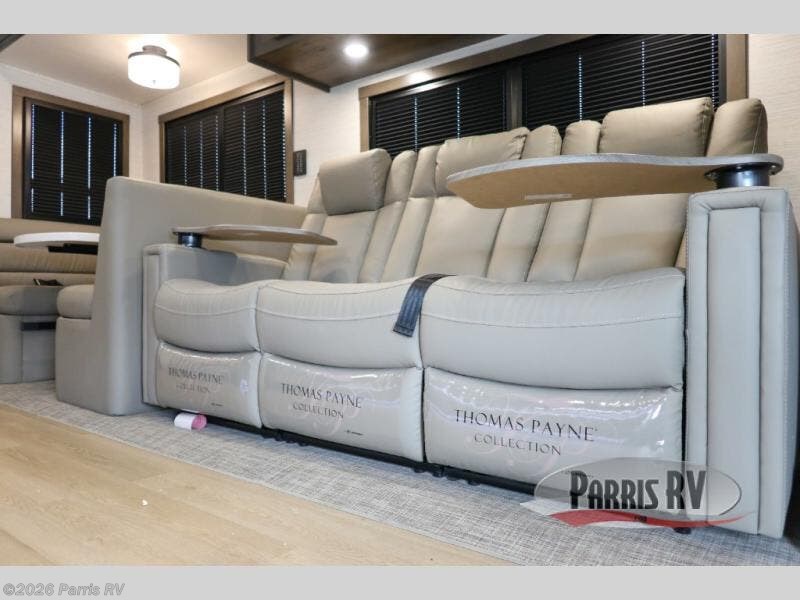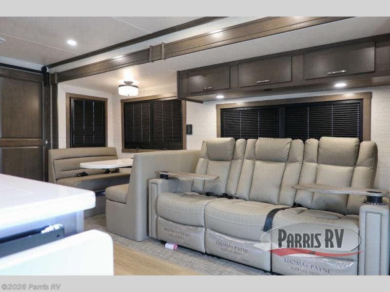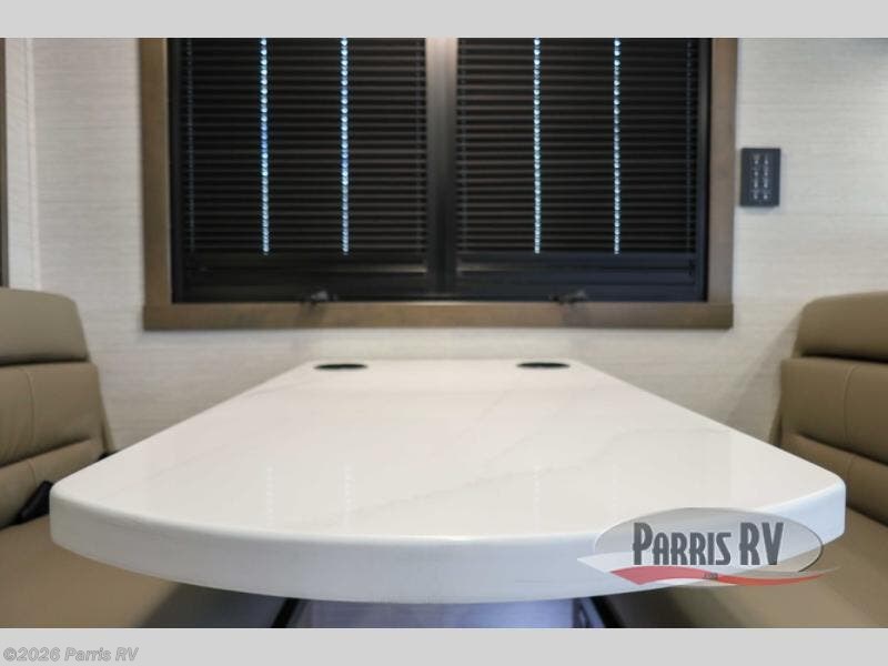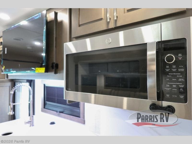 Check out the fabulous features found in this DX3 Super C diesel motorhome! As you spend your nights relaxing in the rear private bedroom, you will appreciate having a 32" LED Smart TV to watch before drifting off to sleep. The Solid Surface Shower Surround with glass door and skylight will be wonderful to see in the morning, and the Oxygenics Body Spa shower head will deliver an enjoyable experience. Step foot into the kitchen and be amazed by the home-like conveniences that have been included, like the residential refrigerator, the convection microwave, the pantry, and the under-cabinet lighting.