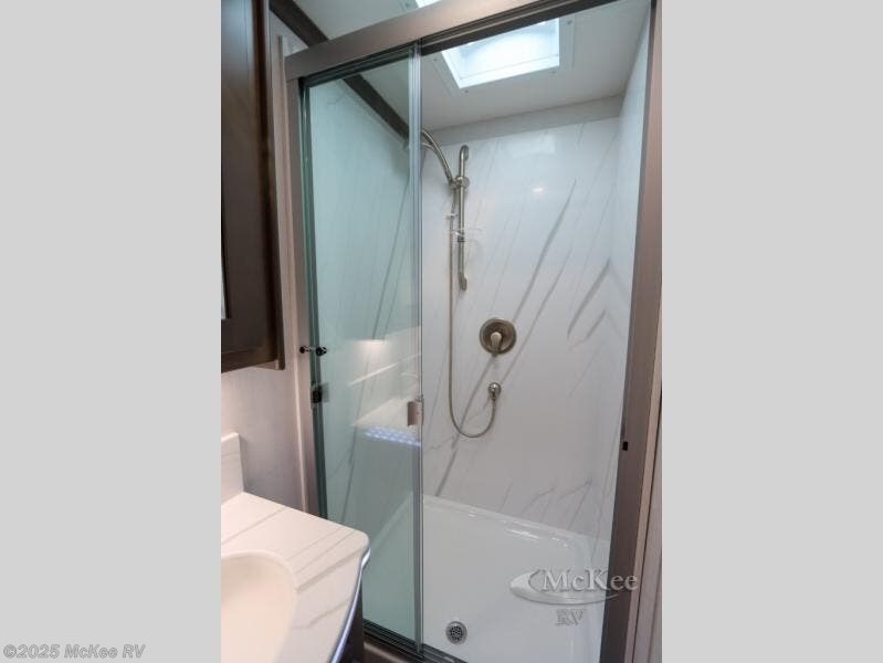 This DX3 Super C diesel motorhome is quite a beast! This coach has excellent sleeping accommodations with its king-size bed, set of bunk beds, Dream Dinette, and sleeper sofa. You can even add more sleeping space to this coach by selecting the optional bunk over cab. As you rest your tired body on the sofa, you'll be able to watch the 39" LED TV directly across from you. The kitchen is also right across from the sofa so that you can still chop veggies on the countertop extension while you enjoy the company of those resting on the furniture. The bathroom is another feature that will grab your attention. This space has a fiberglass shower, a shower skylight, a glass shower door, and an Oxygenics Body Spa RV shower head.