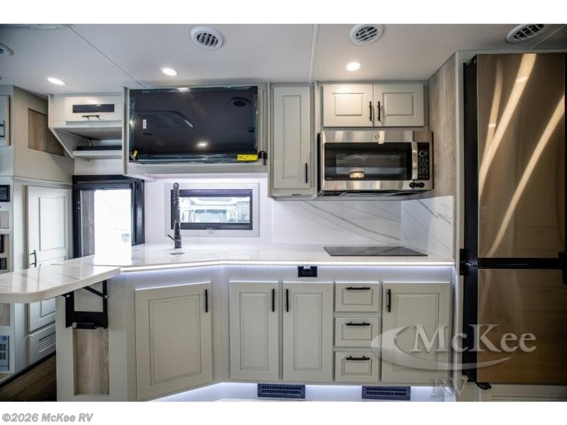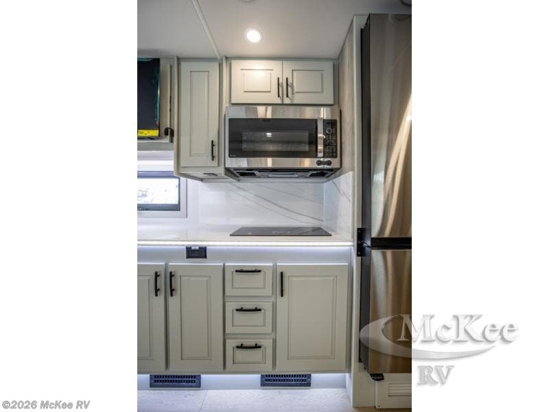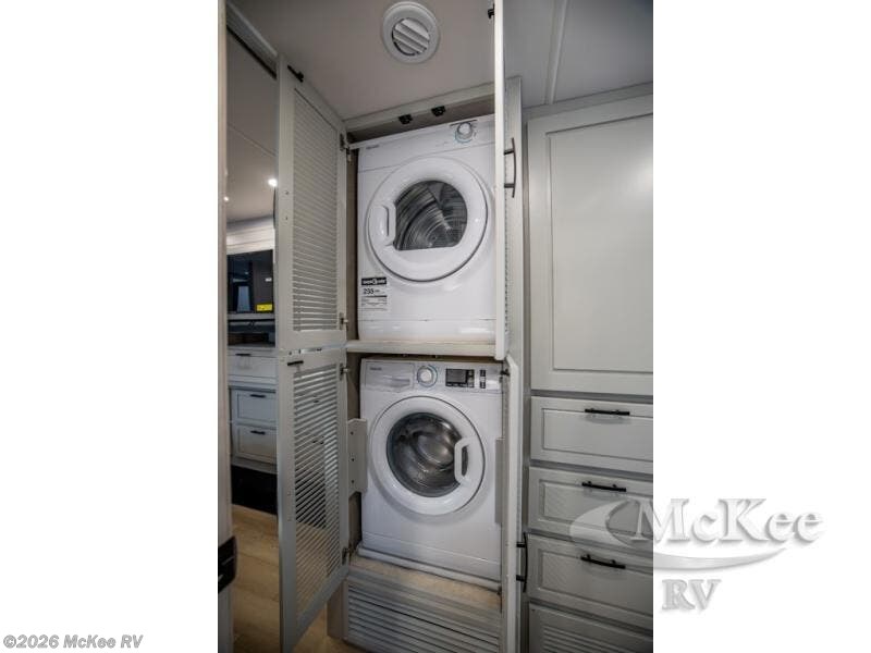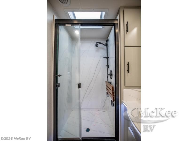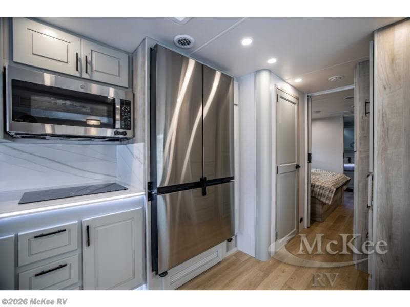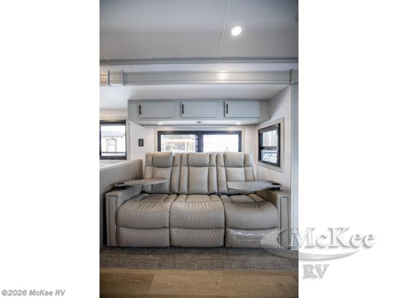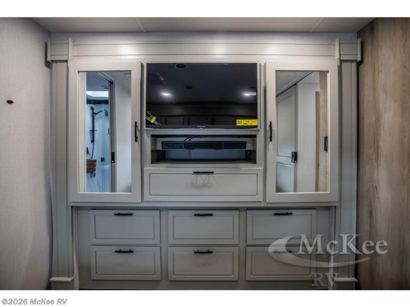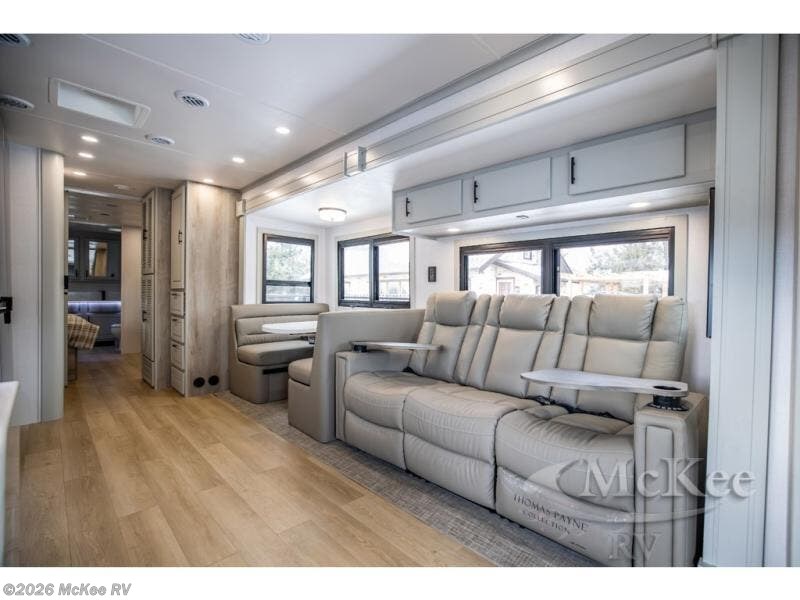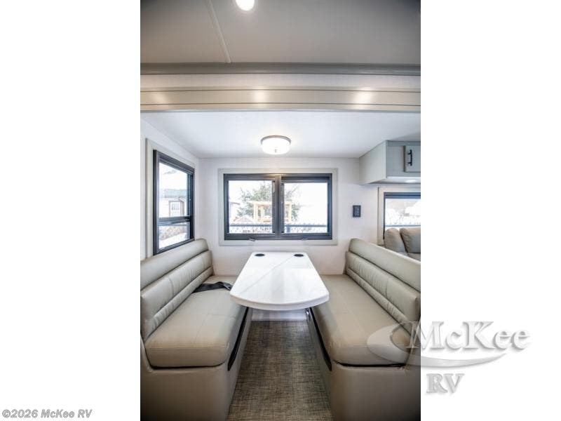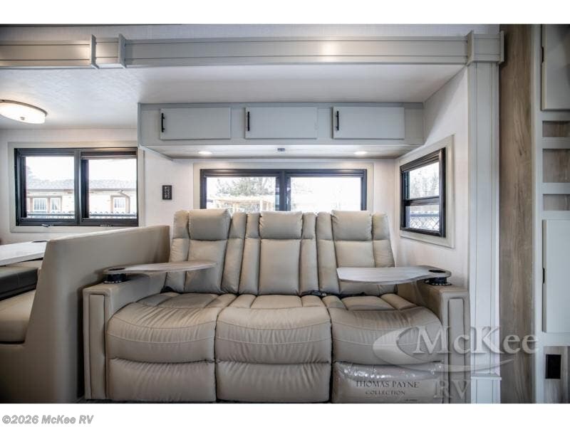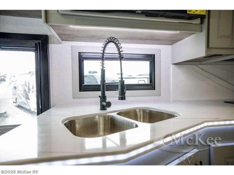 It's a clean decision with a bath and a half to take this motorhome on your next trip! The full rear bathroom has a radius shower to freshen up in, a closet to keep your towels close, and a dual sink vanity for two to get ready at once. It also creates a master suite with a king bed slide across from a dresser with a 32" TV and wardrobes on either side of it. Across from the half bathroom is a closet that is prepped to add an optional washer and dryer for clean clothes throughout your entire trip. You will have everything you need to prepare your best meals including a countertop extension. Enjoy your meals, play card games, and even transform into a sleeping space all with the Dream Dinette. The tri-fold sofa sleeper not only has seatbelts for traveling, but also can transform into a sleeping space too. You can also choose to add the optional bunk over cab for more sleeping space or switch out the sofa for the optional theaters seats!