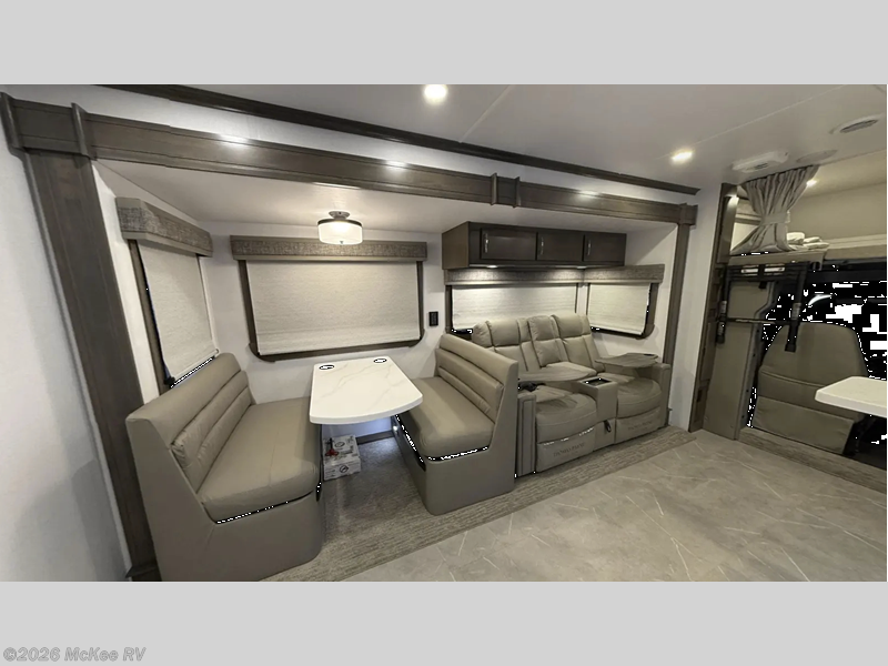 It's a clean decision with a bath and a half to take this motorhome on your next trip! The full rear bathroom has a radius shower to freshen up in, a closet to keep your towels close, and a dual sink vanity for two to get ready at once. It also creates a master suite with a king bed slide across from a dresser with a 32" TV and wardrobes on either side of it. Across from the half bathroom is a closet that is prepped to add an optional washer and dryer for clean clothes throughout your entire trip. You will have everything you need to prepare your best meals including a countertop extension. Enjoy your meals, play card games, and even transform into a sleeping space all with the Dream Dinette. The tri-fold sofa sleeper not only has seatbelts for traveling, but also can transform into a sleeping space too. You can also choose to add the optional bunk over cab for more sleeping space or switch out the sofa for the optional theaters seats!