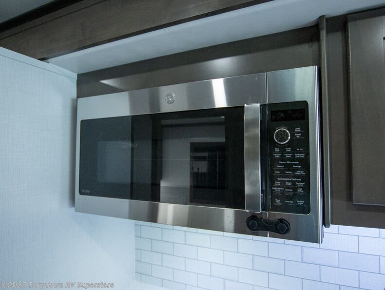 Whether you plan to go near or far, you'll stay comfortable in this spacious coach! There is a king bed slide out in the rear bedroom, plus dual wardrobes, dual nightstands, and your own 32" TV. Each morning, you can freshen up in the full bath that includes a glass shower door, then head to the kitchen for breakfast. There is a convection microwave, a gas range, plus a 16 cu. ft. residential refrigerator with an ice maker for convenience. The 64" sofa sleeper and Dream Dinette provide a place to dine, relax, and sleep additional guest, and you might want to add the cab-over bunk option for the little ones. Spend your evenings outdoors under the armless patio awning with LED lighting and watch a movie on the exterior 32" TV!