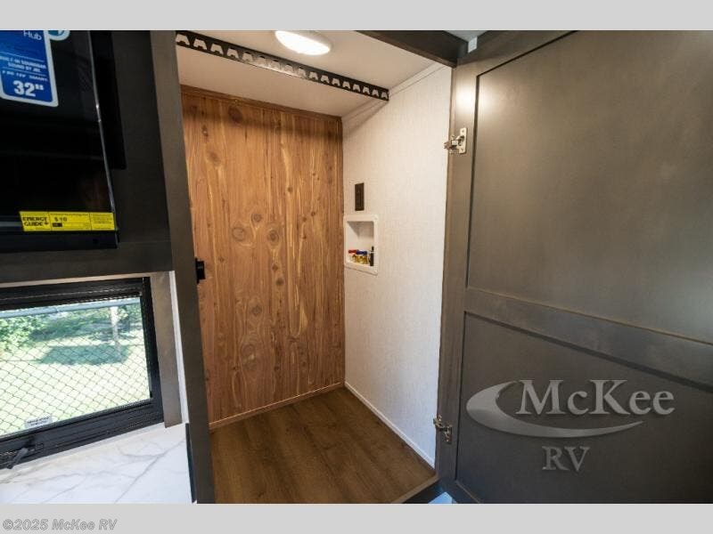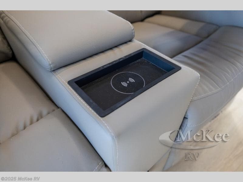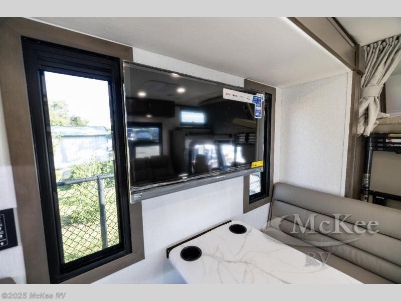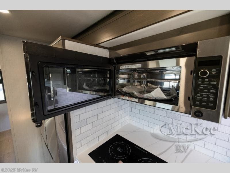 Whether you plan to go near or far, you'll stay comfortable in this spacious coach! There is a king bed slide out in the rear bedroom, plus dual wardrobes, dual nightstands, and your own 32" TV. Each morning, you can freshen up in the full bath that includes a glass shower door, then head to the kitchen for breakfast. There is a convection microwave, a gas range, plus a 16 cu. ft. residential refrigerator with an ice maker for convenience. The 64" sofa sleeper and Dream Dinette provide a place to dine, relax, and sleep additional guest, and you might want to add the cab-over bunk option for the little ones. Spend your evenings outdoors under the armless patio awning with LED lighting and watch a movie on the exterior 32" TV!