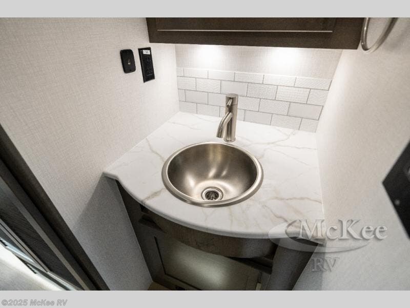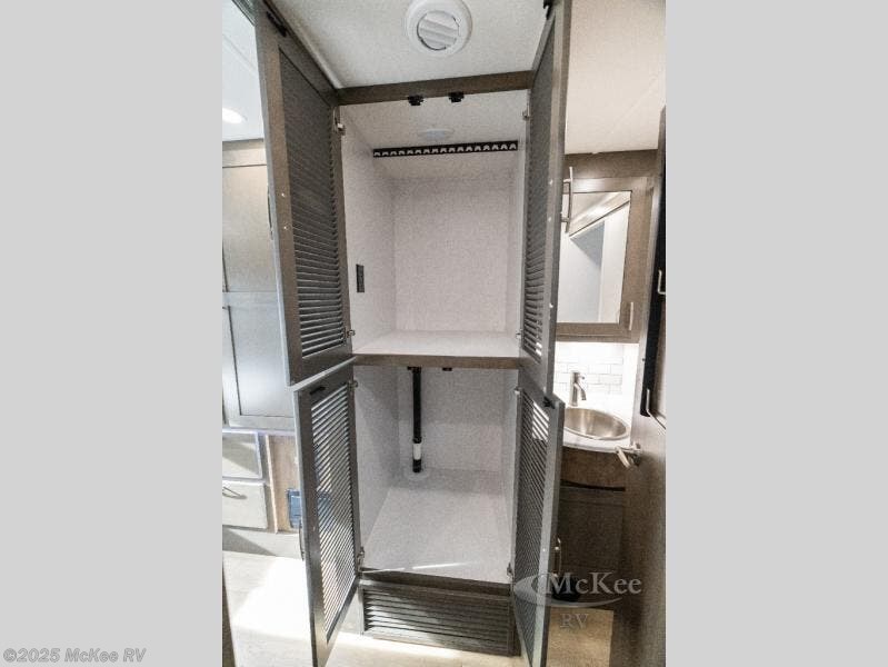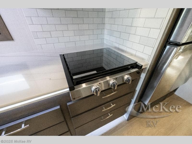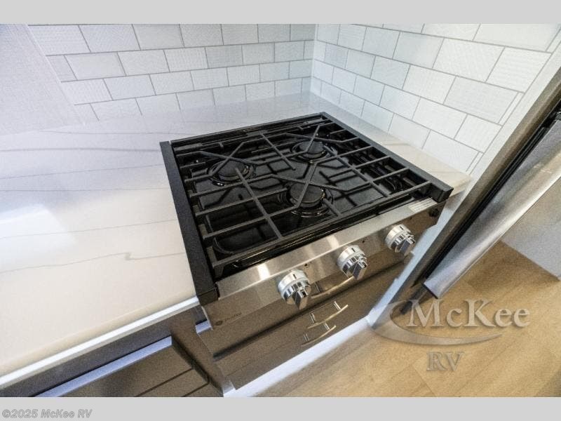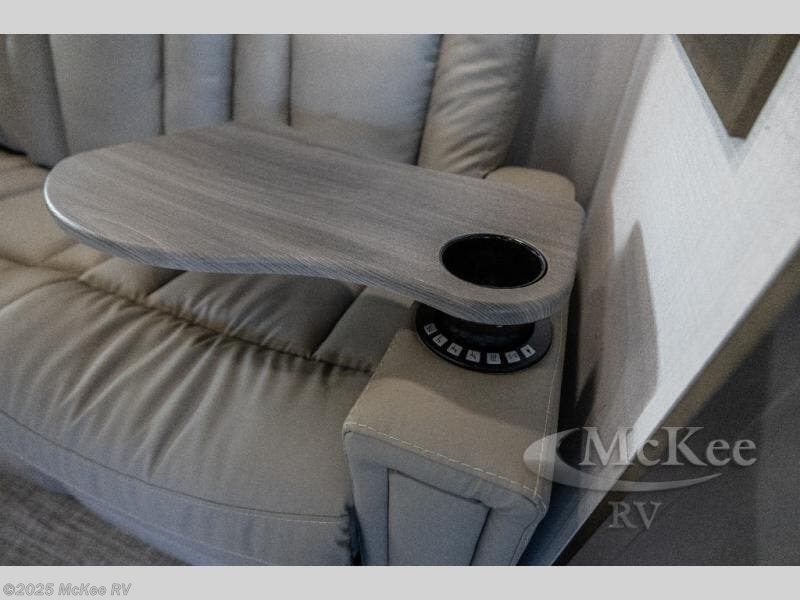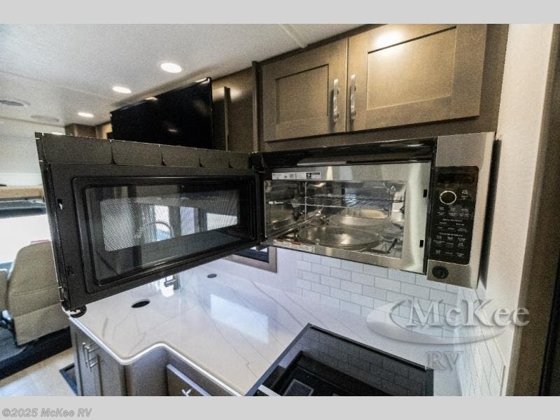 This double slide out coach is perfect for any vacation. Seating is plentiful with a tri-fold sleeper sofa and dream dinette, plus you can swivel the captain's seats to be part of the living area once you are parked. There is also a 39" LED Smart TV across from the sofa for easy viewing. You will enjoy cooking in the kitchen on the three-burner range or in the convection microwave, plus there is a 15 cu. ft. 12V 3-door compressor-driven refrigerator for perishables. This Europa also features a rear master suite with a king bed slide out, a 32" LED Smart TV, and dual bedroom wardrobes. The full bath includes washer/dryer prep and a hallway sink for additional convenience. If you need more space, consider the cab-over bunk option to sleep more guests!