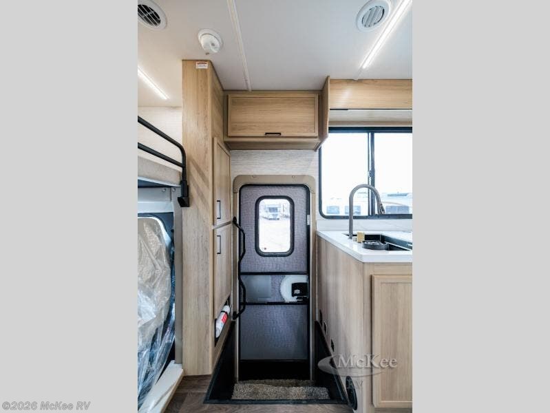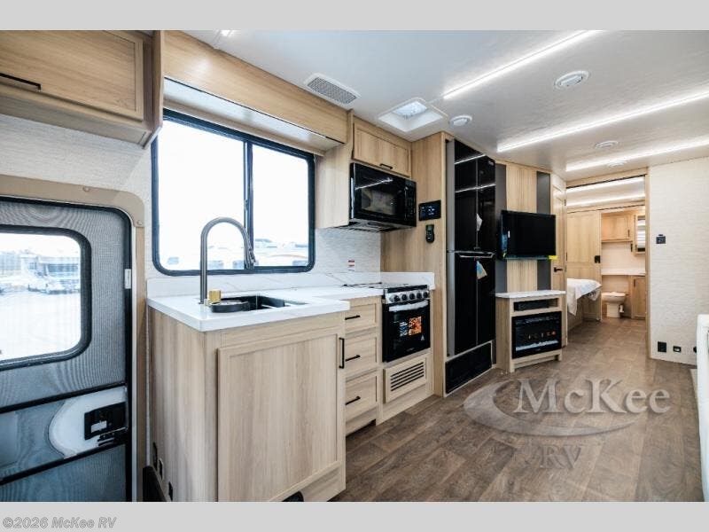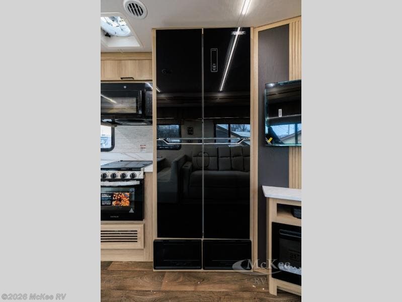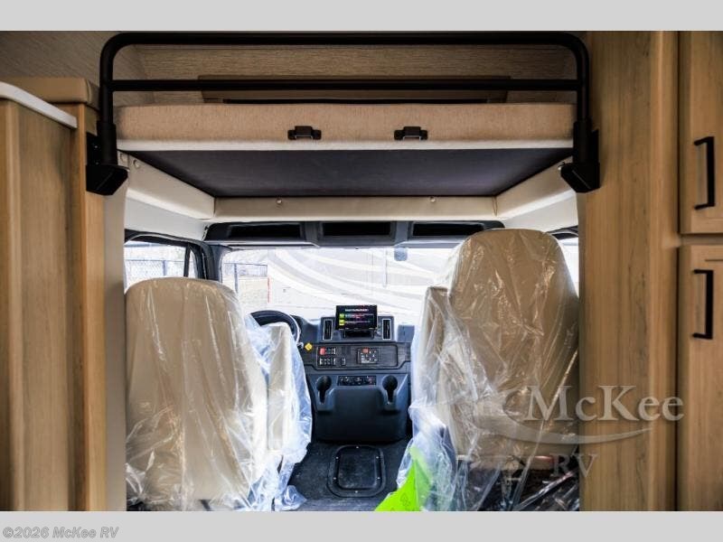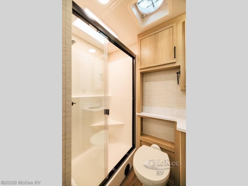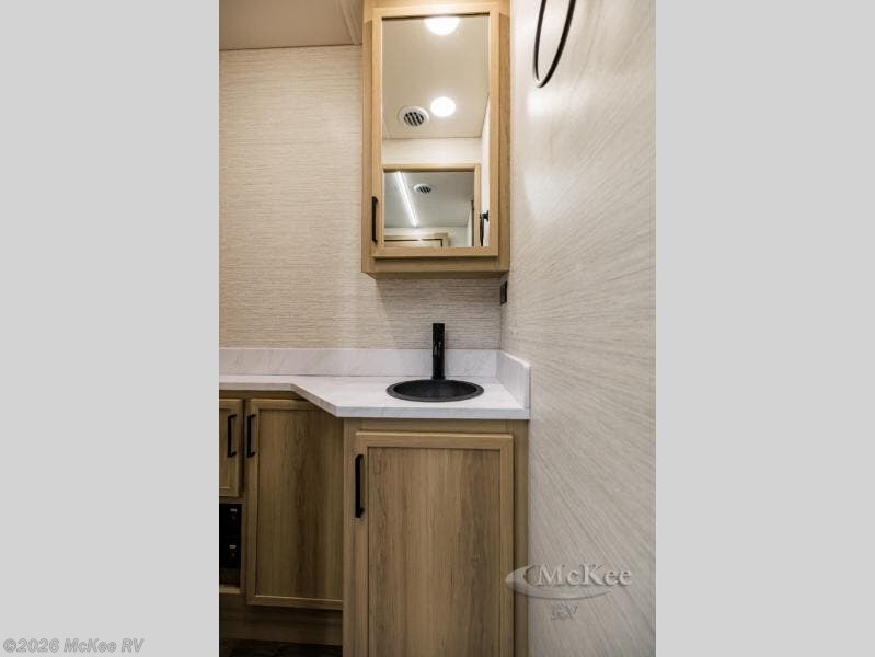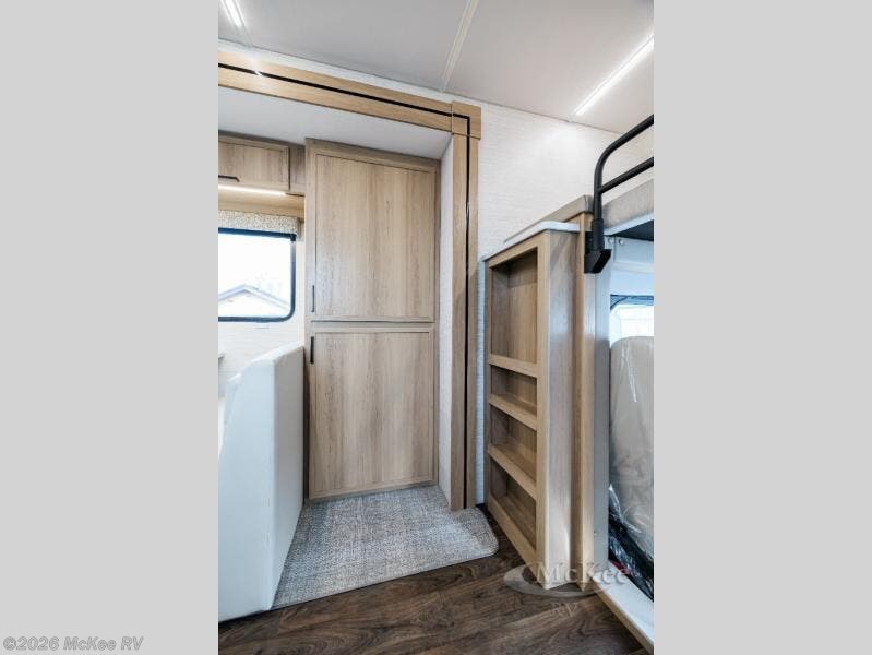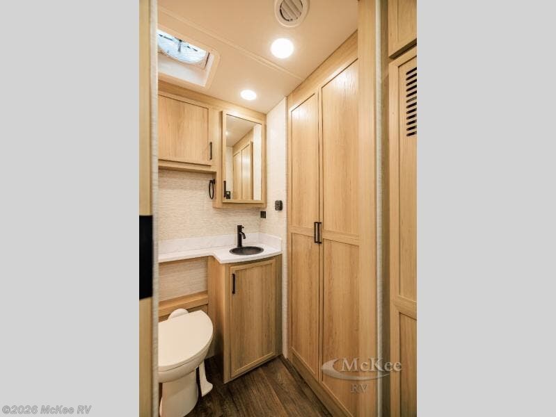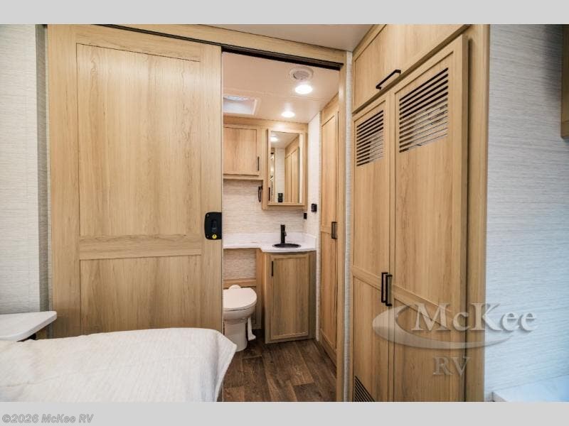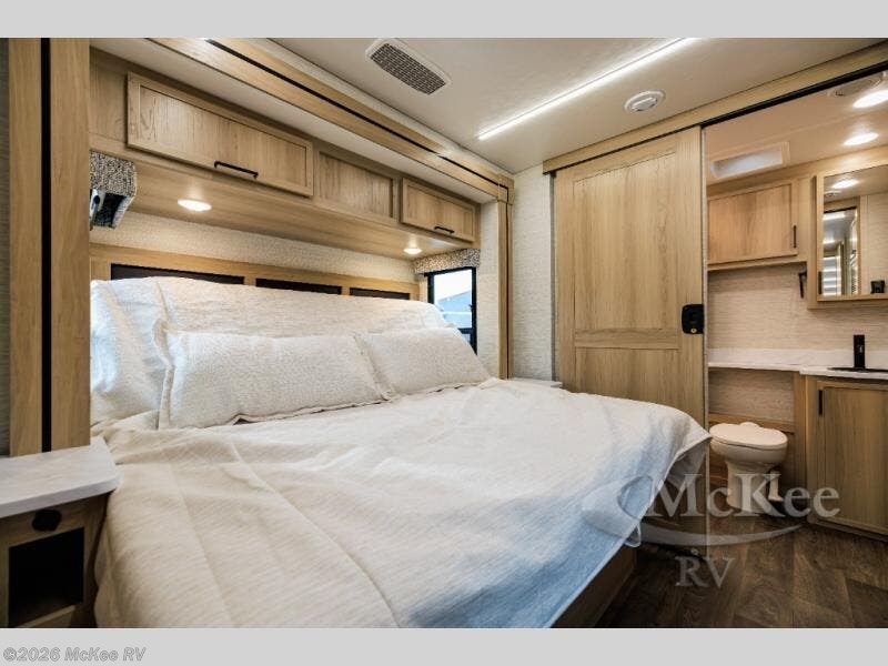 At the front, you’re welcomed into the cockpit area with an overhead bunk that adds sleeping space without sacrificing comfort. The spacious living area features a large slideout that houses a tri-fold sleeper sofa, giving you both a cozy place to relax and accommodations for guests. Next to it, the Dream Dinette is perfect for enjoying meals, playing board games, or simply spending quality time together. The slideout also includes a pantry, offering storage for dry goods, while across from it the kitchen features an L-shaped solid surface countertops, a gunmetal steel sink, a sealed glass range with glass cover, and a 15-cu. ft. refrigerator to easily handle all your grocery needs. Multiple TVs, one in the kitchen area and another across from the sofa, make movie nights effortless. A convenient half bath is located mid-coach, while the rear of the motorhome is dedicated to a private bedroom featuring a king bed slideout, nightstands on both sides, dual wardrobes, a dresser, and a centrally located 32" TV. At the very back, the full bathroom completes the layout with a medicine cabinet and an additional wardrobe, delivering comfort, functionality, and abundant storage throughout the coach.
