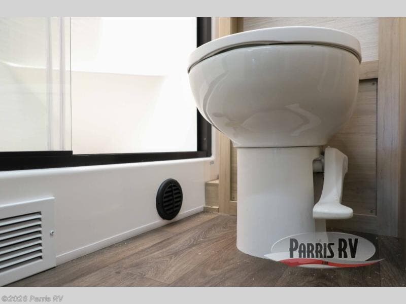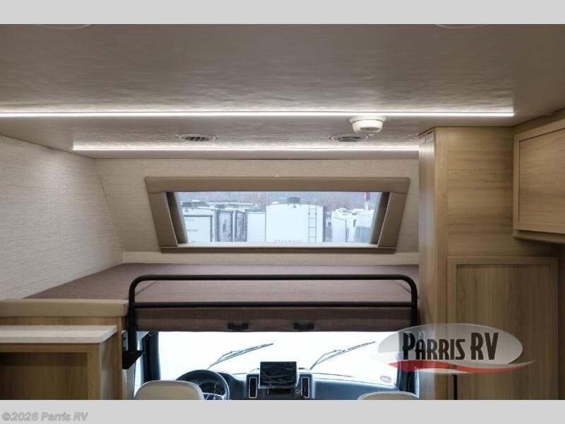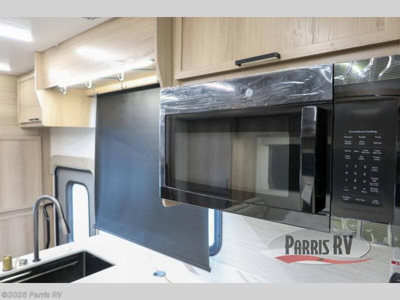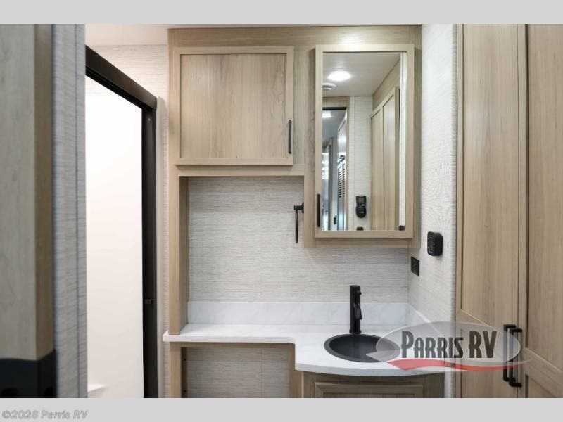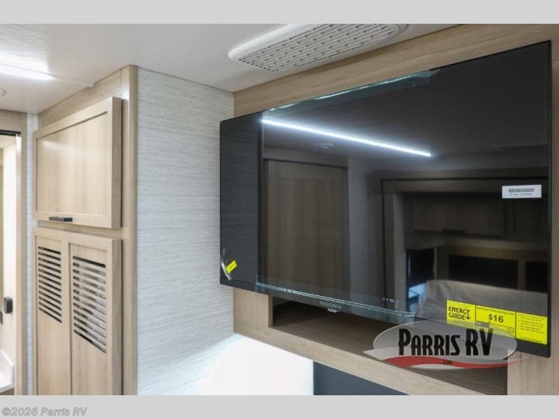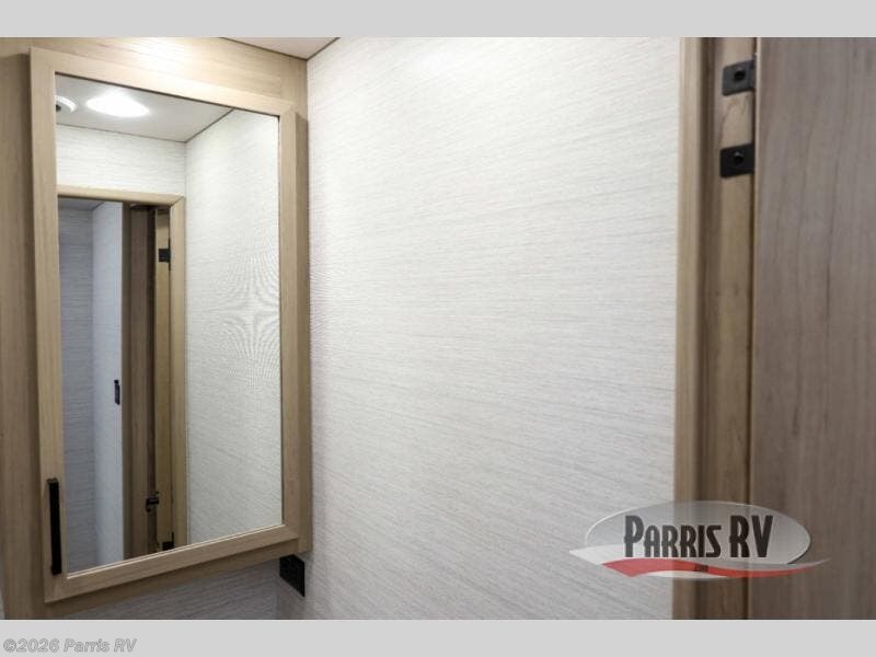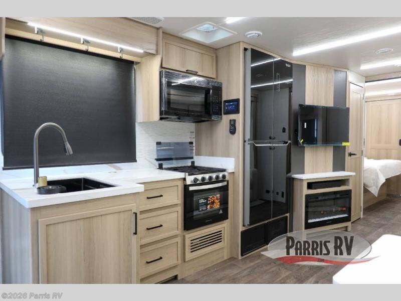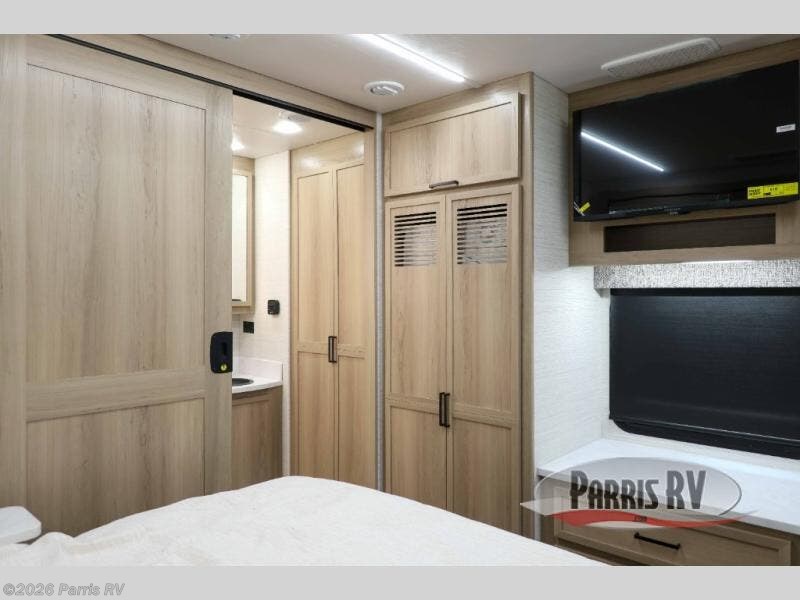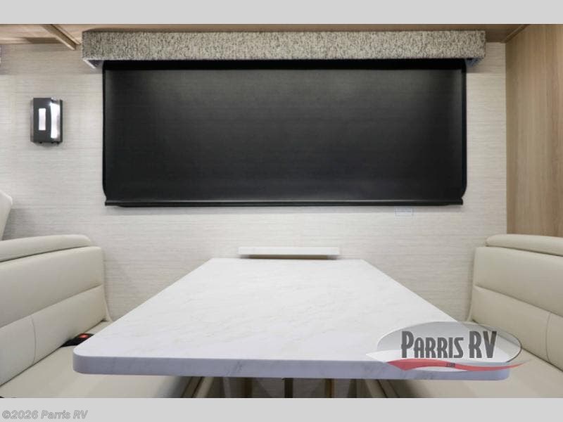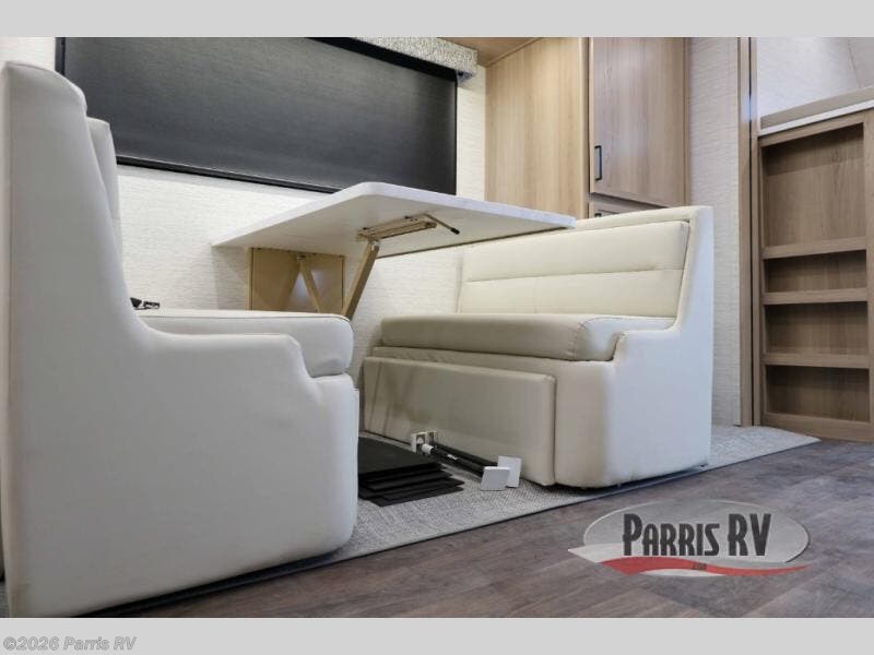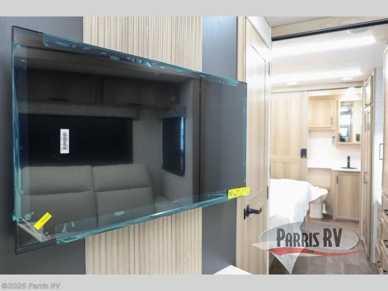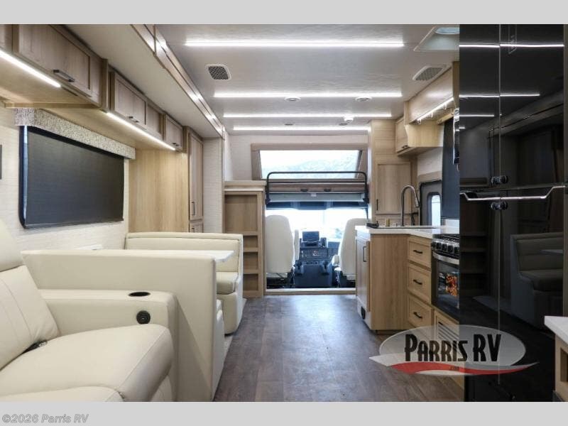 At the front, you’re welcomed into the cockpit area with an overhead bunk that adds sleeping space without sacrificing comfort. The spacious living area features a large slideout that houses a tri-fold sleeper sofa, giving you both a cozy place to relax and accommodations for guests. Next to it, the Dream Dinette is perfect for enjoying meals, playing board games, or simply spending quality time together. The slideout also includes a pantry, offering storage for dry goods, while across from it the kitchen features an L-shaped solid surface countertops, a gunmetal steel sink, a sealed glass range with glass cover, and a 15-cu. ft. refrigerator to easily handle all your grocery needs. Multiple TVs, one in the kitchen area and another across from the sofa, make movie nights effortless. A convenient half bath is located mid-coach, while the rear of the motorhome is dedicated to a private bedroom featuring a king bed slideout, nightstands on both sides, dual wardrobes, a dresser, and a centrally located 32" TV. At the very back, the full bathroom completes the layout with a medicine cabinet and an additional wardrobe, delivering comfort, functionality, and abundant storage throughout the coach.