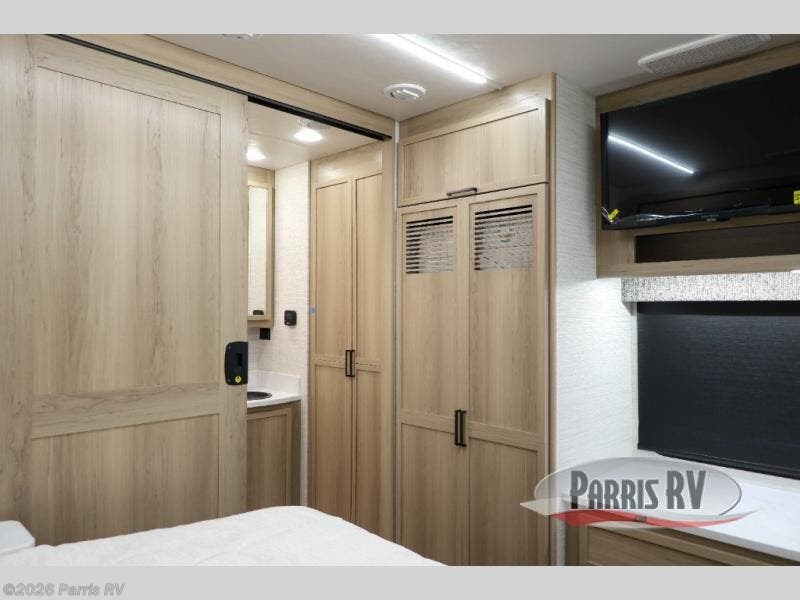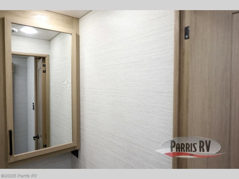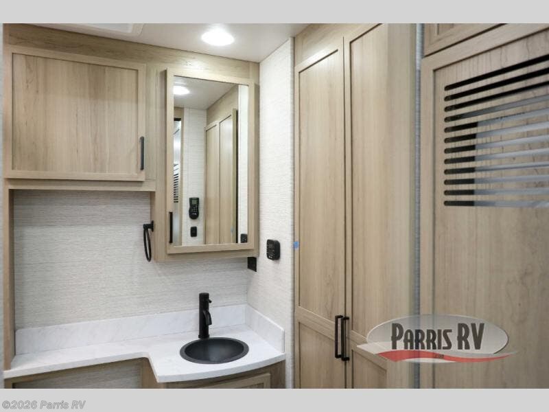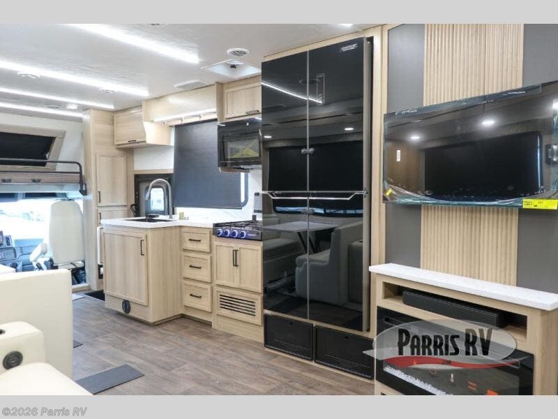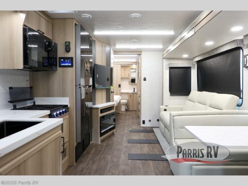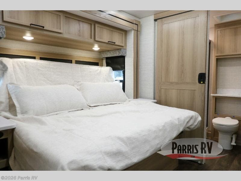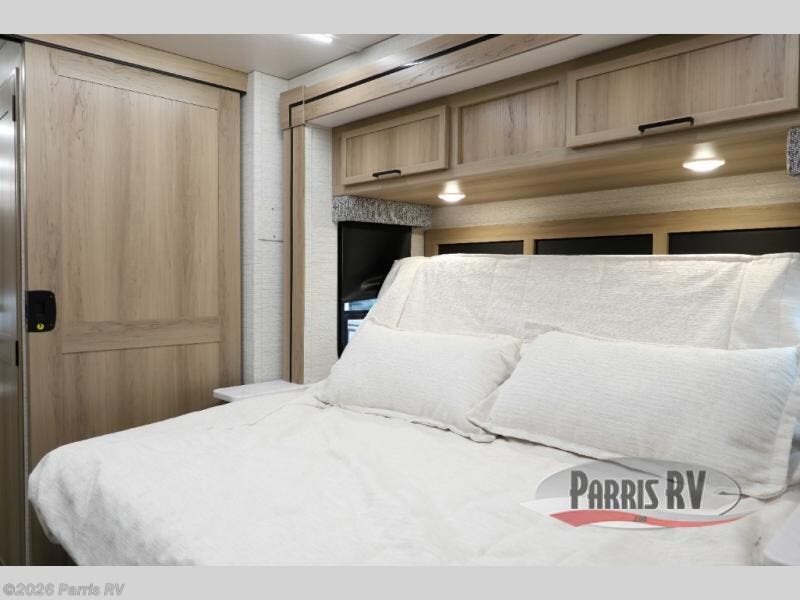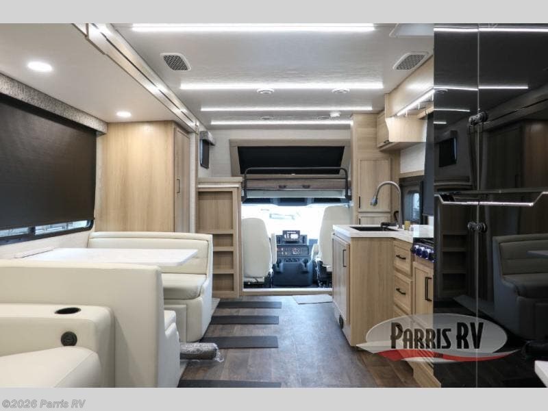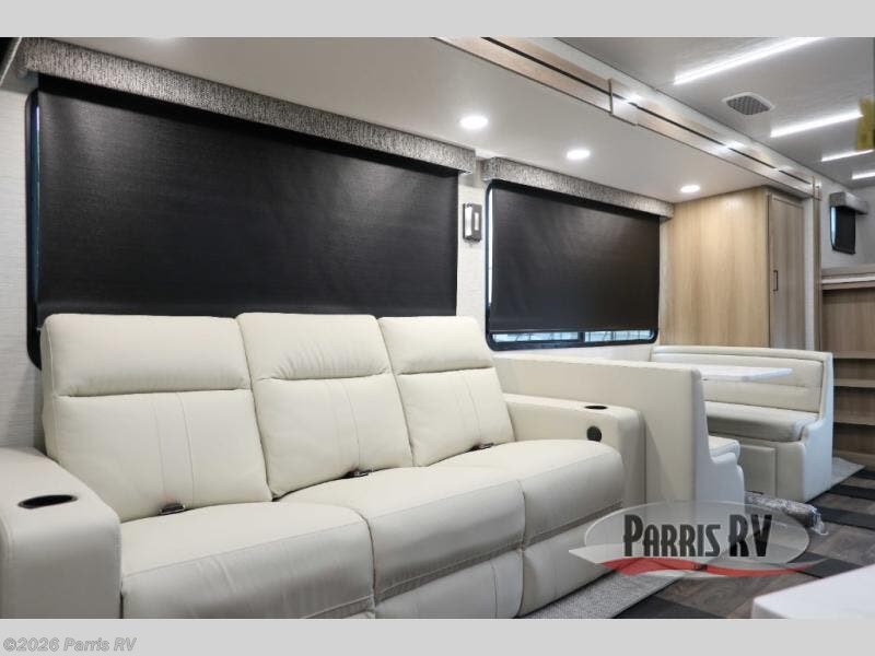 At the front, you’re welcomed into the cockpit area with an overhead bunk that adds sleeping space without sacrificing comfort. The spacious living area features a large slideout that houses a tri-fold sleeper sofa, giving you both a cozy place to relax and accommodations for guests. Next to it, the Dream Dinette is perfect for enjoying meals, playing board games, or simply spending quality time together. The slideout also includes a pantry, offering storage for dry goods, while across from it the kitchen features an L-shaped solid surface countertops, a gunmetal steel sink, a sealed glass range with glass cover, and a 15-cu. ft. refrigerator to easily handle all your grocery needs. Multiple TVs, one in the kitchen area and another across from the sofa, make movie nights effortless. A convenient half bath is located mid-coach, while the rear of the motorhome is dedicated to a private bedroom featuring a king bed slideout, nightstands on both sides, dual wardrobes, a dresser, and a centrally located 32" TV. At the very back, the full bathroom completes the layout with a medicine cabinet and an additional wardrobe, delivering comfort, functionality, and abundant storage throughout the coach.