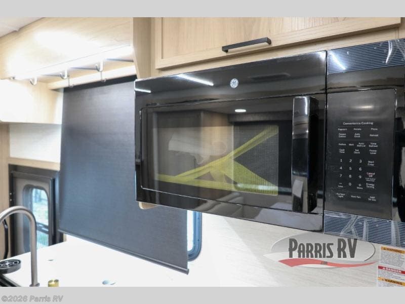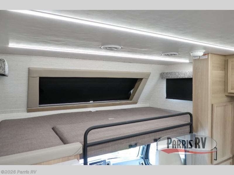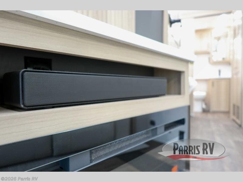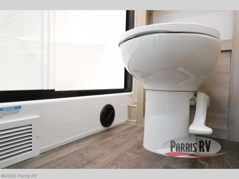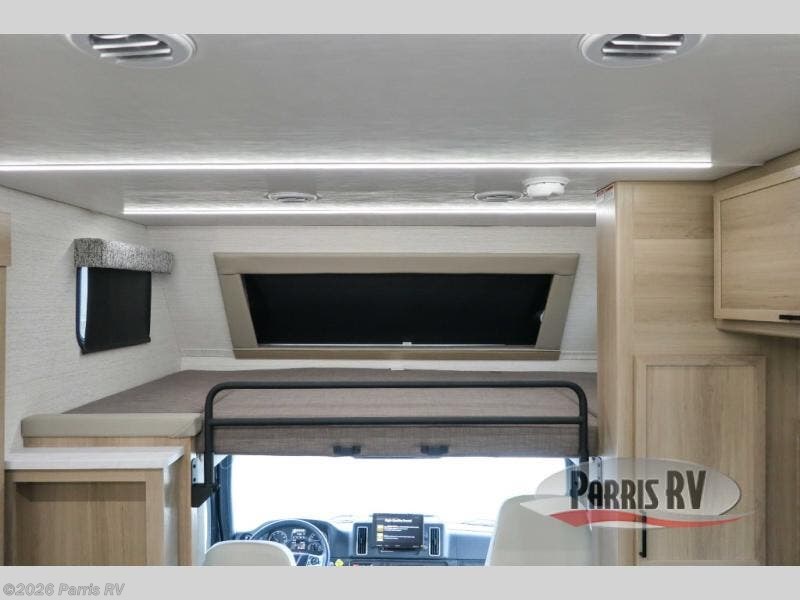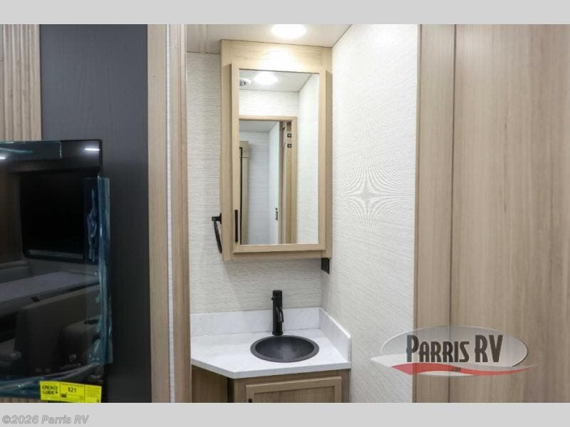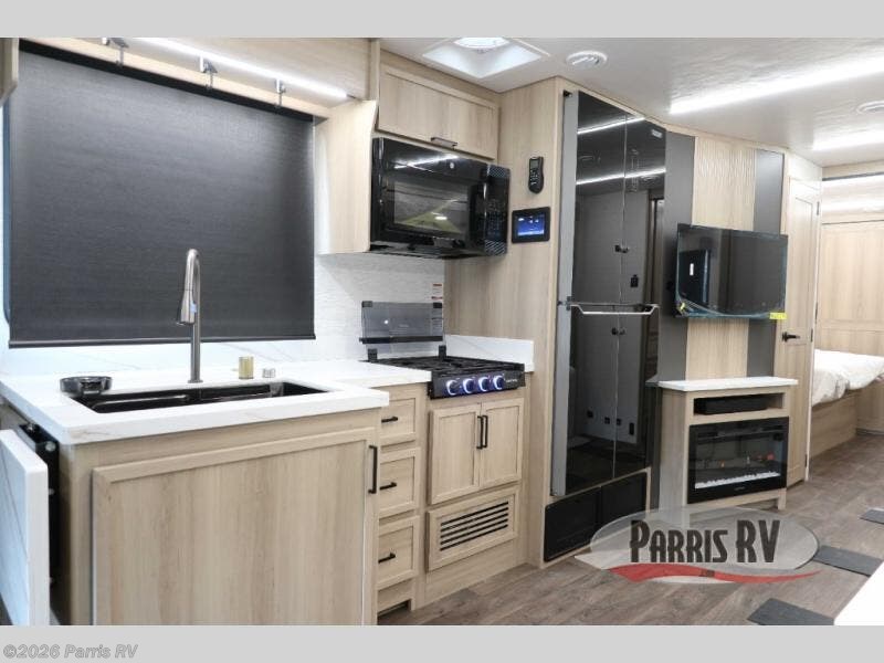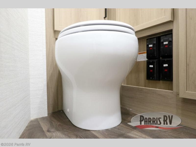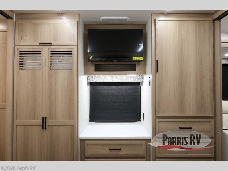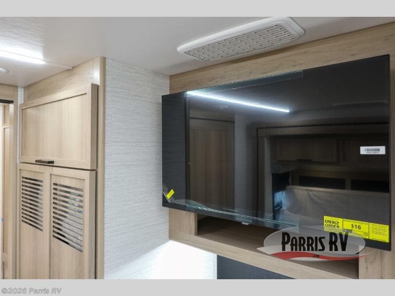 At the front, you’re welcomed into the cockpit area with an overhead bunk that adds sleeping space without sacrificing comfort. The spacious living area features a large slideout that houses a tri-fold sleeper sofa, giving you both a cozy place to relax and accommodations for guests. Next to it, the Dream Dinette is perfect for enjoying meals, playing board games, or simply spending quality time together. The slideout also includes a pantry, offering storage for dry goods, while across from it the kitchen features an L-shaped solid surface countertops, a gunmetal steel sink, a sealed glass range with glass cover, and a 15-cu. ft. refrigerator to easily handle all your grocery needs. Multiple TVs, one in the kitchen area and another across from the sofa, make movie nights effortless. A convenient half bath is located mid-coach, while the rear of the motorhome is dedicated to a private bedroom featuring a king bed slideout, nightstands on both sides, dual wardrobes, a dresser, and a centrally located 32" TV. At the very back, the full bathroom completes the layout with a medicine cabinet and an additional wardrobe, delivering comfort, functionality, and abundant storage throughout the coach.
