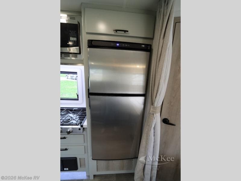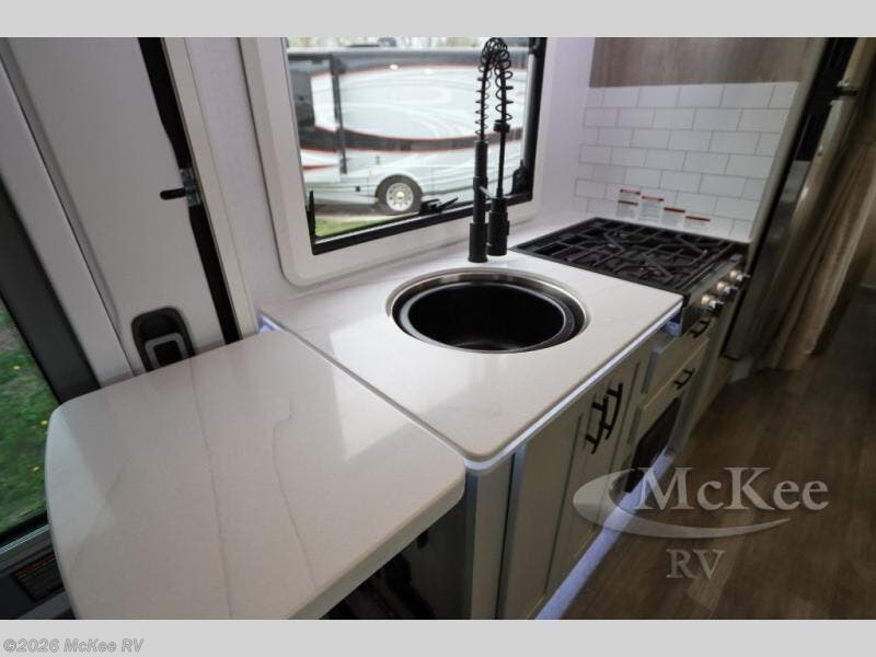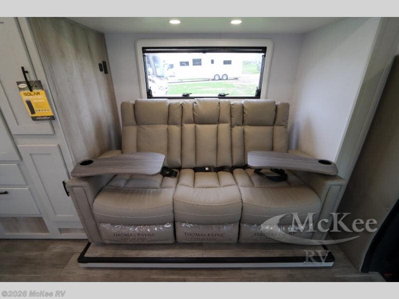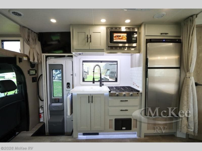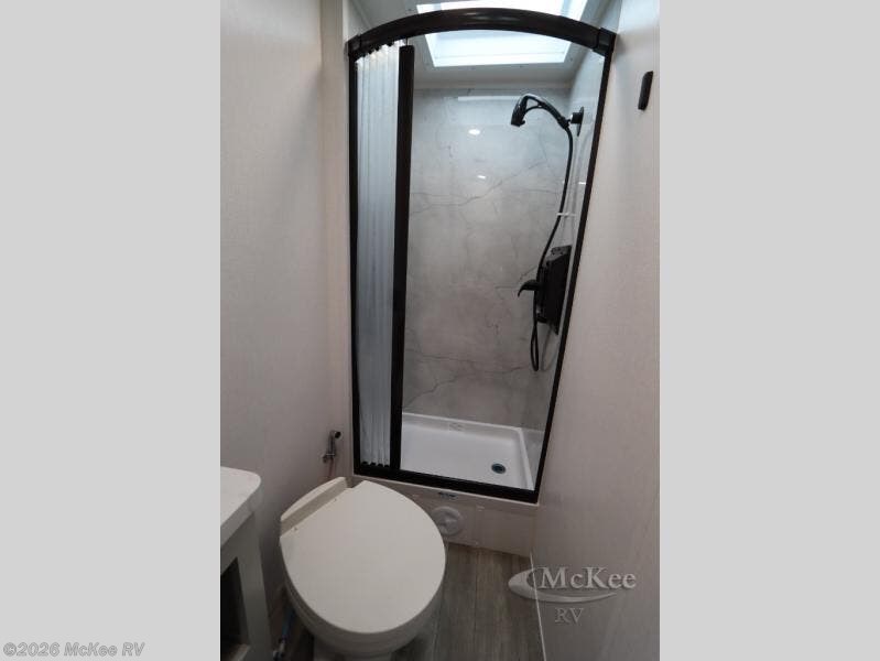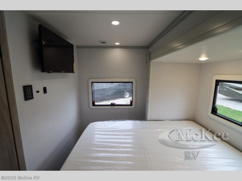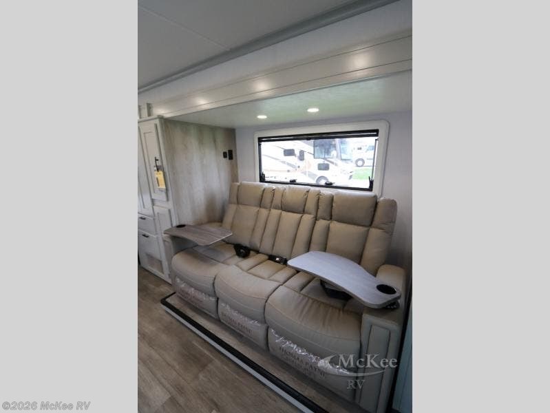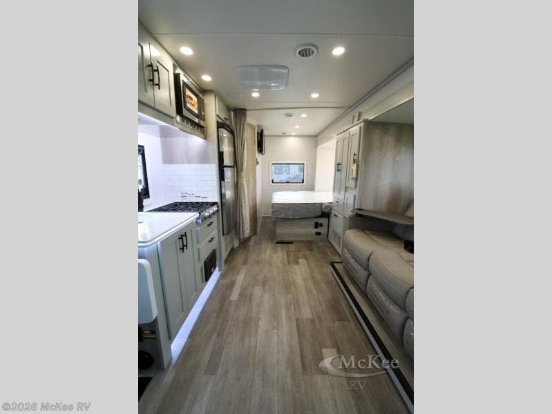 Take this motorhome on your greatest adventures yet! Start each morning feeling well rested after sleeping on the corner queen bed then head to the rear corner bathroom to freshen up in the shower with an Oxygenics body spa RV shower head and a skylight above for added headroom and natural lighting. Now that you're ready for the day, you can grab some eggs from the 8 cu. ft. two-door compressor-driven refrigerator and fry them up on the three burner cooktop, then enjoy them at the booth dinette. The kitchen also has a countertop extension for more meal prepping space and a convection microwave. This unit also includes a living room 32" LED Smart TV and a 32" LED smart TV across from the bed. You could even switch things up by replacing the booth dinette with an optional 3-seat power recliner, and adding a cab over bunk option!