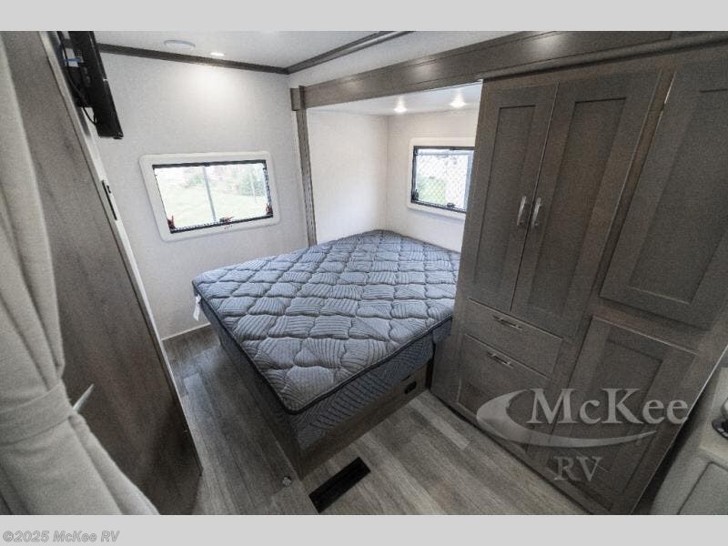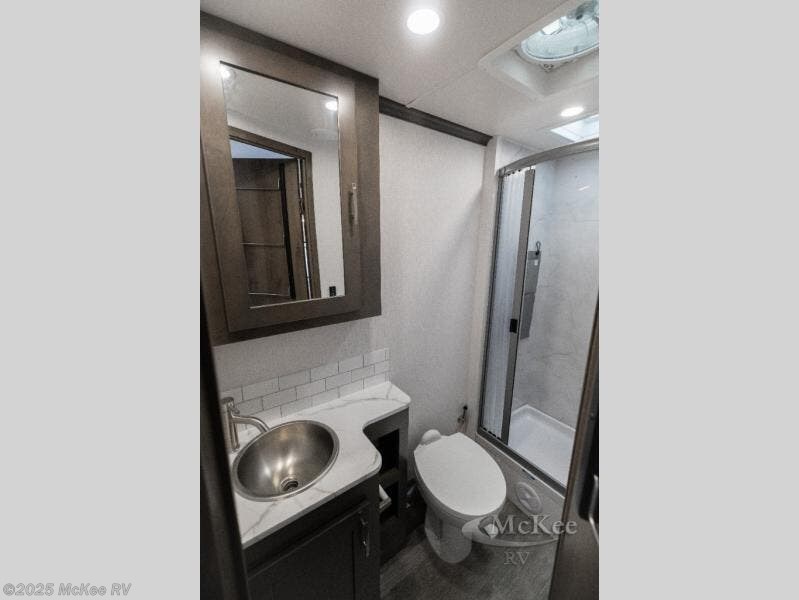 Take this motorhome on your greatest adventures yet! Start each morning feeling well rested after sleeping on the corner queen bed then head to the rear corner bathroom to freshen up in the shower with an Oxygenics body spa RV shower head and a skylight above for added headroom and natural lighting. Now that you're ready for the day, you can grab some eggs from the 8 cu. ft. two-door compressor-driven refrigerator and fry them up on the three burner cooktop, then enjoy them at the booth dinette. The kitchen also has a countertop extension for more meal prepping space and a convection microwave. This unit also includes a living room 32" LED Smart TV and a 32" LED smart TV across from the bed. You could even switch things up by replacing the booth dinette with an optional 3-seat power recliner, and adding a cab over bunk option!