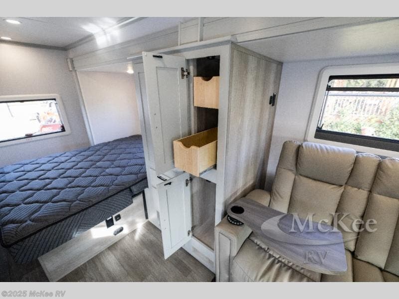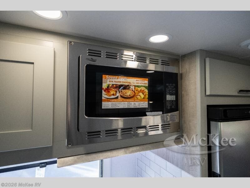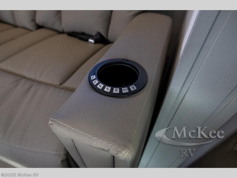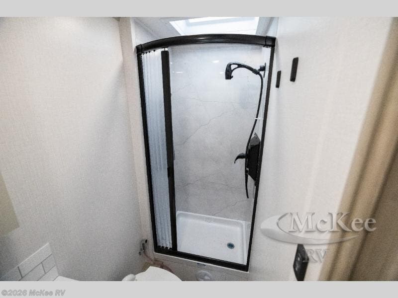 This Freedom Edition coach comes with an insulated cab curtain, an exclusive Freedom Edition full-body paint scheme with two options, and two low-temp lithium house batteries. There is also an 8 cu. ft. 12V two-door compressor-driven refrigerator, a 50 gallon fresh water tank, a 3,000W pure sine wave inverter/charger, and more stand-out features! Start each morning feeling well rested after sleeping on the corner queen bed then head to the rear corner bathroom to freshen up in the shower with an Oxygenics body spa RV shower head and a skylight above for added headroom and natural lighting. Now that you're ready for the day, you can grab some eggs from the refrigerator and fry them up on the two burner induction range then enjoy them at the booth dinette. The kitchen also has a countertop extension for more meal prepping space and a convection microwave oven to pop a bag of popcorn. There is also a living room 32" LED TV and 32" LED smart TV across from the bed. You could even switch things up by replacing the booth dinette with an optional 3-seat power recliner, and adding a cab over bunk option!