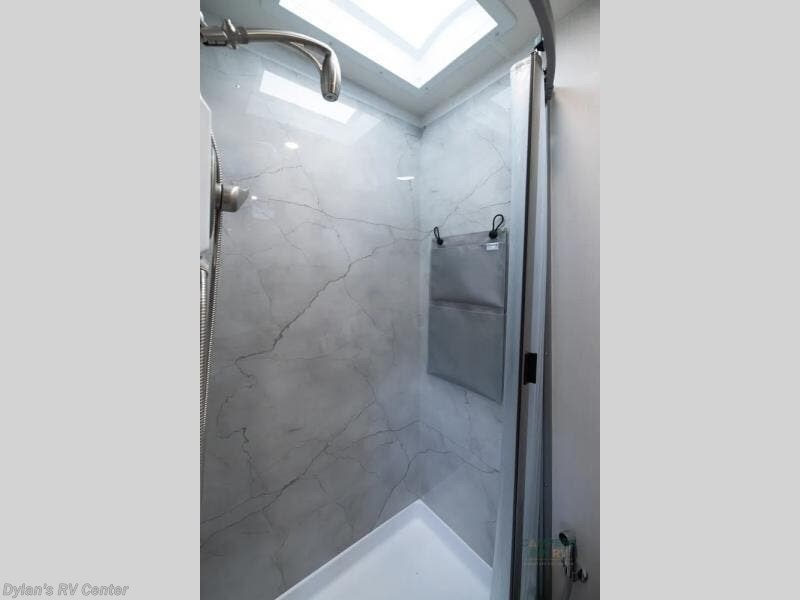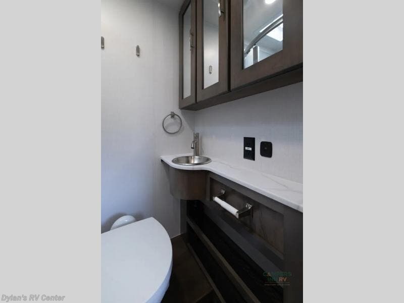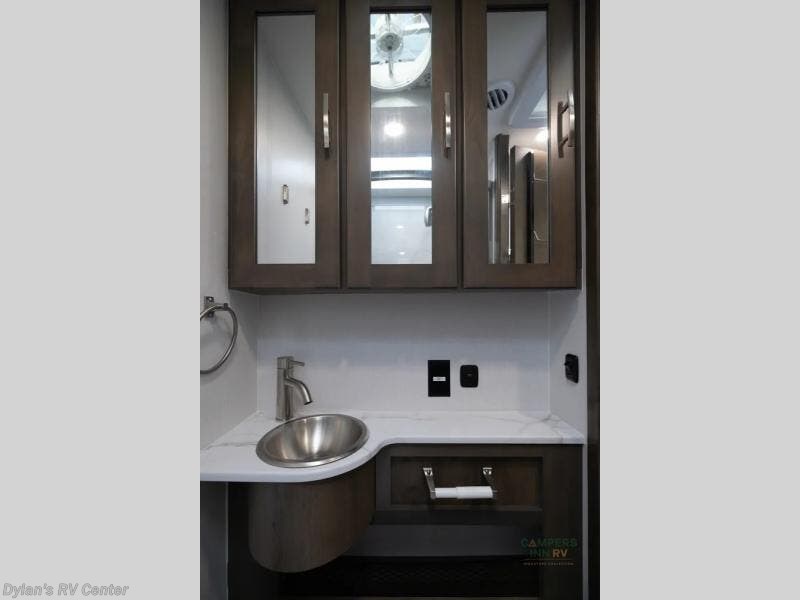Inside, you’ll find an upscale living space thoughtfully designed for both comfort and convenience. High-end finishes, solid surface countertops, ultraleather furniture, and LED lighting throughout create a refined atmosphere, while the slide-out design maximizes interior space. The rear twin beds convert into a king, giving you flexibility for solo or shared travel, and the spacious dry bath offers a touch of home wherever you roam.