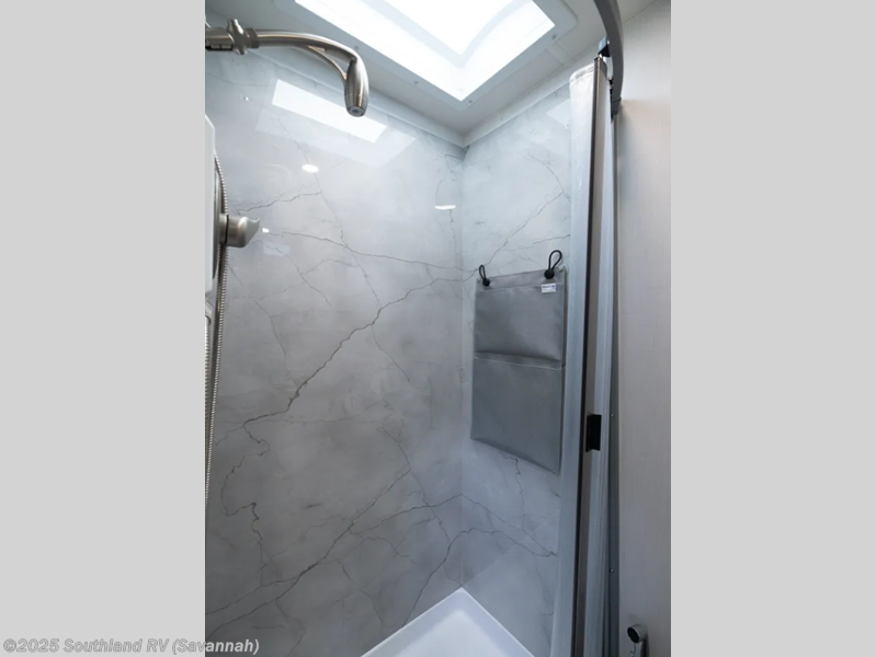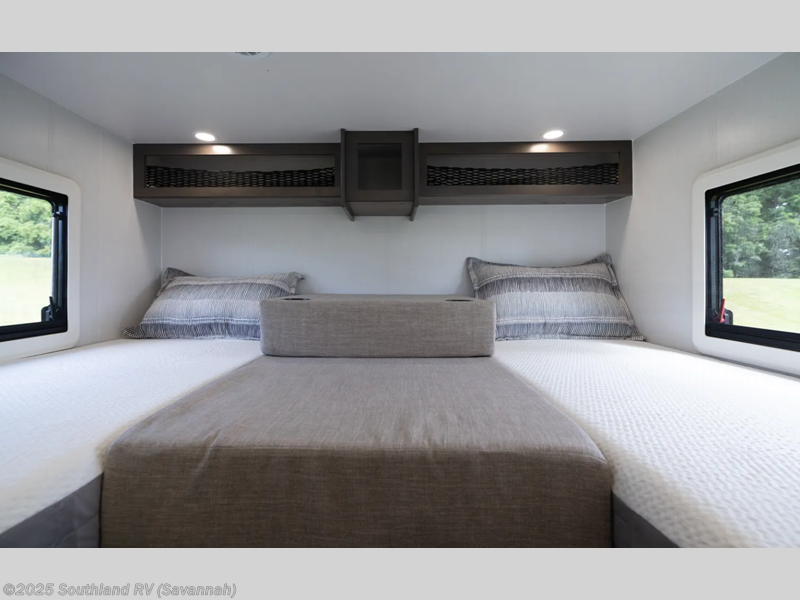 As soon as you step inside this motorhome, you're welcomed by a cozy booth dinette that perfect for enjoying meals or simply relaxing after a day on the road. Directly across, the well-equipped kitchen features all the essentials, including a 12V 8 cu. ft. refrigerator to keep your groceries fresh, a gas range with a glass cover, a convection microwave oven, and a solid surface countertop extension that adds valuable prep space. Adjacent to the dinette is the bathroom, complete with a standard shower enhanced by an Oxygenics Body Spa RV shower head and a skylight for added comfort and natural light, along with a convenient foot-flush toilet. At the rear, you'll find two 30" x 76" beds that can easily convert into an oversized king bed, offering flexible sleeping arrangements. To top it all off, a 32" LED Smart TV lets you unwind with your favorite shows, making this motorhome a true home on wheels.