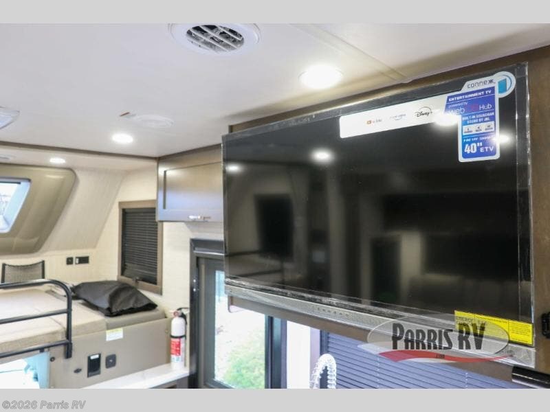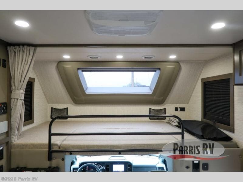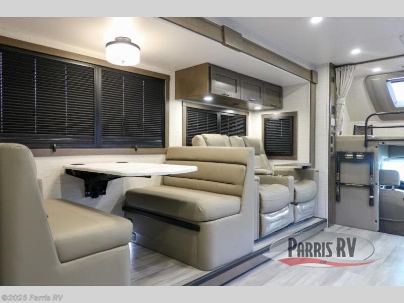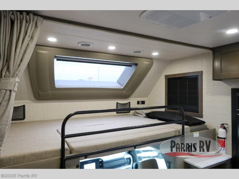 Fall in love with this motorhome bedroom's features, starting with a comfortable queen bed, perfect for a restful night's sleep. Ample storage is provided by the wardrobe and drawers, keeping your belongings organized. You can also enjoy your favorite shows and movies on the TV, or unwind in the full bathroom, complete with all the essentials. Moving to the kitchen area, the booth dinette offers a cozy spot for meals or relaxation, while the pantry provides convenient storage for snacks and supplies. The 12V refrigerator keeps your food and drinks fresh, and the convection microwave makes meal prep an easy and enjoyable task. The tri-fold sleeper sofa offers additional sleeping space for guests, and overhead cabinets provide extra storage for linens, cleaning supplies, and more. More sleeping space can be found in the bunk over the cab, which is perfect for kids or adults alike, offering a cozy sleeping nook with plenty of natural light, and when it's time to relax outside, the exterior awning provides shade and protection, allowing you to focus just on creating new memories.