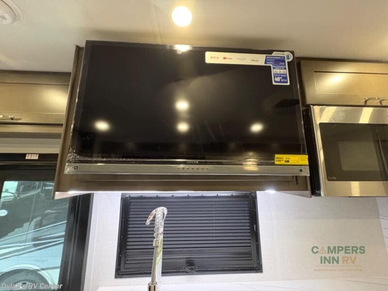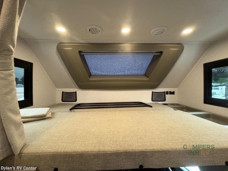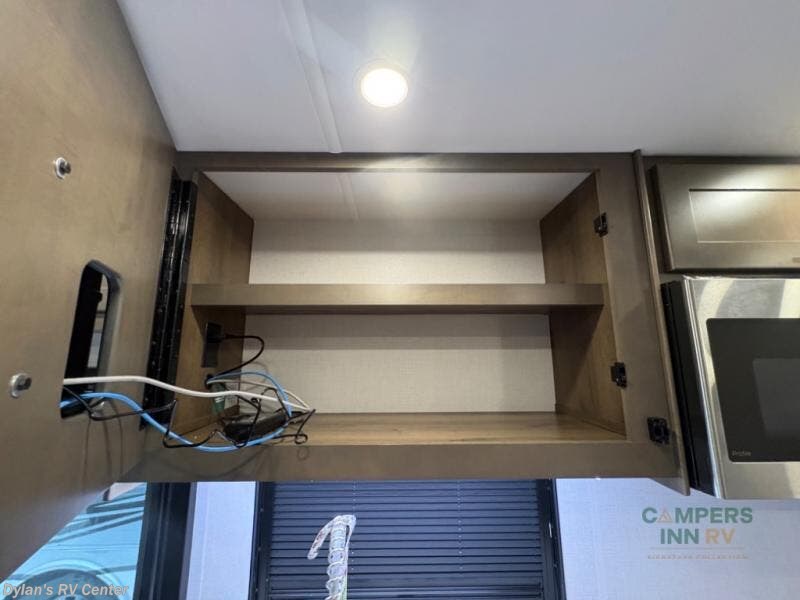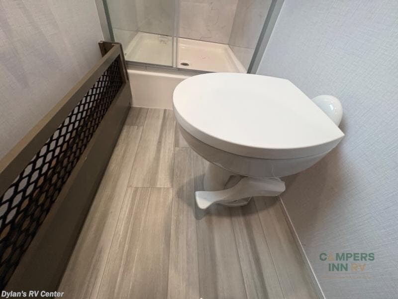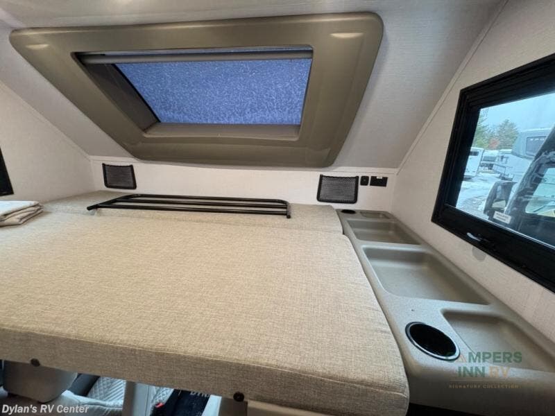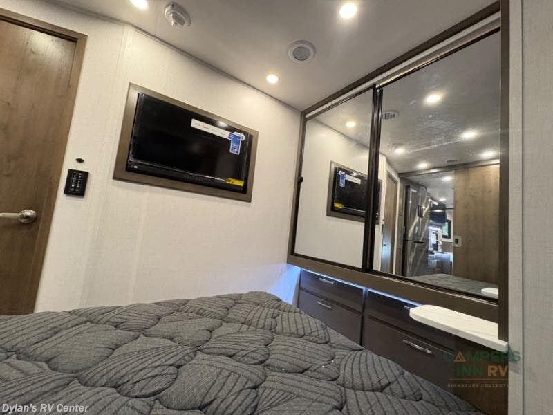 Fall in love with this motorhome bedroom's features, starting with a comfortable queen bed, perfect for a restful night's sleep. Ample storage is provided by the wardrobe and drawers, keeping your belongings organized. You can also enjoy your favorite shows and movies on the TV, or unwind in the full bathroom, complete with all the essentials. Moving to the kitchen area, the booth dinette offers a cozy spot for meals or relaxation, while the pantry provides convenient storage for snacks and supplies. The 12V refrigerator keeps your food and drinks fresh, and the convection microwave makes meal prep an easy and enjoyable task. The tri-fold sleeper sofa offers additional sleeping space for guests, and overhead cabinets provide extra storage for linens, cleaning supplies, and more. More sleeping space can be found in the bunk over the cab, which is perfect for kids or adults alike, offering a cozy sleeping nook with plenty of natural light, and when it's time to relax outside, the exterior awning provides shade and protection, allowing you to focus just on creating new memories.