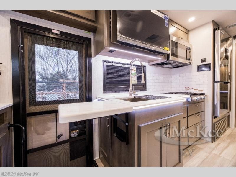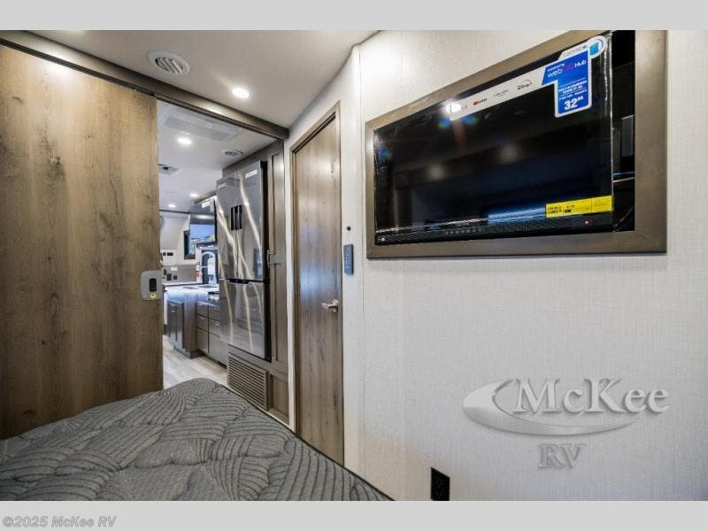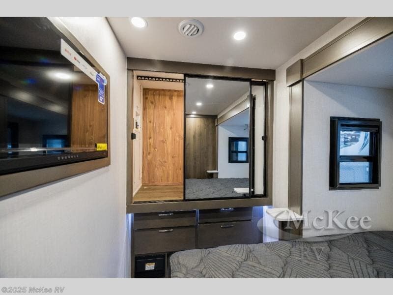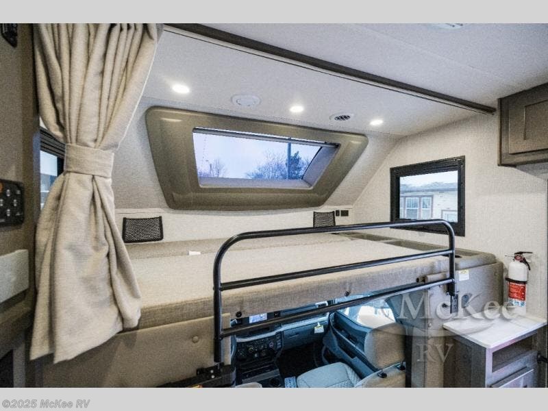 Fall in love with this motorhome bedroom's features, starting with a comfortable queen bed, perfect for a restful night's sleep. Ample storage is provided by the wardrobe and drawers, keeping your belongings organized. You can also enjoy your favorite shows and movies on the TV, or unwind in the full bathroom, complete with all the essentials. Moving to the kitchen area, the booth dinette offers a cozy spot for meals or relaxation, while the pantry provides convenient storage for snacks and supplies. The 12V refrigerator keeps your food and drinks fresh, and the convection microwave makes meal prep an easy and enjoyable task. The tri-fold sleeper sofa offers additional sleeping space for guests, and overhead cabinets provide extra storage for linens, cleaning supplies, and more. More sleeping space can be found in the bunk over the cab, which is perfect for kids or adults alike, offering a cozy sleeping nook with plenty of natural light, and when it's time to relax outside, the exterior awning provides shade and protection, allowing you to focus just on creating new memories.