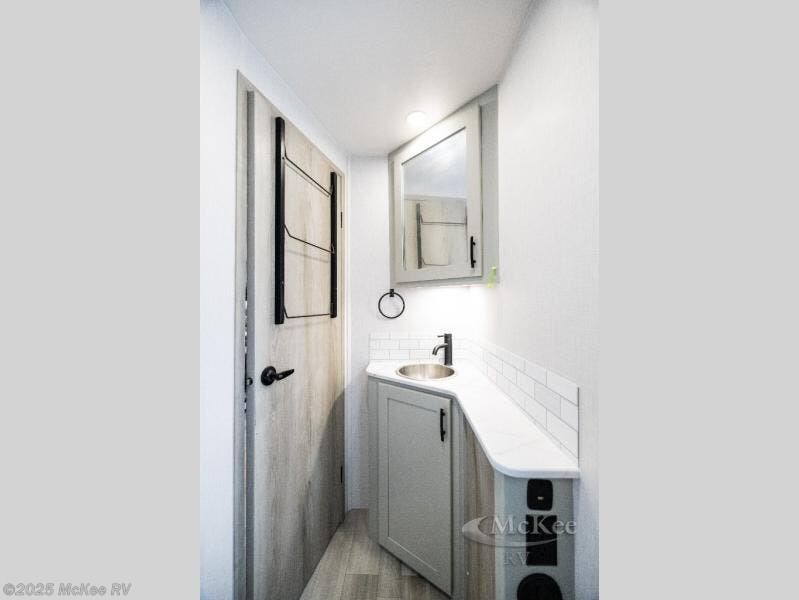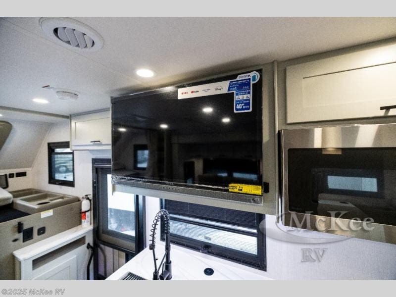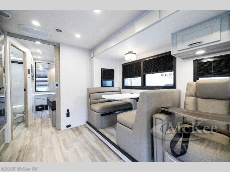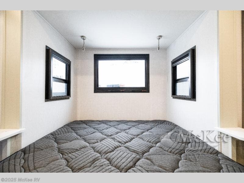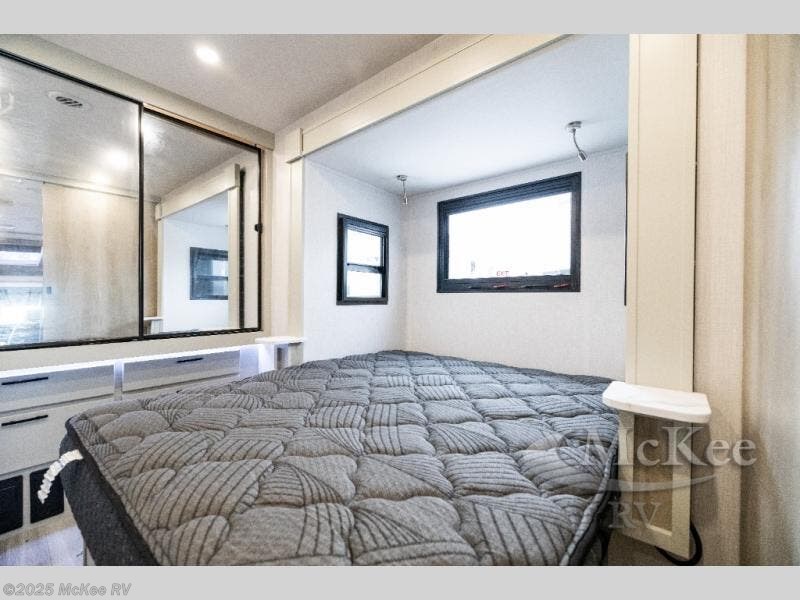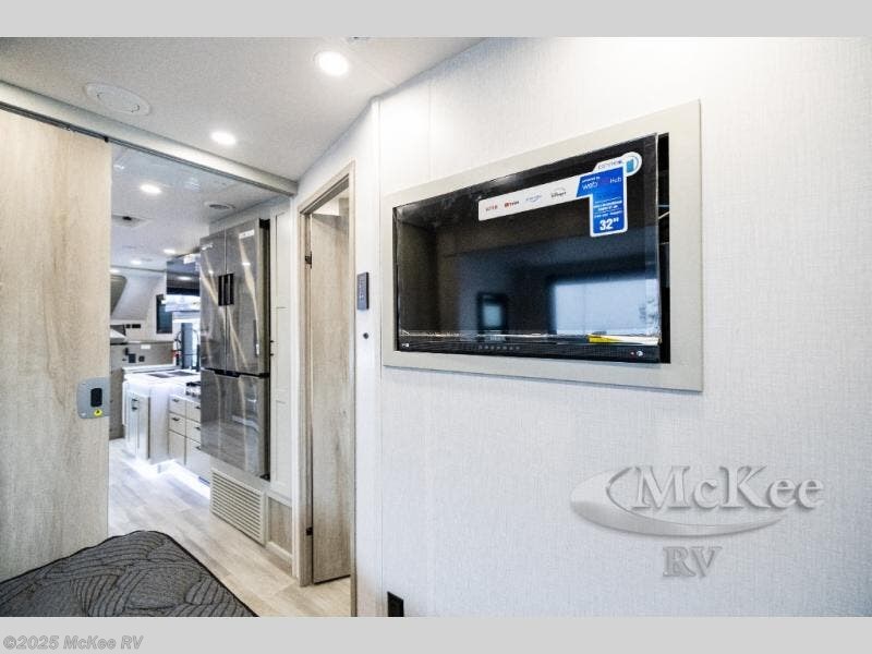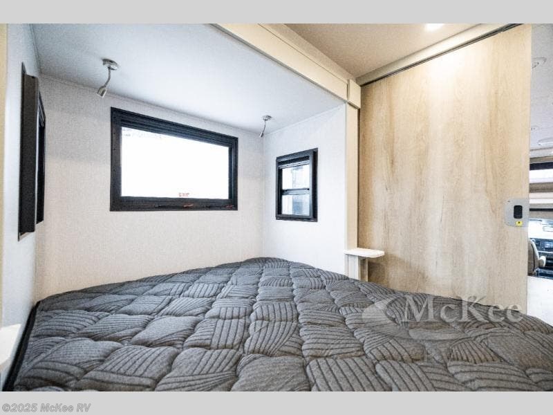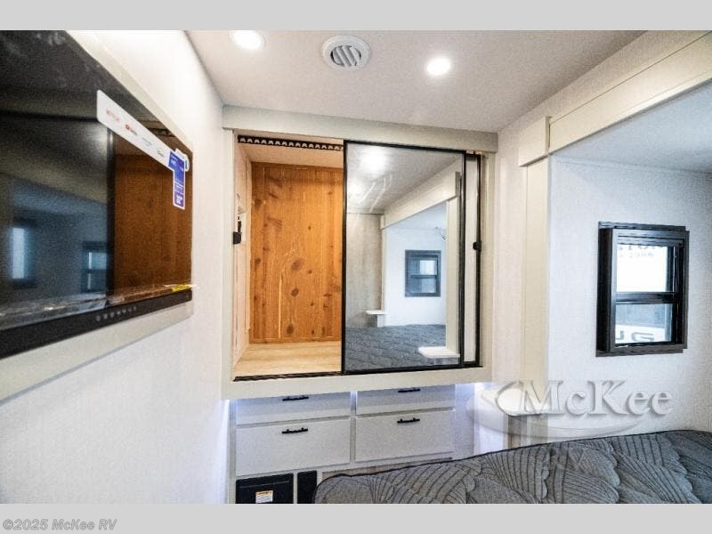 Fall in love with this motorhome bedroom's features, starting with a comfortable queen bed, perfect for a restful night's sleep. Ample storage is provided by the wardrobe and drawers, keeping your belongings organized. You can also enjoy your favorite shows and movies on the TV, or unwind in the full bathroom, complete with all the essentials. Moving to the kitchen area, the booth dinette offers a cozy spot for meals or relaxation, while the pantry provides convenient storage for snacks and supplies. The 12V refrigerator keeps your food and drinks fresh, and the convection microwave makes meal prep an easy and enjoyable task. The tri-fold sleeper sofa offers additional sleeping space for guests, and overhead cabinets provide extra storage for linens, cleaning supplies, and more. More sleeping space can be found in the bunk over the cab, which is perfect for kids or adults alike, offering a cozy sleeping nook with plenty of natural light, and when it's time to relax outside, the exterior awning provides shade and protection, allowing you to focus just on creating new memories.