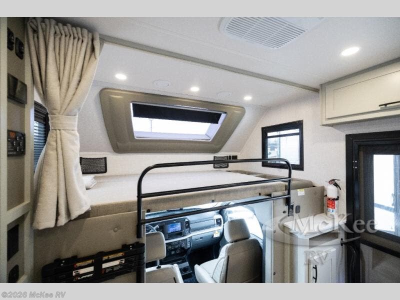 Fall in love with this motorhome bedroom's features, starting with a comfortable queen bed, perfect for a restful night's sleep. Ample storage is provided by the wardrobe and drawers, keeping your belongings organized. You can also enjoy your favorite shows and movies on the TV, or unwind in the full bathroom, complete with all the essentials. Moving to the kitchen area, the booth dinette offers a cozy spot for meals or relaxation, while the pantry provides convenient storage for snacks and supplies. The 12V refrigerator keeps your food and drinks fresh, and the convection microwave makes meal prep an easy and enjoyable task. The tri-fold sleeper sofa offers additional sleeping space for guests, and overhead cabinets provide extra storage for linens, cleaning supplies, and more. More sleeping space can be found in the bunk over the cab, which is perfect for kids or adults alike, offering a cozy sleeping nook with plenty of natural light, and when it's time to relax outside, the exterior awning provides shade and protection, allowing you to focus just on creating new memories.