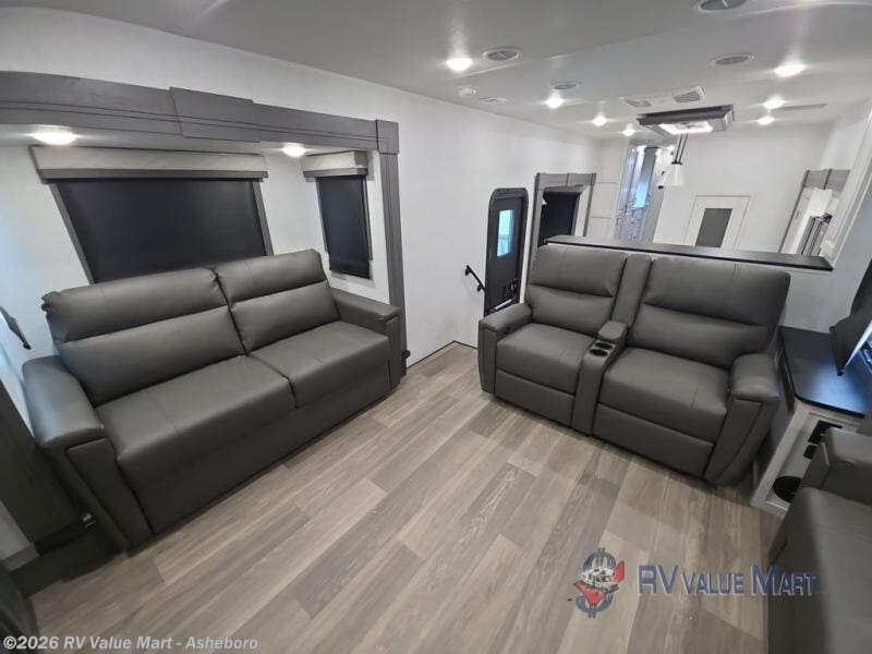 If you've been looking for a luxury fifth wheel to call your new home away from home, take a look at this Ahara! The front living area will be a favorite hangout spot with its dual hide-a-bed sofas, theater seating, and 65" TV with a fireplace. And since there are dual opposing slides here, your guests will have plenty of space to fold down the sofas at night for a great night's rest. If you're looking for your bedroom, head to the back and you'll enjoy a king bed slide out, a dresser, two closets, plus your own full rear bath. The dual bath sinks are sure to come in handy when you're both getting ready for bed, and the spacious shower with a skylight will provide natural light as you clean up in the morning. There is even a closet with washer and dryer prep if you plan to go full-time. In the morning you can prepare breakfast on the four burner cooktop or in the 30" over-the-range residential microwave, and the 16 cu. ft. 12V French door refrigerator includes a double drawer freezer to hold more food. There is a free-standing dinette, a hutch to store nice dishes, and a half bath located off of this room for convenience!