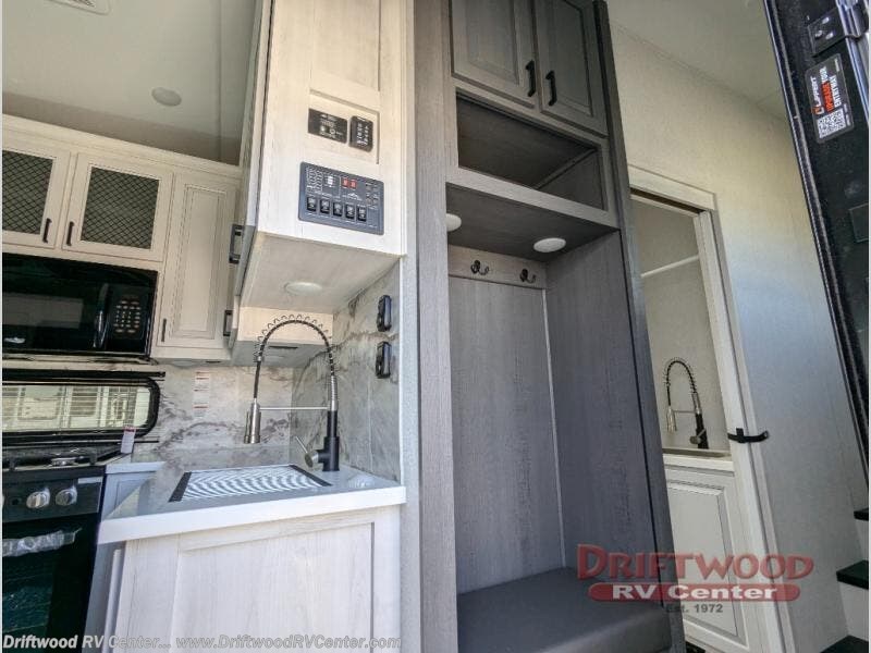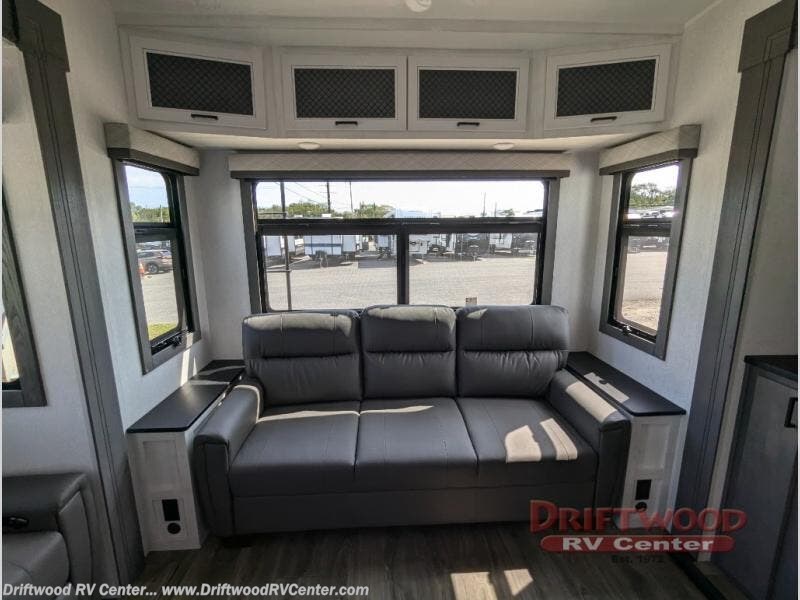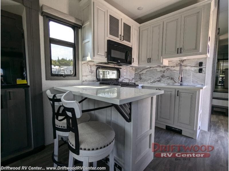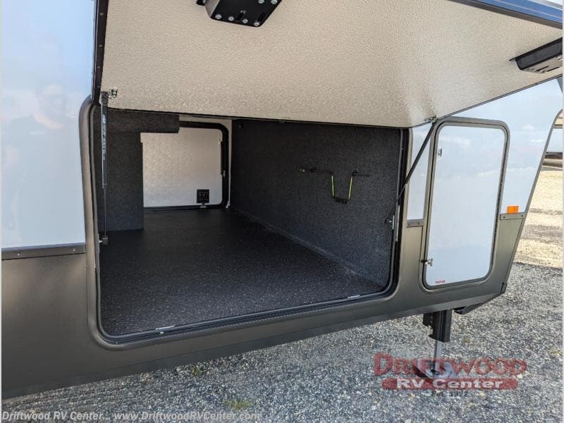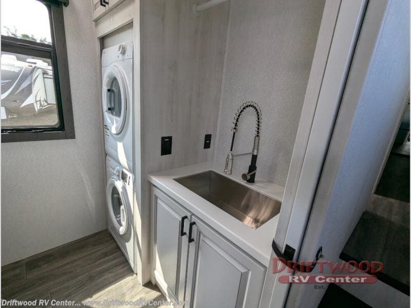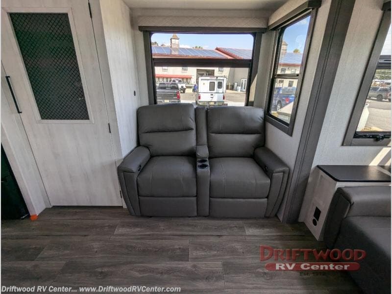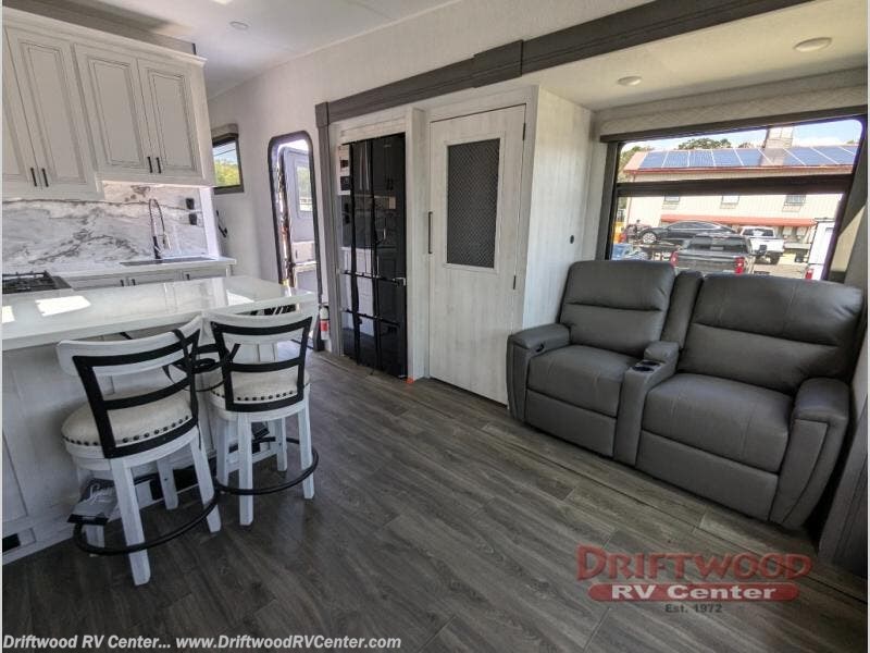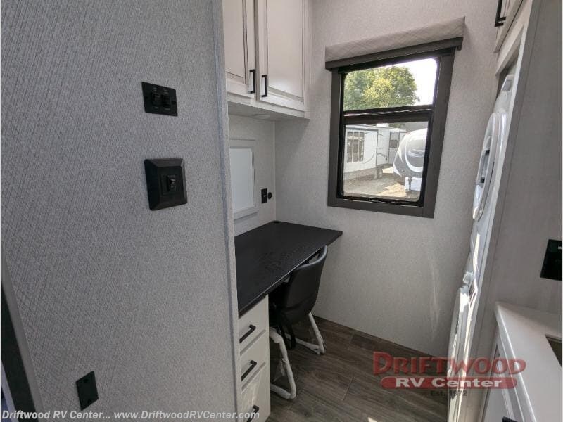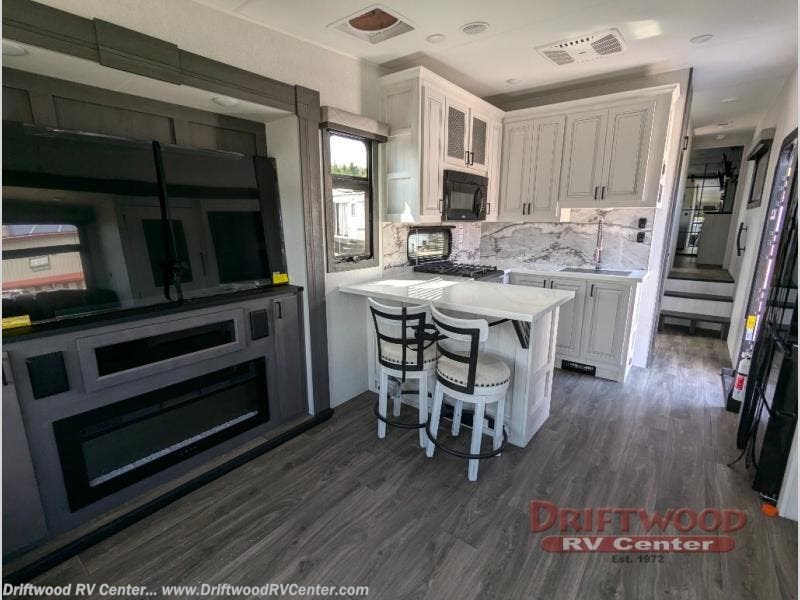 Head to the lake in this spacious fifth wheel for four! You will love the front private bedroom with a king bed slide out, sliding dresser top with hidden storage, and front closet to keep your clothes organized. The full bath is right next to the bedroom for easy access at night, and you're going to love having the utility room in this unit. There is stackable washer and dryer prep, a desk or laundry table, plus a sink with a mirror, making this room multi-functional! A full kitchen includes a u-shaped counter, a four burner range and an over-the-range microwave, plus a 16 cu. ft. refrigerator and walk-in pantry with a coffee bar and shelves. There is also a breakfast bar with seating here where you can visit with the chef while dinner is being made. Last but not least, the rear living area will be a favorite place to hang out with theater seating, a rear 78" EZ out sofa, and a TV with a fireplace!