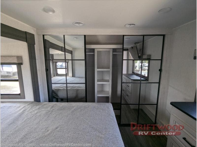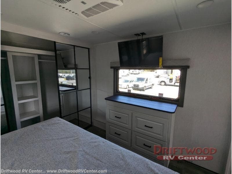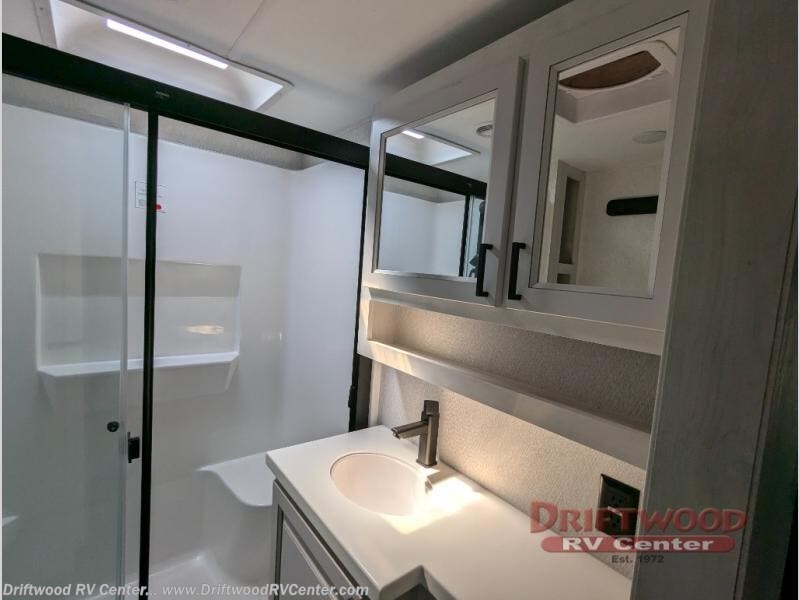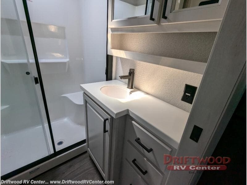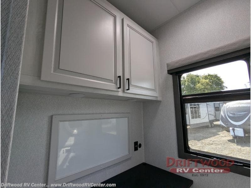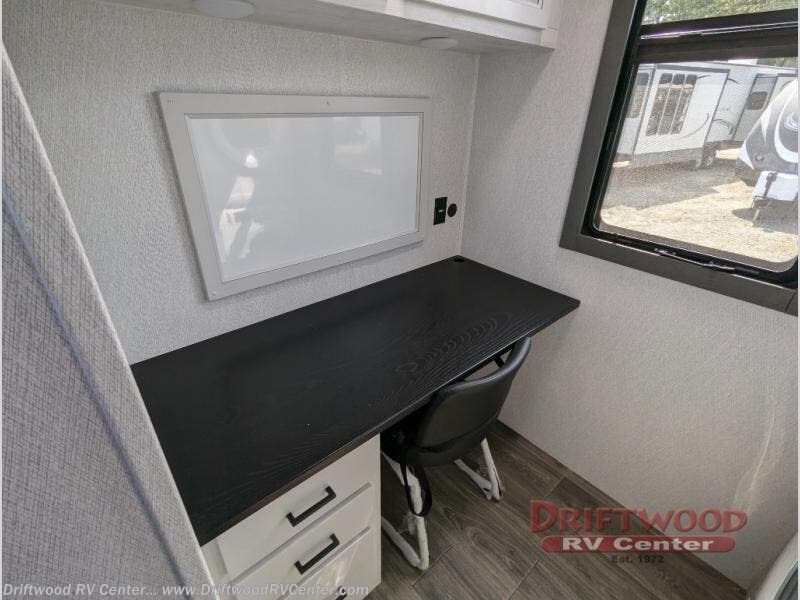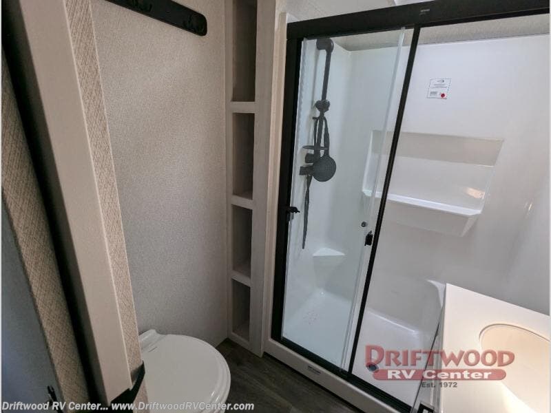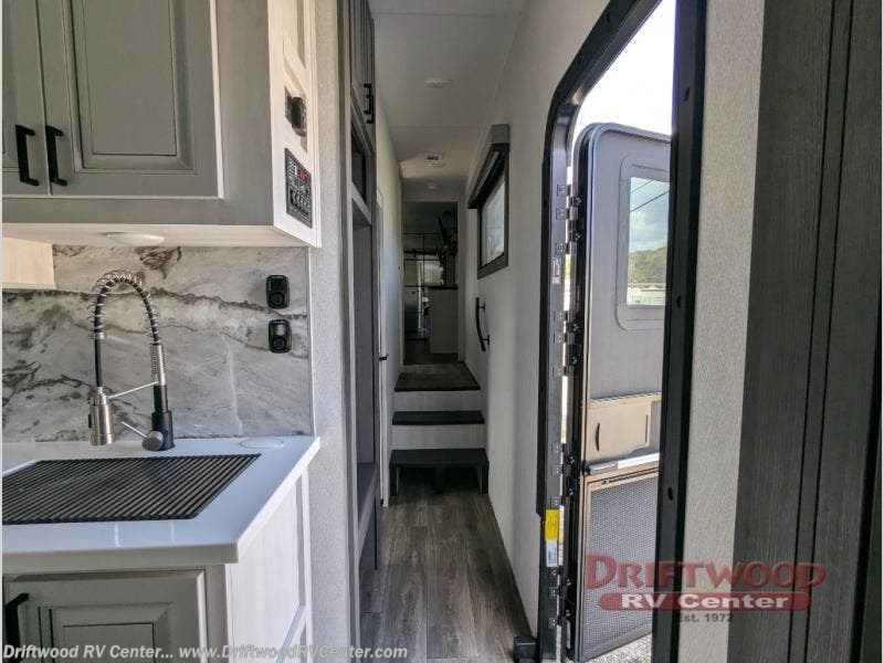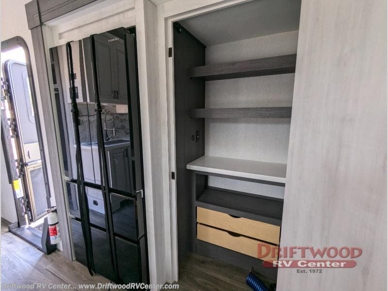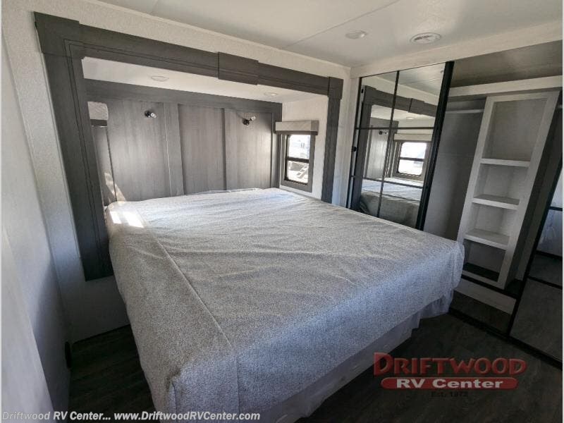 Head to the lake in this spacious fifth wheel for four! You will love the front private bedroom with a king bed slide out, sliding dresser top with hidden storage, and front closet to keep your clothes organized. The full bath is right next to the bedroom for easy access at night, and you're going to love having the utility room in this unit. There is stackable washer and dryer prep, a desk or laundry table, plus a sink with a mirror, making this room multi-functional! A full kitchen includes a u-shaped counter, a four burner range and an over-the-range microwave, plus a 16 cu. ft. refrigerator and walk-in pantry with a coffee bar and shelves. There is also a breakfast bar with seating here where you can visit with the chef while dinner is being made. Last but not least, the rear living area will be a favorite place to hang out with theater seating, a rear 78" EZ out sofa, and a TV with a fireplace!