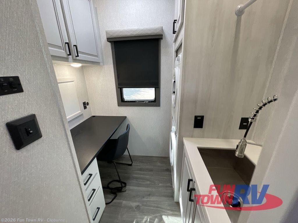 Head to the lake in this spacious fifth wheel for four! You will love the front private bedroom with a king bed slide out, sliding dresser top with hidden storage, and front closet to keep your clothes organized. The full bath is right next to the bedroom for easy access at night, and you're going to love having the utility room in this unit. There is stackable washer and dryer prep, a desk or laundry table, plus a sink with a mirror, making this room multi-functional! A full kitchen includes a u-shaped counter, a four burner range and an over-the-range microwave, plus a 16 cu. ft. refrigerator and walk-in pantry with a coffee bar and shelves. There is also a breakfast bar with seating here where you can visit with the chef while dinner is being made. Last but not least, the rear living area will be a favorite place to hang out with theater seating, a rear 78" EZ out sofa, and a TV with a fireplace!
