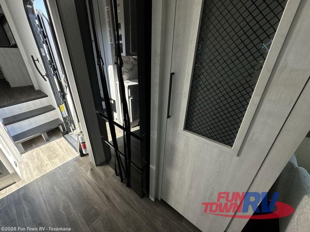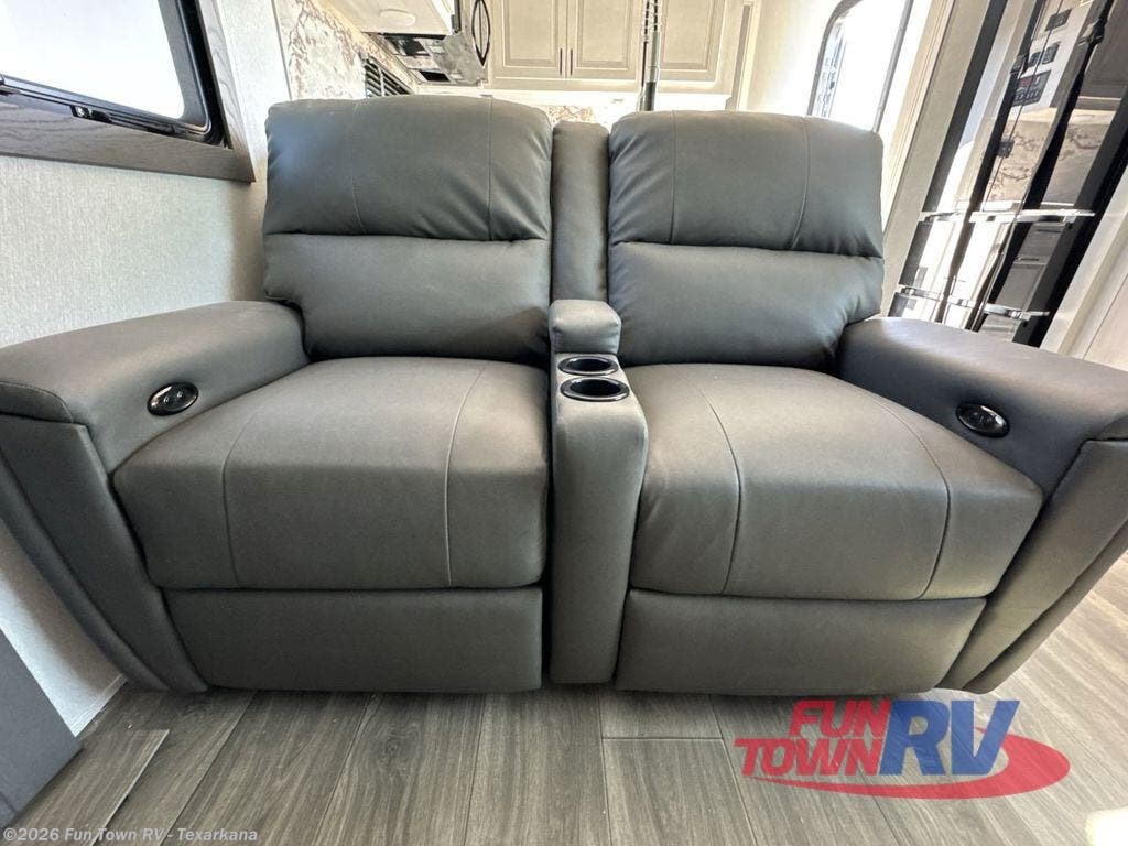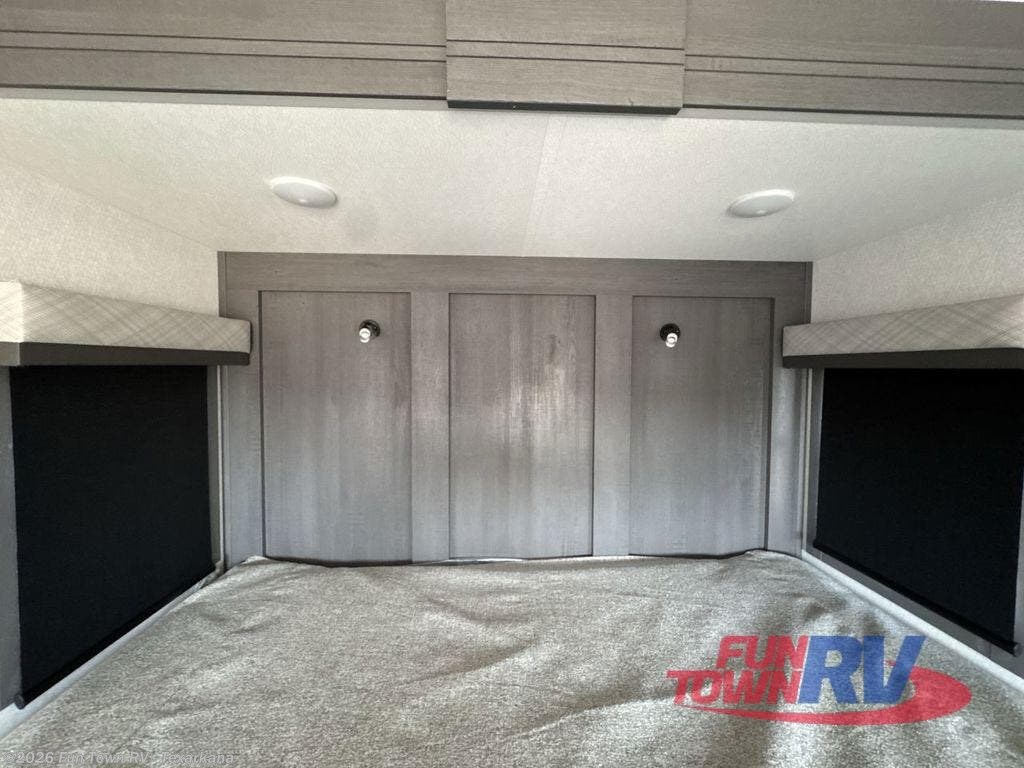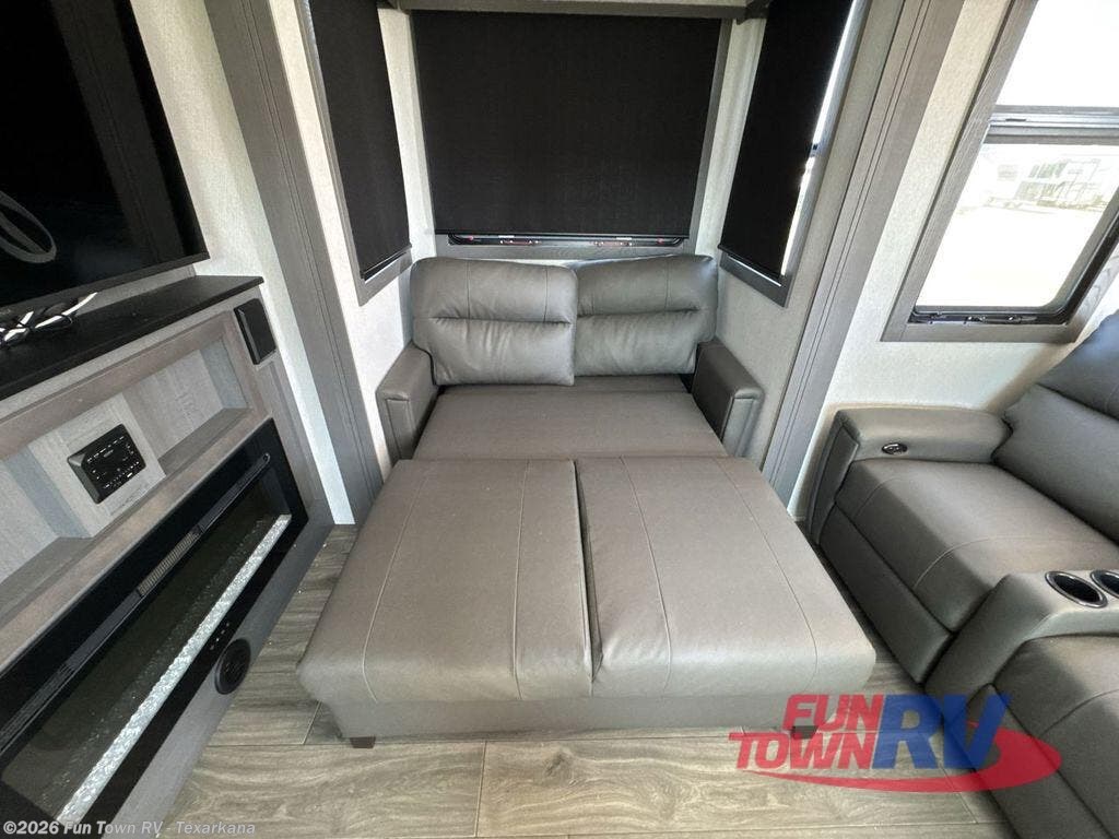 If you enjoy camping with a larger group of family or friends, this dual entry fifth wheel is for you! There is a front bedroom with a king bed slide and storage, plus a second bedroom in the back, complete with a full rear bath, a queen bed slide and storage space. A loft with a ladder is above the rear bedroom, which includes two bunk mats, loft cabinets, and TV prep if the little ones want to watch movies at night. Head to the middle of the unit to enjoy cooking on the four burner range and utilizing the generous counter space in the kitchen. There is also a walk-in pantry with a coffee bar and shelves, plus a 16 cu. ft. 12V refrigerator for food storage. Theater seating in the living room is in direct view of the TV and fireplace, and there is a tri-fold sofa slide out here as well for even more seating and sleeping space!