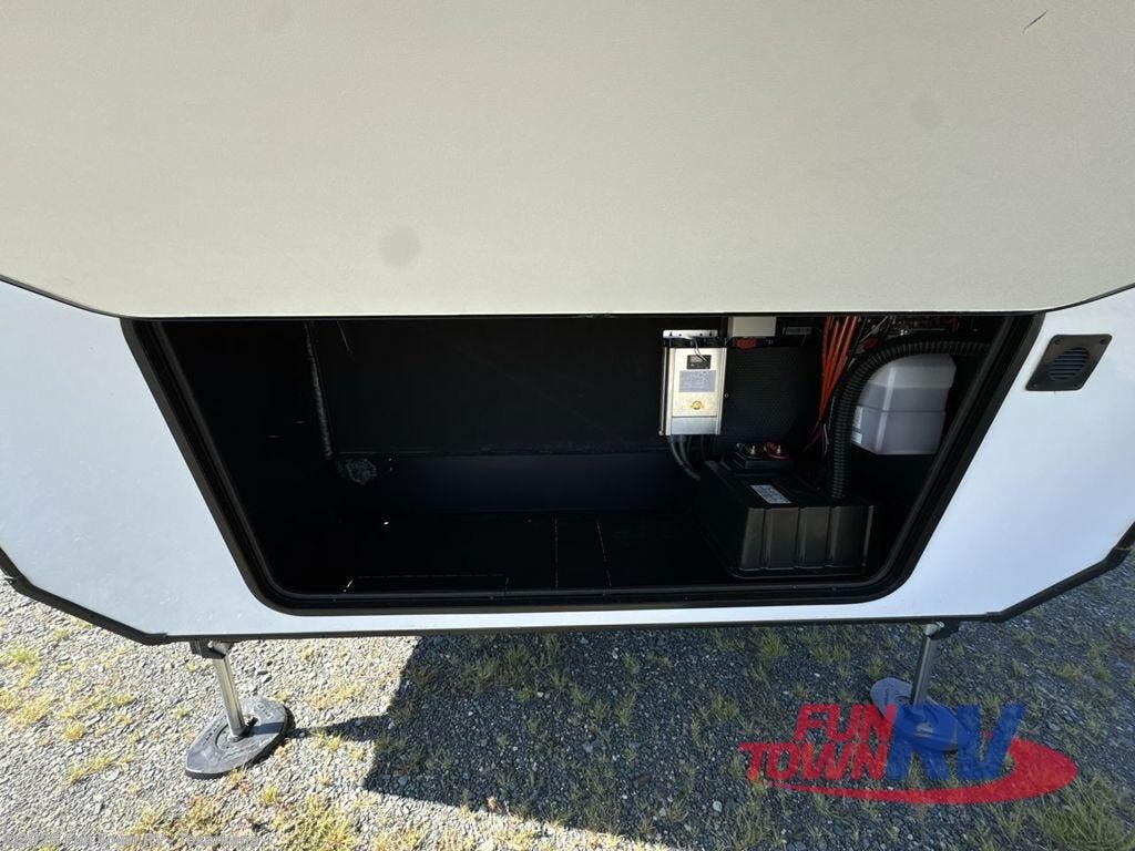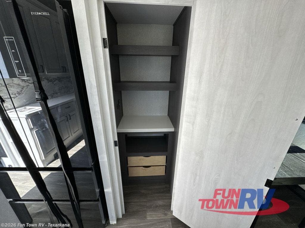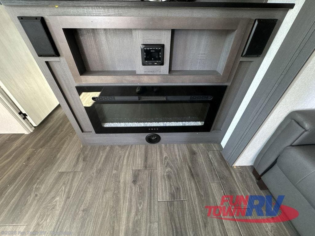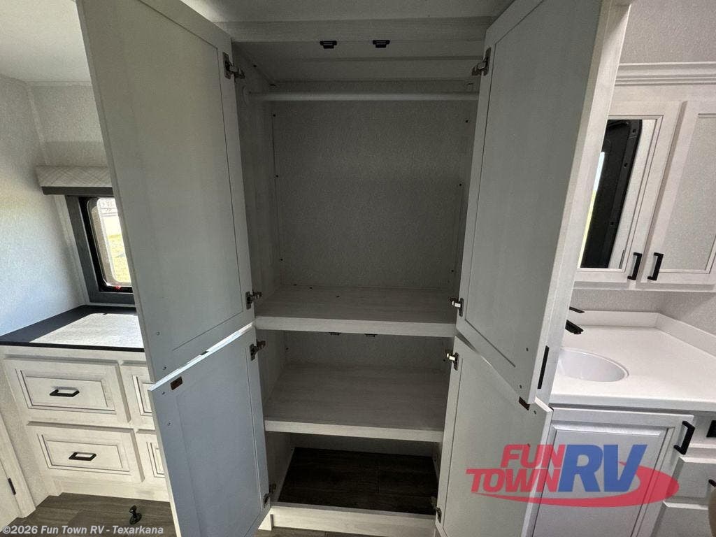 If you enjoy camping with a larger group of family or friends, this dual entry fifth wheel is for you! There is a front bedroom with a king bed slide and storage, plus a second bedroom in the back, complete with a full rear bath, a queen bed slide and storage space. A loft with a ladder is above the rear bedroom, which includes two bunk mats, loft cabinets, and TV prep if the little ones want to watch movies at night. Head to the middle of the unit to enjoy cooking on the four burner range and utilizing the generous counter space in the kitchen. There is also a walk-in pantry with a coffee bar and shelves, plus a 16 cu. ft. 12V refrigerator for food storage. Theater seating in the living room is in direct view of the TV and fireplace, and there is a tri-fold sofa slide out here as well for even more seating and sleeping space!