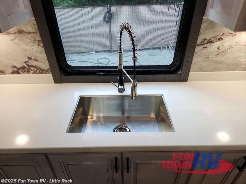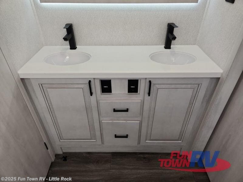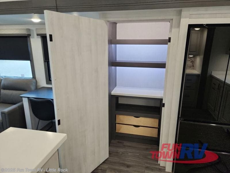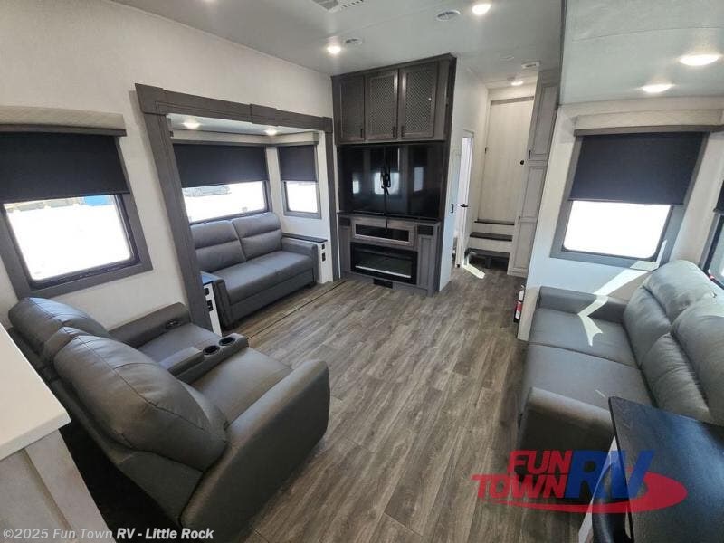 The spacious rear kitchen is equipped with a 30” microwave, 24” residential oven, overhead cabinets, breakfast bar with bar stools, walk-in pantry, and 16 cu. ft. refrigerator, perfect for cooking all your favorite dishes with the greatest convenience The living room is the heart of the home, featuring a desk with chairs, theater seating, two 60” trifold sofas, a TV with fireplace, and more. And when nature calls, you'll appreciate the convenient half bath with overhead cabinets and washer and dryer prep. The main bedroom is a serene retreat, featuring a king bed, drawers under the bed, a bedroom fireplace, and more. This is the perfect place to relax and recharge after a long day of adventure, and with a front full bathroom featuring a 30” x 40” shower, dual sink vanity, walk-in closet, dresser/drawers, you'll have everything you need to stay clean and comfortable on the go. Outside, you'll find not one, but two awnings to providing plenty of shade and protection from the elements.