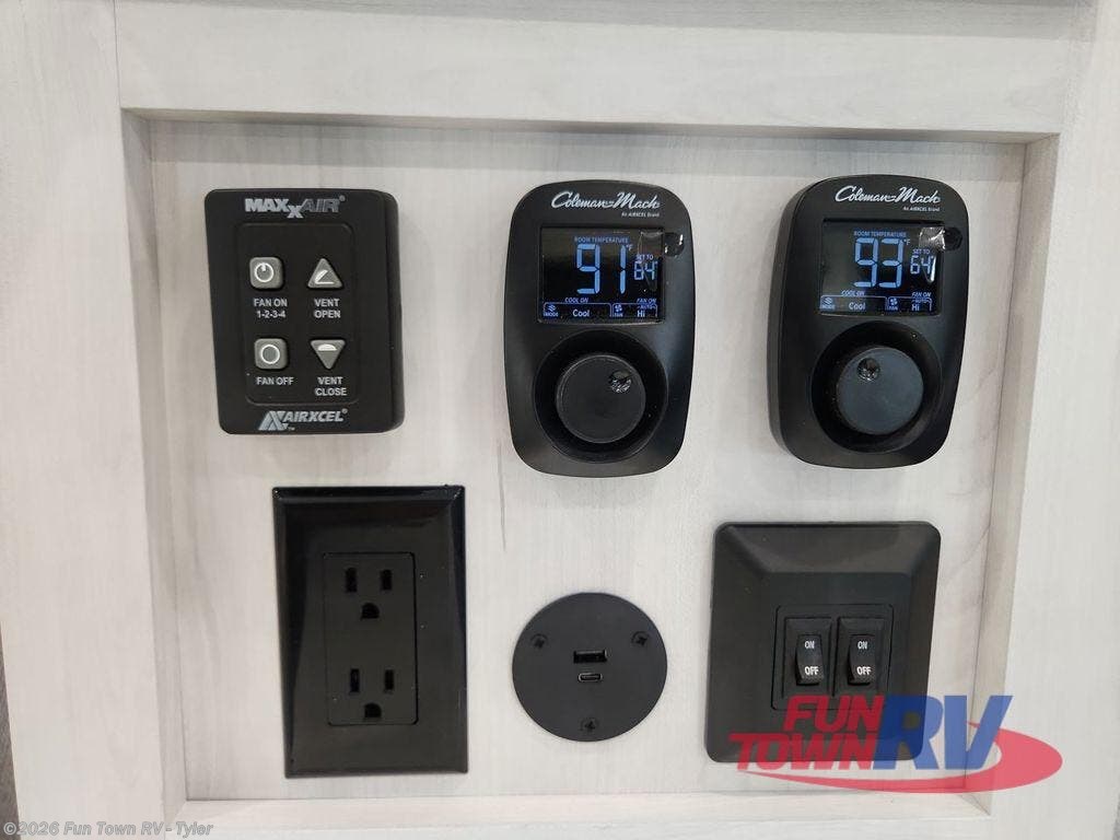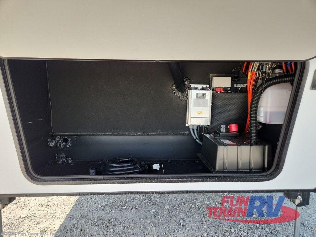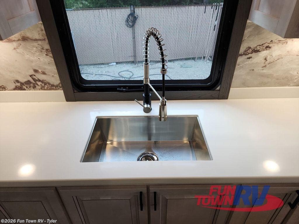 The spacious rear kitchen is equipped with a 30” microwave, 24” residential oven, overhead cabinets, breakfast bar with bar stools, walk-in pantry, and 16 cu. ft. refrigerator, perfect for cooking all your favorite dishes with the greatest convenience The living room is the heart of the home, featuring a desk with chairs, theater seating, two 60” trifold sofas, a TV with fireplace, and more. And when nature calls, you'll appreciate the convenient half bath with overhead cabinets and washer and dryer prep. The main bedroom is a serene retreat, featuring a king bed, drawers under the bed, a bedroom fireplace, and more. This is the perfect place to relax and recharge after a long day of adventure, and with a front full bathroom featuring a 30” x 40” shower, dual sink vanity, walk-in closet, dresser/drawers, you'll have everything you need to stay clean and comfortable on the go. Outside, you'll find not one, but two awnings to providing plenty of shade and protection from the elements.