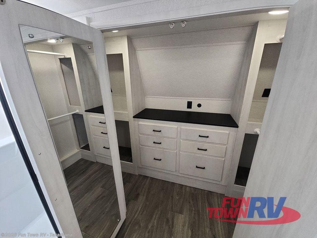 The spacious rear kitchen is equipped with a 30” microwave, 24” residential oven, overhead cabinets, breakfast bar with bar stools, walk-in pantry, and 16 cu. ft. refrigerator, perfect for cooking all your favorite dishes with the greatest convenience The living room is the heart of the home, featuring a desk with chairs, theater seating, two 60” trifold sofas, a TV with fireplace, and more. And when nature calls, you'll appreciate the convenient half bath with overhead cabinets and washer and dryer prep. The main bedroom is a serene retreat, featuring a king bed, drawers under the bed, a bedroom fireplace, and more. This is the perfect place to relax and recharge after a long day of adventure, and with a front full bathroom featuring a 30” x 40” shower, dual sink vanity, walk-in closet, dresser/drawers, you'll have everything you need to stay clean and comfortable on the go. Outside, you'll find not one, but two awnings to providing plenty of shade and protection from the elements.