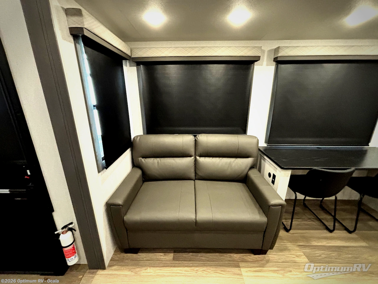 The spacious rear kitchen is equipped with a 30” microwave, 24” residential oven, overhead cabinets, breakfast bar with bar stools, walk-in pantry, and 16 cu. ft. refrigerator, perfect for cooking all your favorite dishes with the greatest convenience The living room is the heart of the home, featuring a desk with chairs, theater seating, two 60” trifold sofas, a TV with fireplace, and more. And when nature calls, you'll appreciate the convenient half bath with overhead cabinets and washer and dryer prep. The main bedroom is a serene retreat, featuring a king bed, drawers under the bed, a bedroom fireplace, and more. This is the perfect place to relax and recharge after a long day of adventure, and with a front full bathroom featuring a 30” x 40” shower, dual sink vanity, walk-in closet, dresser/drawers, you'll have everything you need to stay clean and comfortable on the go. Outside, you'll find not one, but two awnings to providing plenty of shade and protection from the elements.