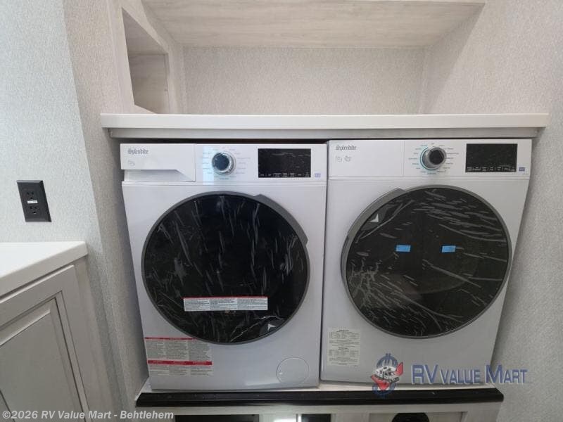 The spacious rear kitchen is equipped with a 30” microwave, 24” residential oven, overhead cabinets, breakfast bar with bar stools, walk-in pantry, and 16 cu. ft. refrigerator, perfect for cooking all your favorite dishes with the greatest convenience The living room is the heart of the home, featuring a desk with chairs, theater seating, two 60” trifold sofas, a TV with fireplace, and more. And when nature calls, you'll appreciate the convenient half bath with overhead cabinets and washer and dryer prep. The main bedroom is a serene retreat, featuring a king bed, drawers under the bed, a bedroom fireplace, and more. This is the perfect place to relax and recharge after a long day of adventure, and with a front full bathroom featuring a 30” x 40” shower, dual sink vanity, walk-in closet, dresser/drawers, you'll have everything you need to stay clean and comfortable on the go. Outside, you'll find not one, but two awnings to providing plenty of shade and protection from the elements.
