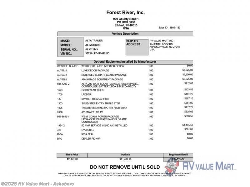 Request More Info on this 2026 East to West Alta 2600KRB Offered for sale by RV Value Mart - Asheboro
