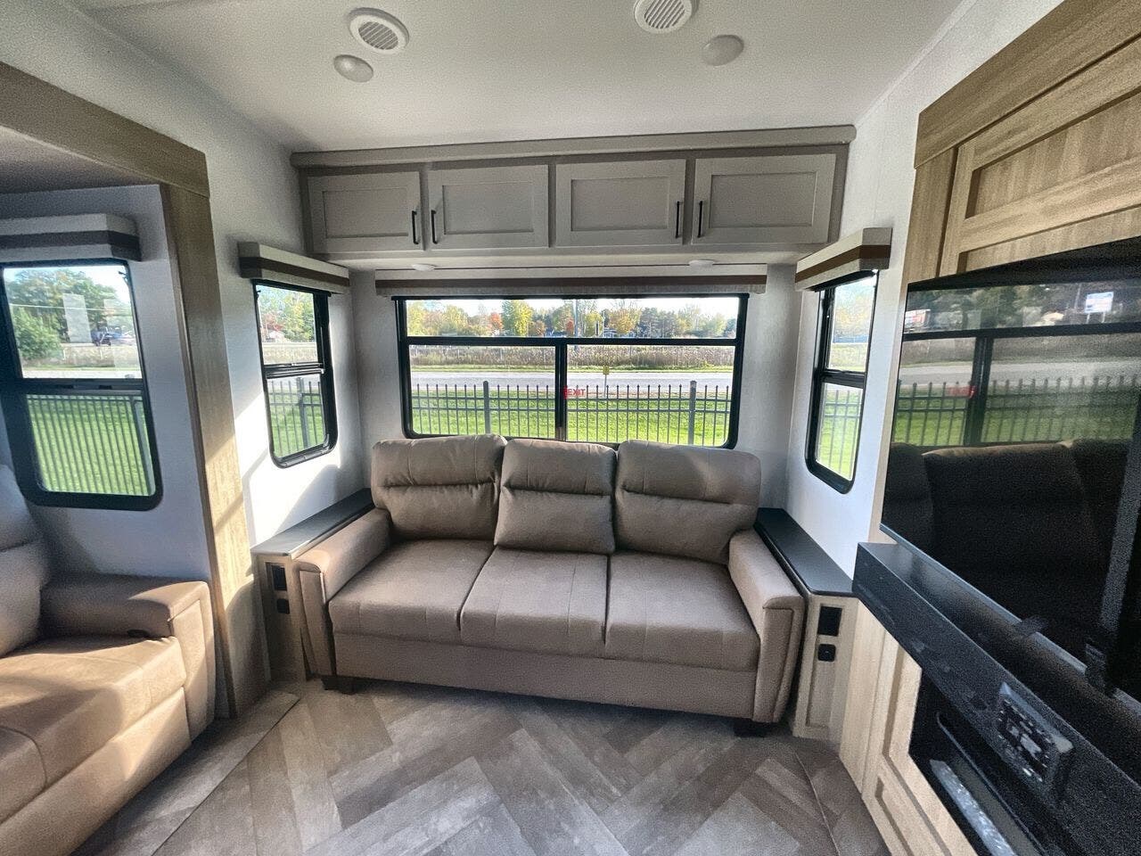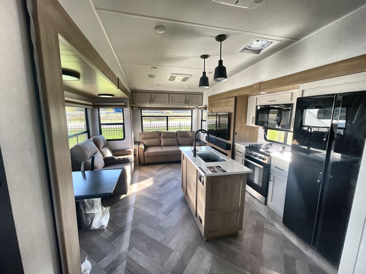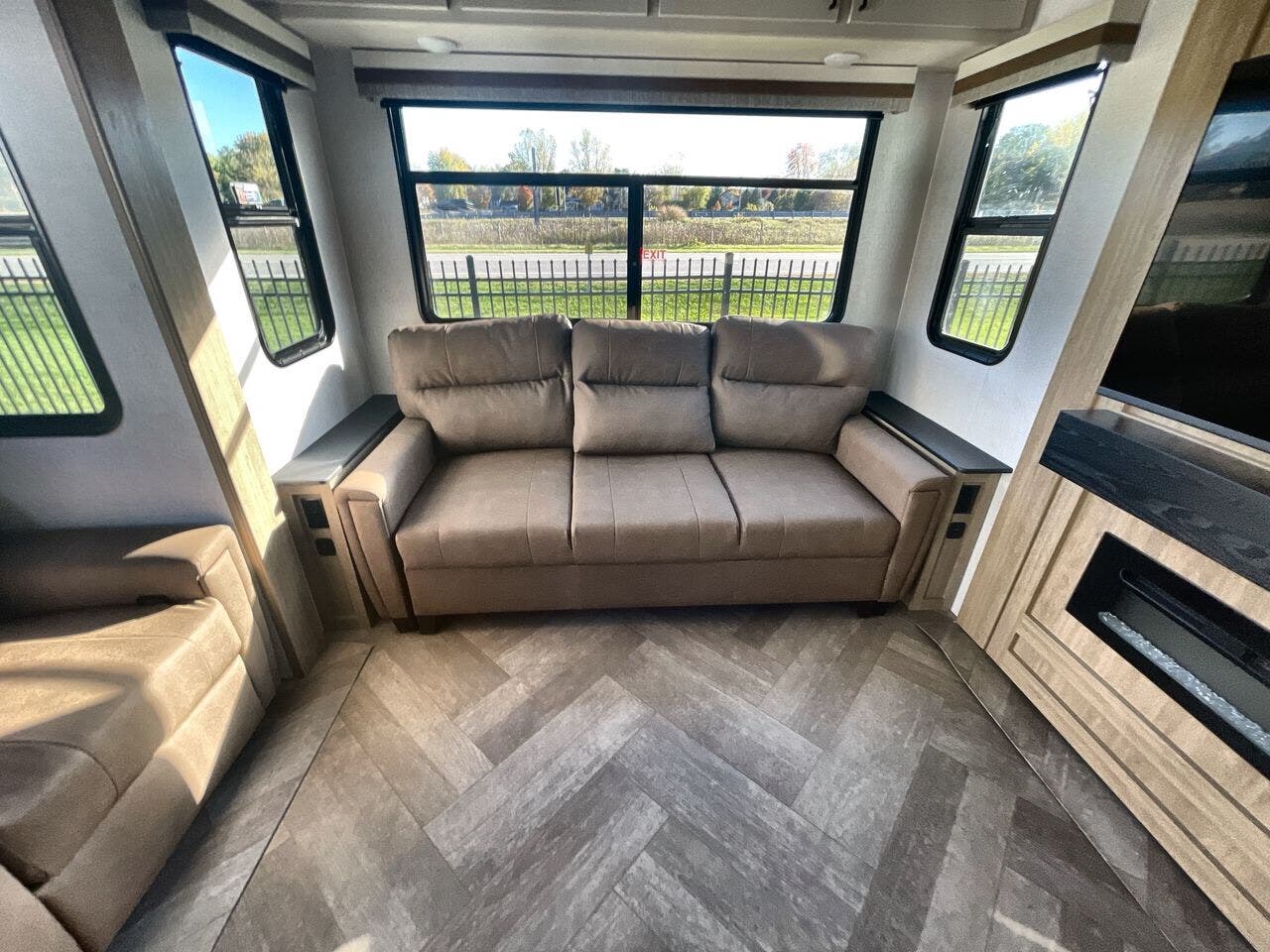 This Blackhorn fifth wheel offers a spacious and well-thought-out layout designed for comfort and convenience. At the front, you'll find a fully equipped bedroom with a king-size bed for a restful night's sleep, along with both a wardrobe and dresser to store all your clothes and essentials. There's also washer and dryer prep included. Just steps away is a full-size bathroom, allowing easy access between the bedroom and the main living area. At the rear, the large living space is enhanced by dual opposing slides, one side includes cozy theater seating and a free-standing dinette perfect for meals or relaxing in the evening. Opposite that, a kitchen island sits in the middle, and the other slide has the entertainment center and fireplace, with a hidden pantry tucked behind for extra storage. The kitchen is chef-ready with a 4-burner range and a spacious 16-cubic-foot refrigerator. At the rear is a hide-a-bed sofa along the back wall, which pulls out into a queen-size bed for additional sleeping space!