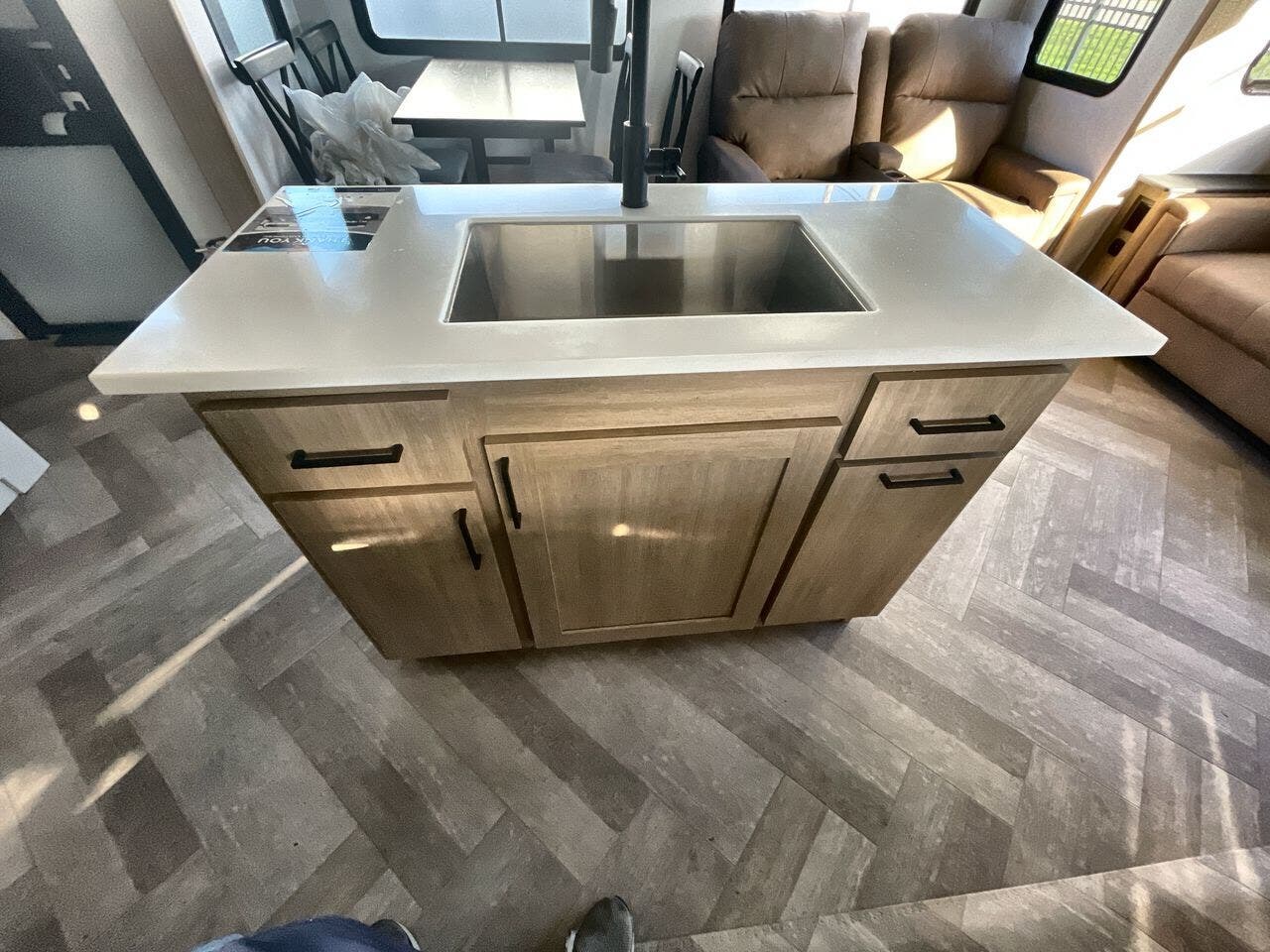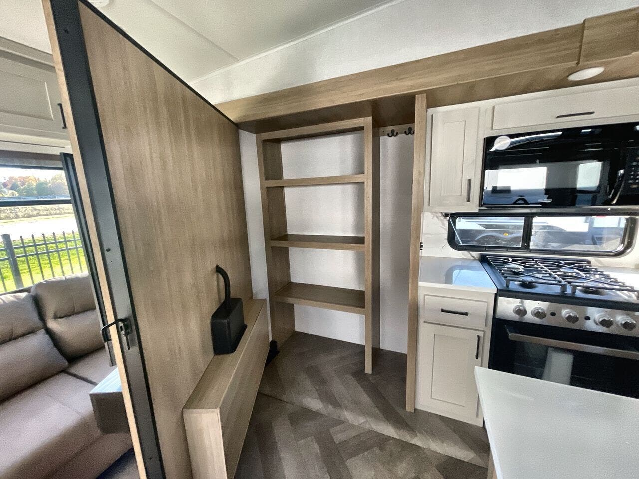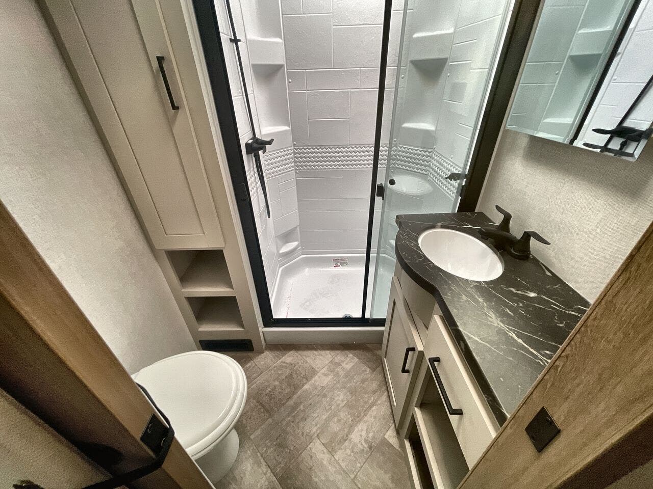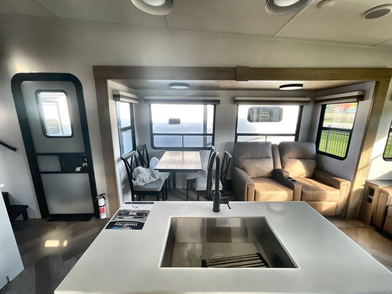 This Blackhorn fifth wheel offers a spacious and well-thought-out layout designed for comfort and convenience. At the front, you'll find a fully equipped bedroom with a king-size bed for a restful night's sleep, along with both a wardrobe and dresser to store all your clothes and essentials. There's also washer and dryer prep included. Just steps away is a full-size bathroom, allowing easy access between the bedroom and the main living area. At the rear, the large living space is enhanced by dual opposing slides, one side includes cozy theater seating and a free-standing dinette perfect for meals or relaxing in the evening. Opposite that, a kitchen island sits in the middle, and the other slide has the entertainment center and fireplace, with a hidden pantry tucked behind for extra storage. The kitchen is chef-ready with a 4-burner range and a spacious 16-cubic-foot refrigerator. At the rear is a hide-a-bed sofa along the back wall, which pulls out into a queen-size bed for additional sleeping space!