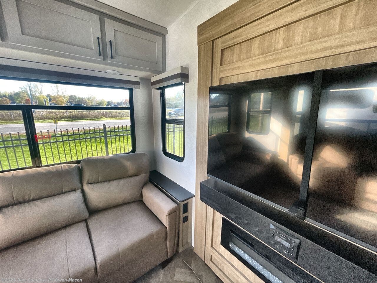 This Blackhorn fifth wheel offers a spacious and well-thought-out layout designed for comfort and convenience. At the front, you'll find a fully equipped bedroom with a king-size bed for a restful night's sleep, along with both a wardrobe and dresser to store all your clothes and essentials. There's also washer and dryer prep included. Just steps away is a full-size bathroom, allowing easy access between the bedroom and the main living area. At the rear, the large living space is enhanced by dual opposing slides, one side includes cozy theater seating and a free-standing dinette perfect for meals or relaxing in the evening. Opposite that, a kitchen island sits in the middle, and the other slide has the entertainment center and fireplace, with a hidden pantry tucked behind for extra storage. The kitchen is chef-ready with a 4-burner range and a spacious 16-cubic-foot refrigerator. At the rear is a hide-a-bed sofa along the back wall, which pulls out into a queen-size bed for additional sleeping space!