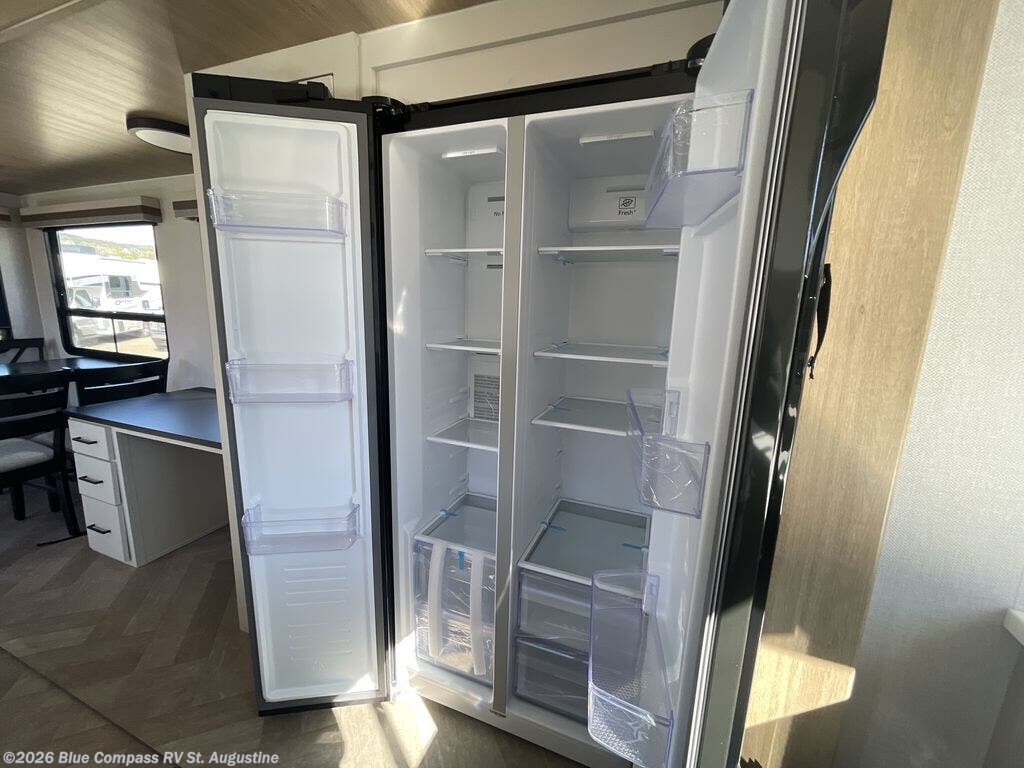 At the front of this Blackthorn fifth wheel, you'll find a spacious master bedroom featuring a comfortable king-sized bed with storage underneath, as well as a dresser and wardrobe to keep all your clothes and essentials organized. Just next door is the full bathroom, equipped with a shower, linen shelves, and a sink with counter space. At the rear, the kitchen and main living area invite relaxation and entertainment with a hide-a-bed sofa slide-out, theater seating, and an entertainment center perfect for movie nights. Enjoy meals at the free-standing dinette or catch up on work at the built-in desk nearby. A pantry with coffee station adds a cozy morning touch, while the U-shaped kitchen at the very back offers ample counter space, overhead storage, a 16-cu. ft. fridge, and a 4-burner range—ideal for prepping and cooking with ease.