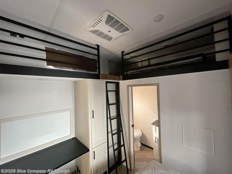 At the front of this fifth wheel, you'll find one of the two bedrooms, featuring a spacious king bed with convenient storage underneath, perfect for extra bedding or travel gear. This room also includes a dresser and a full wardrobe, providing plenty of space for clothes. Just next to the bedroom is one of the two full bathrooms, equipped with a shower, toilet, and a linen closet to keep all your essentials. The center has the main living area opens up with dual opposing slide-outs, creating a roomy and inviting space to relax or entertain. One slide has the comfortable theater seating and a free-standing dinette, ideal for dining or game nights. Across from this, we have the island, an entertainment center with a fireplace and 50-inch TV, plus a hidden pantry for added storage. The kitchen is fully equipped with a 4-burner range and a 16 cubic ft. refrigerator. At the rear is the second bedroom, with a power tilt queen bed, a built-in desk perfect for remote work or study, and an overhead loft area offering additional sleeping or storage space. This bedroom also includes its own private full bathroom and a separate entry door, providing both convenience and privacy.