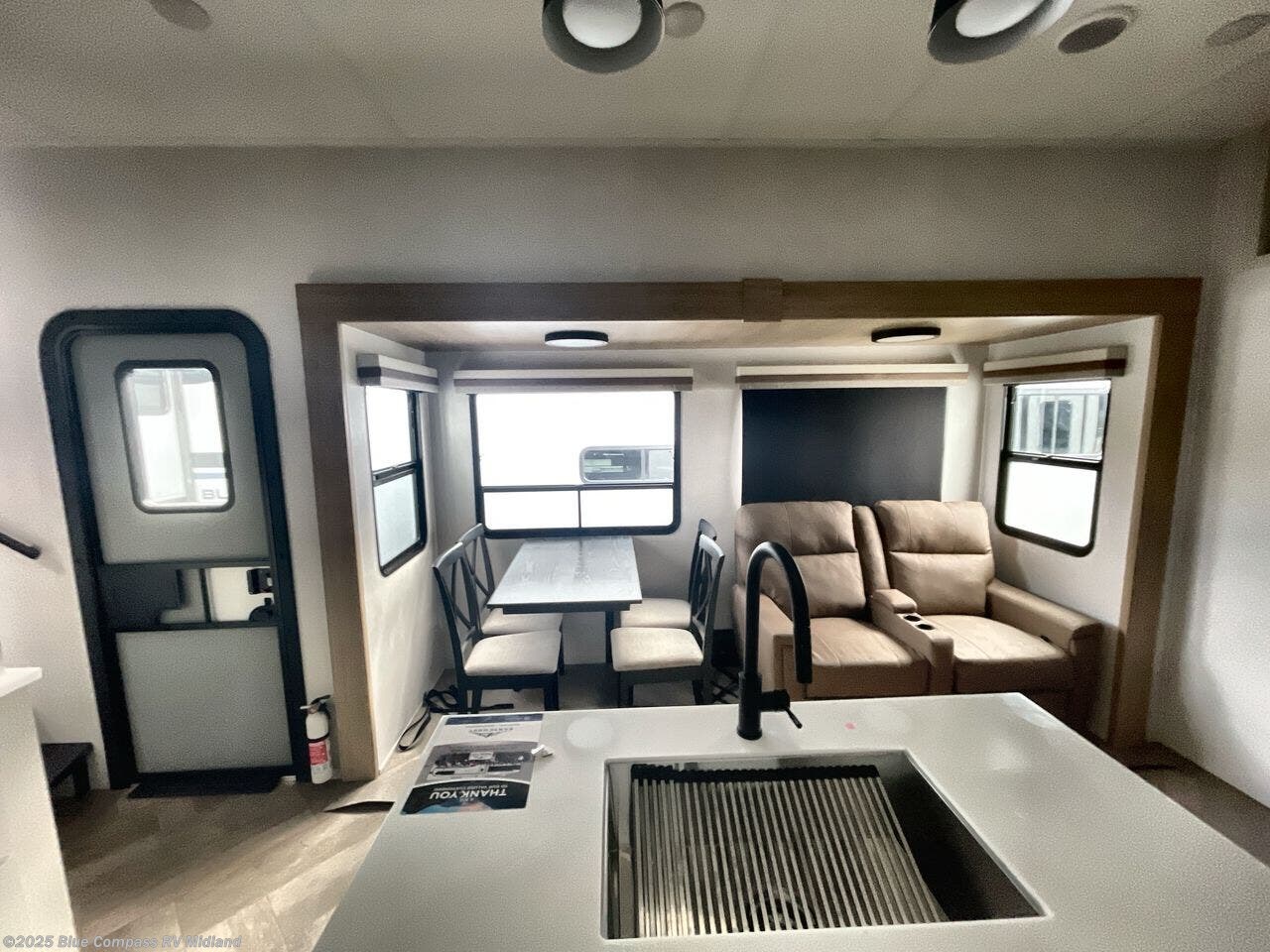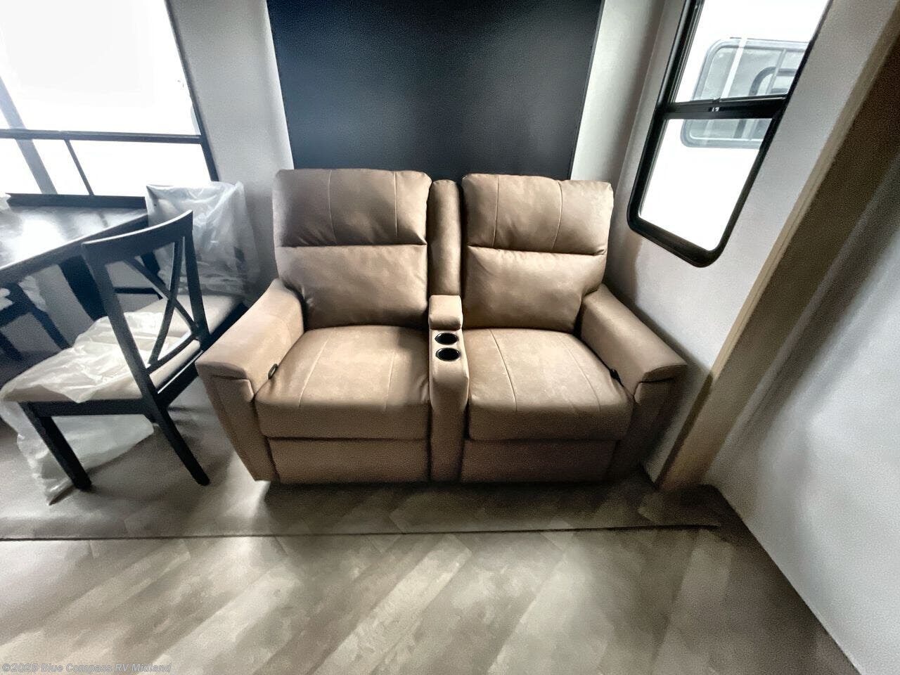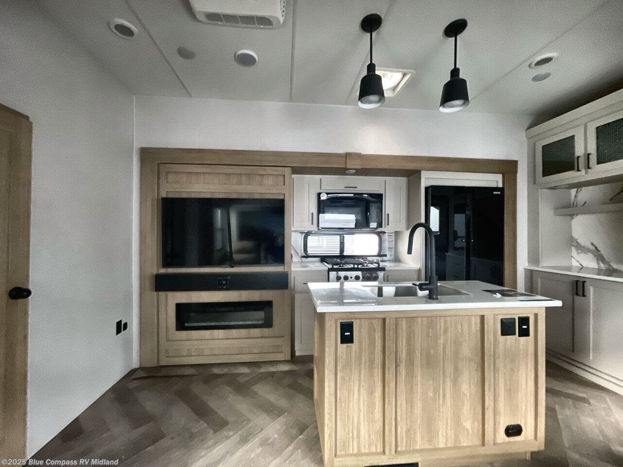 At the front of this fifth wheel, you'll find one of the two bedrooms, featuring a spacious king bed with convenient storage underneath, perfect for extra bedding or travel gear. This room also includes a dresser and a full wardrobe, providing plenty of space for clothes. Just next to the bedroom is one of the two full bathrooms, equipped with a shower, toilet, and a linen closet to keep all your essentials. The center has the main living area opens up with dual opposing slide-outs, creating a roomy and inviting space to relax or entertain. One slide has the comfortable theater seating and a free-standing dinette, ideal for dining or game nights. Across from this, we have the island, an entertainment center with a fireplace and 50-inch TV, plus a hidden pantry for added storage. The kitchen is fully equipped with a 4-burner range and a 16 cubic ft. refrigerator. At the rear is the second bedroom, with a power tilt queen bed, a built-in desk perfect for remote work or study, and an overhead loft area offering additional sleeping or storage space. This bedroom also includes its own private full bathroom and a separate entry door, providing both convenience and privacy.