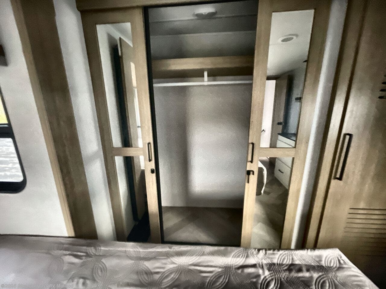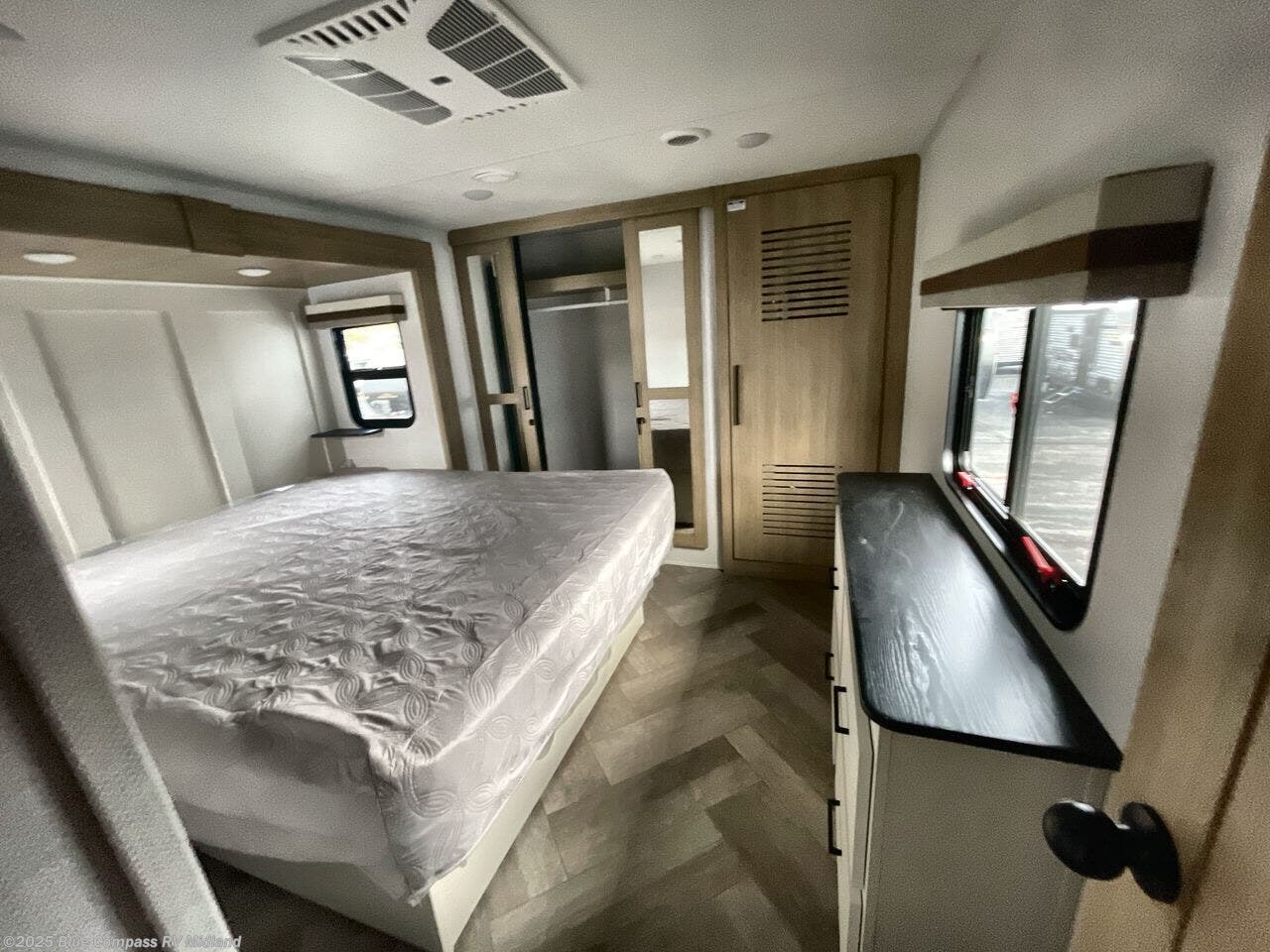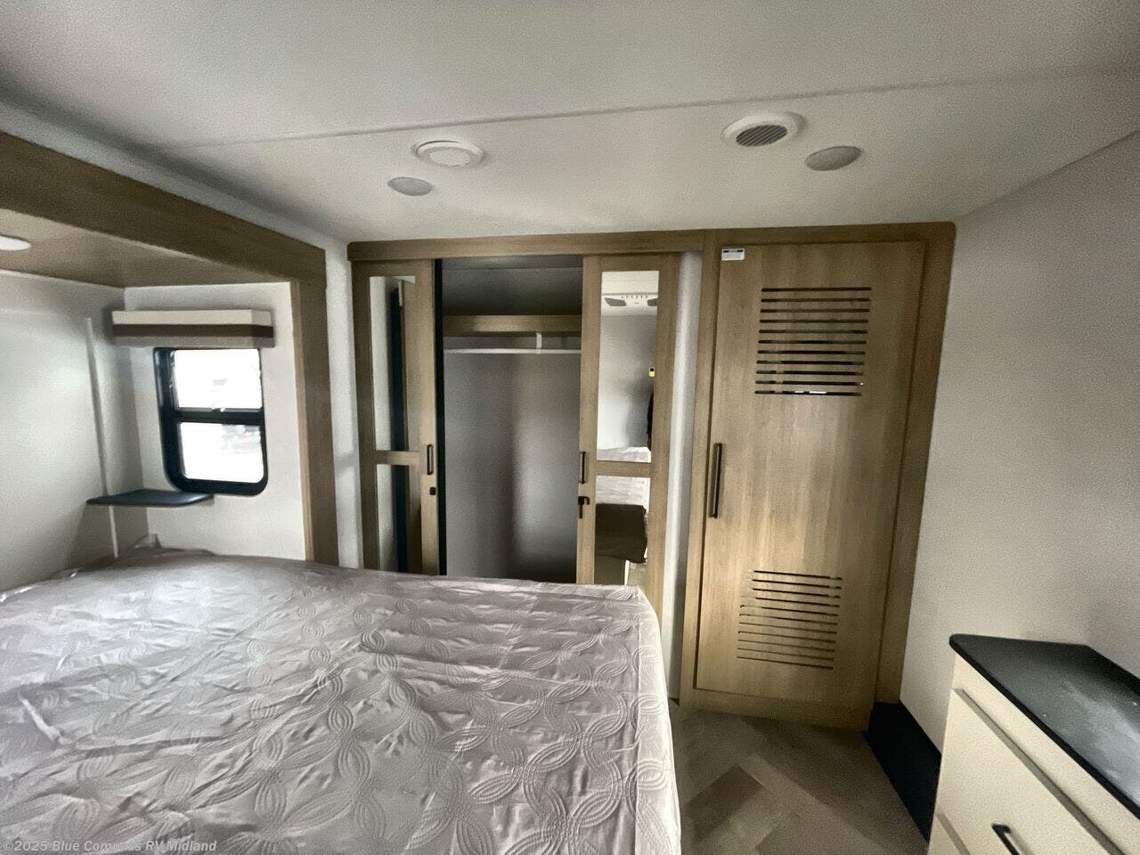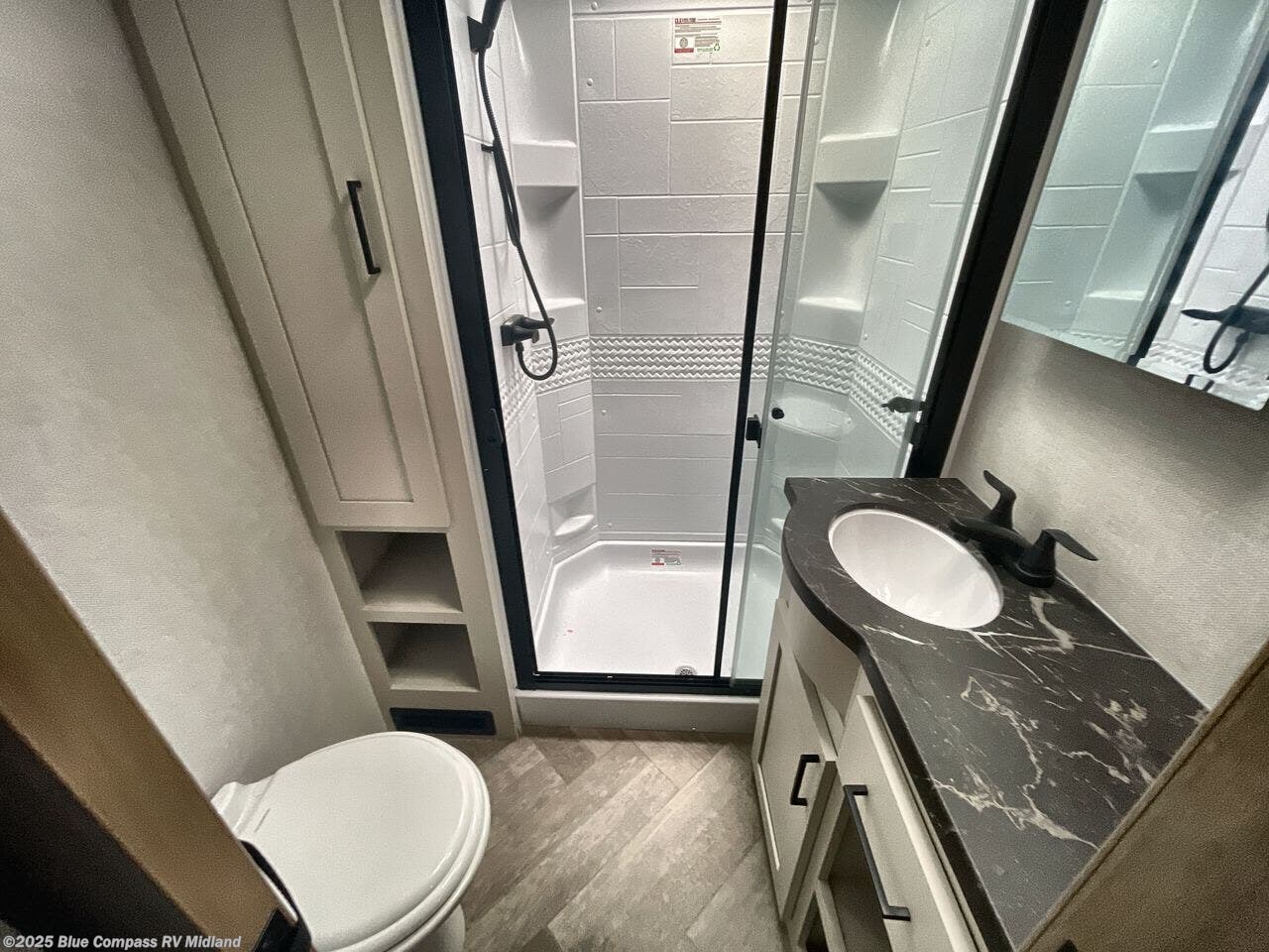At the front of this fifth wheel, you'll find one of the two bedrooms, featuring a spacious king bed with convenient storage underneath, perfect for extra bedding or travel gear. This room also includes a dresser and a full wardrobe, providing plenty of space for clothes. Just next to the bedroom is one of the two full bathrooms, equipped with a shower, toilet, and a linen closet to keep all your essentials. The center has the main living area opens up with dual opposing slide-outs, creating a roomy and inviting space to relax or entertain. One slide has the comfortable theater seating and a free-standing dinette, ideal for dining or game nights. Across from this, we have the island, an entertainment center with a fireplace and 50-inch TV, plus a hidden pantry for added storage. The kitchen is fully equipped with a 4-burner range and a 16 cubic ft. refrigerator. At the rear is the second bedroom, with a power tilt queen bed, a built-in desk perfect for remote work or study, and an overhead loft area offering additional sleeping or storage space. This bedroom also includes its own private full bathroom and a separate entry door, providing both convenience and privacy.