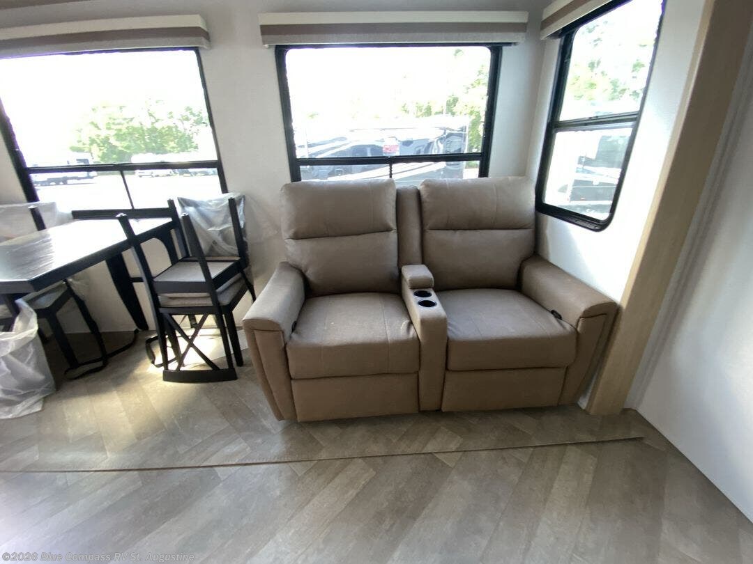 At the front of this fifth wheel, you'll find one of the two bedrooms, featuring a spacious king bed with convenient storage underneath, perfect for extra bedding or travel gear. This room also includes a dresser and a full wardrobe, providing plenty of space for clothes. Just next to the bedroom is one of the two full bathrooms, equipped with a shower, toilet, and a linen closet to keep all your essentials. The center has the main living area opens up with dual opposing slide-outs, creating a roomy and inviting space to relax or entertain. One slide has the comfortable theater seating and a free-standing dinette, ideal for dining or game nights. Across from this, we have the island, an entertainment center with a fireplace and 50-inch TV, plus a hidden pantry for added storage. The kitchen is fully equipped with a 4-burner range and a 16 cubic ft. refrigerator. At the rear is the second bedroom, with a power tilt queen bed, a built-in desk perfect for remote work or study, and an overhead loft area offering additional sleeping or storage space. This bedroom also includes its own private full bathroom and a separate entry door, providing both convenience and privacy.