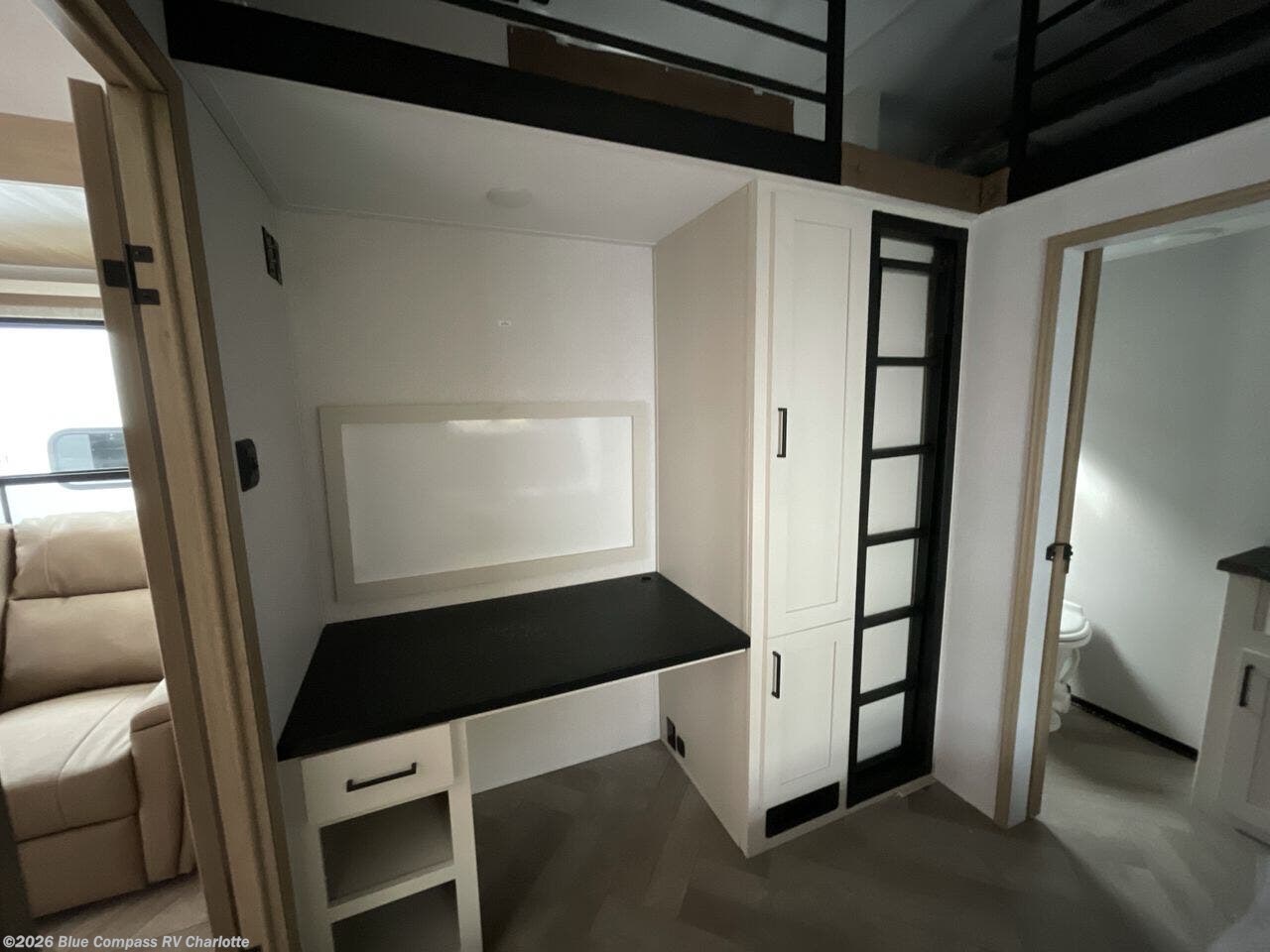 At the front of this fifth wheel, you'll find one of the two bedrooms, featuring a spacious king bed with convenient storage underneath, perfect for extra bedding or travel gear. This room also includes a dresser and a full wardrobe, providing plenty of space for clothes. Just next to the bedroom is one of the two full bathrooms, equipped with a shower, toilet, and a linen closet to keep all your essentials. The center has the main living area opens up with dual opposing slide-outs, creating a roomy and inviting space to relax or entertain. One slide has the comfortable theater seating and a free-standing dinette, ideal for dining or game nights. Across from this, we have the island, an entertainment center with a fireplace and 50-inch TV, plus a hidden pantry for added storage. The kitchen is fully equipped with a 4-burner range and a 16 cubic ft. refrigerator. At the rear is the second bedroom, with a power tilt queen bed, a built-in desk perfect for remote work or study, and an overhead loft area offering additional sleeping or storage space. This bedroom also includes its own private full bathroom and a separate entry door, providing both convenience and privacy.