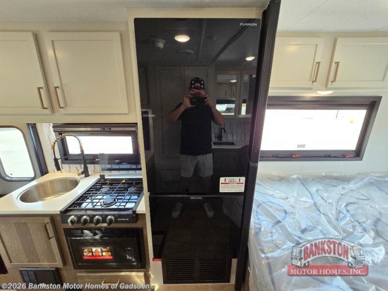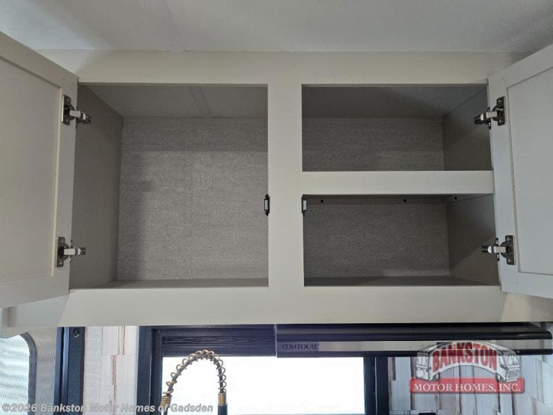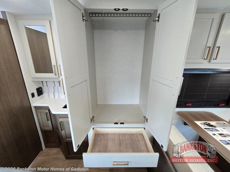 If you're looking for a compact design that still delivers smart storage and flexible living space, this is the one! The efficient layout makes it easy to travel comfortably while keeping everything organized and within reach for weekend trips or longer adventures. You’ll appreciate the convenient pantry/wardrobe near the bedroom, giving you a dedicated place for food storage and clothing without sacrificing floor space. Up front, the spacious 60" x 80" bunk provides extra sleeping room for guests or a cozy lounge area during the day. In the kitchen, a clever flip up top adds valuable prep space when needed and tucks away to keep the walkway open. To round things out, the built-in radio offers simple entertainment whether you're relaxing inside or winding down after a day on the road.